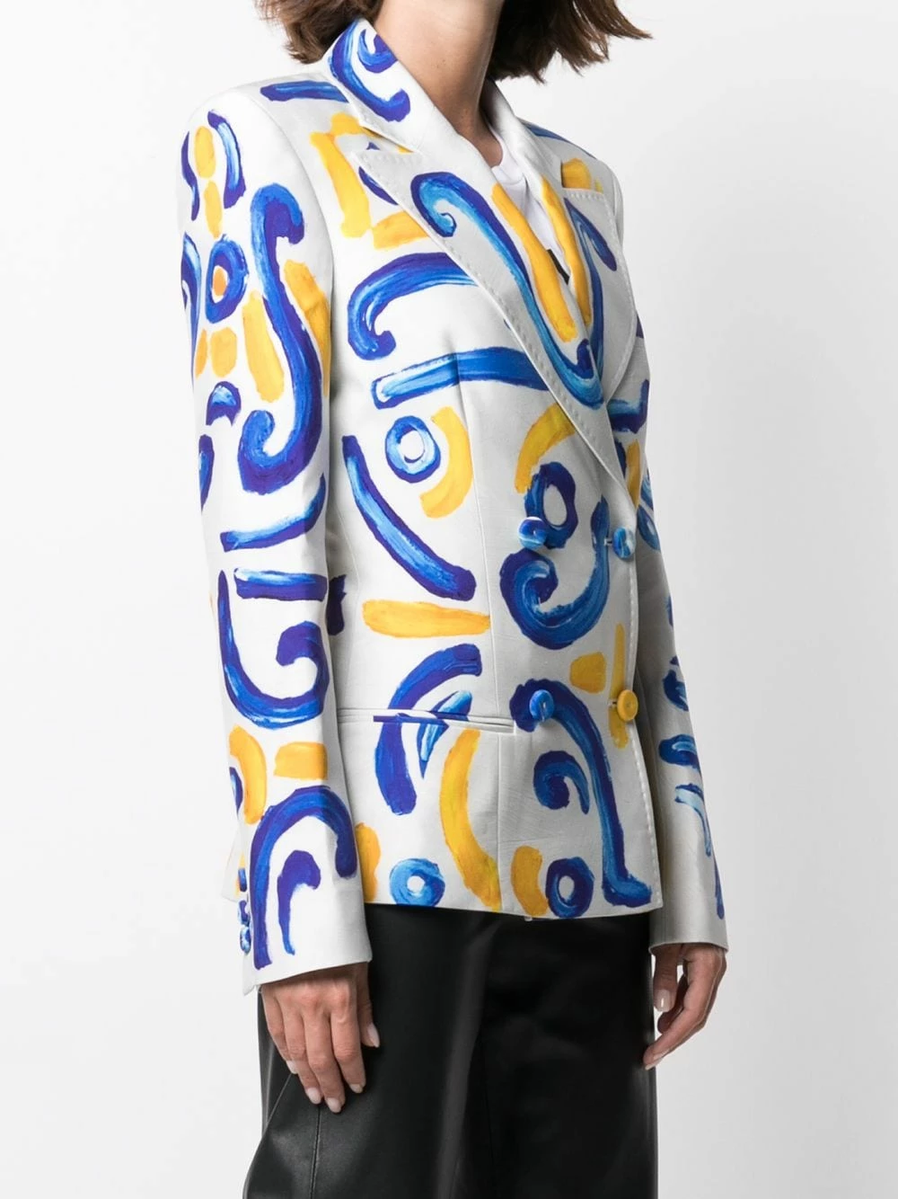 Moschino’s blazer isn’t for the faint of heart. Guaranteed to steal the spotlight, this sleek double-breasted style is decorated with a summery tile-print pattern. Power suiting done right.