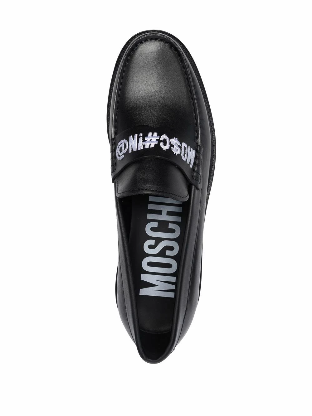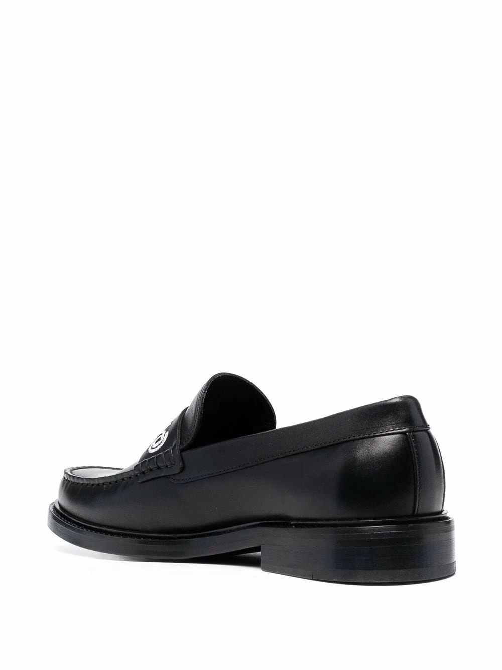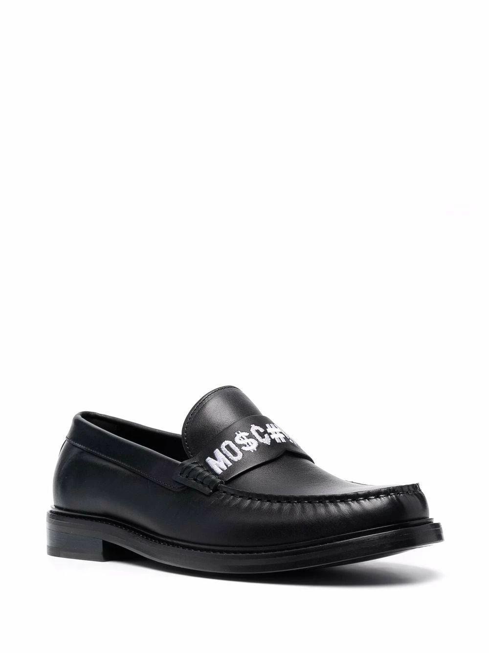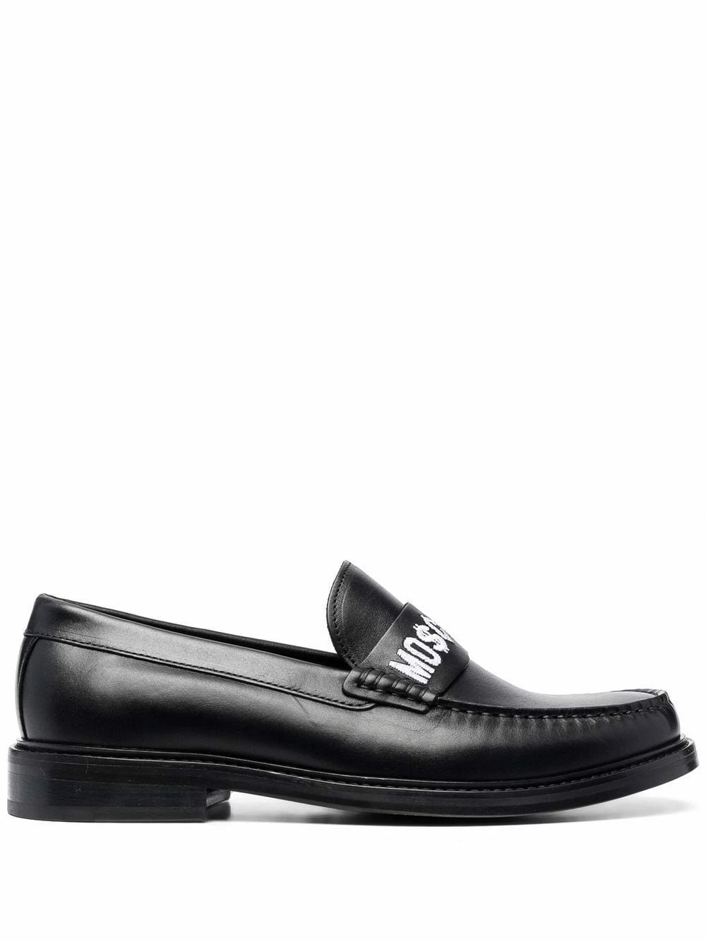 Moschino’s loafers showcase the brand’s love of logomania. Made from supple black leather, this almond-toe pair is accented with the brand’s signature across the front in contrasting white letters.