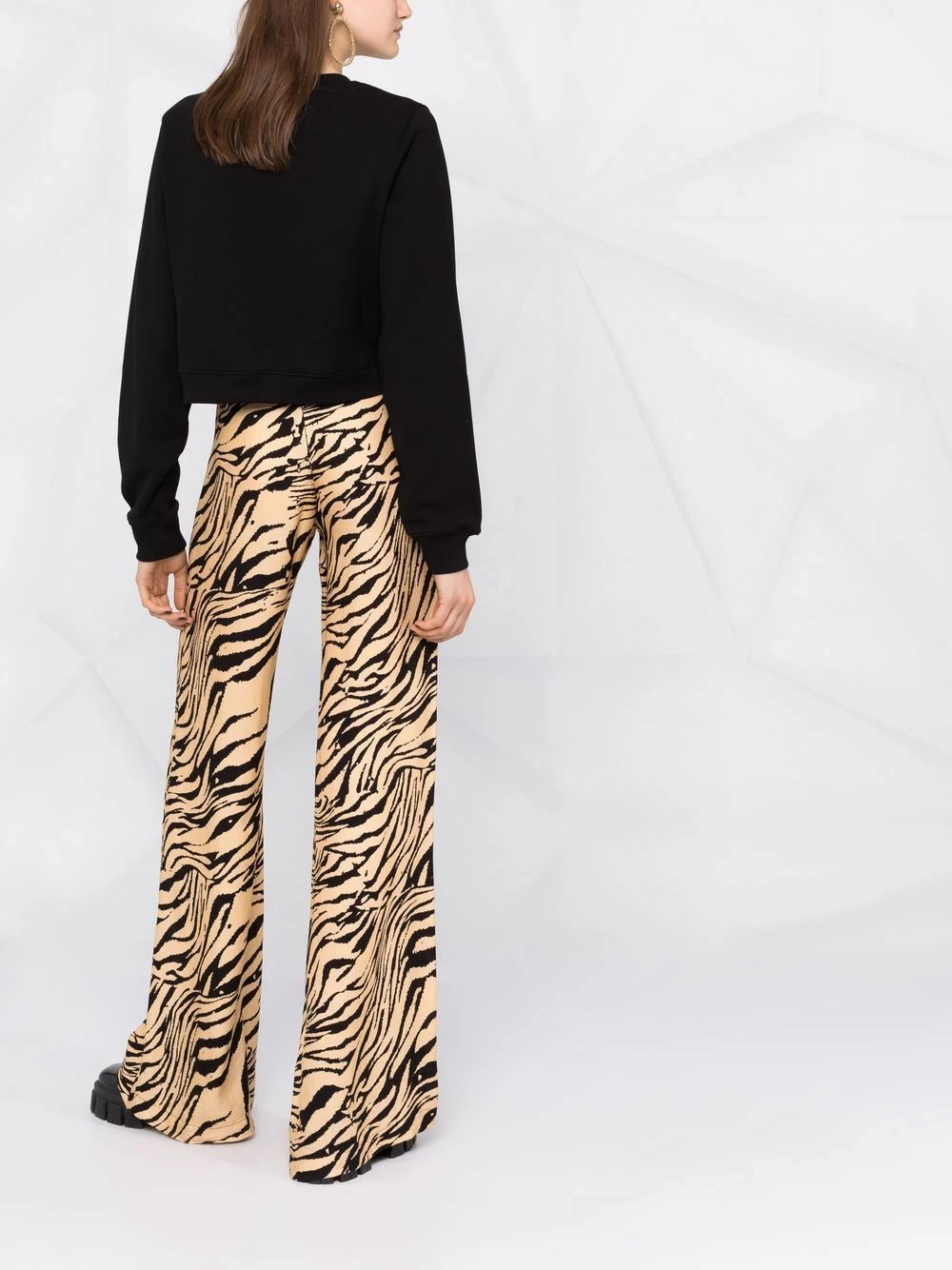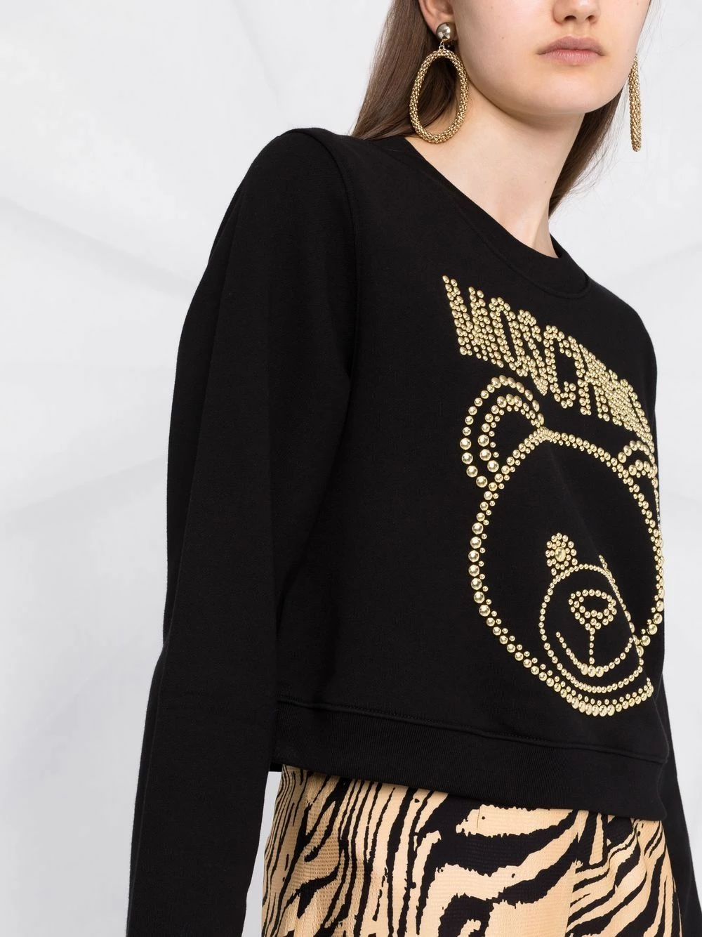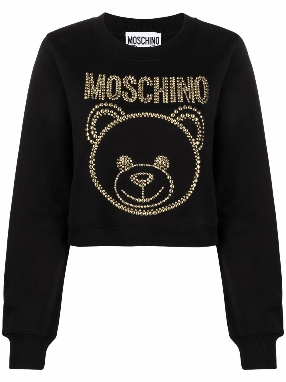 Moschino’s sweatshirt pays homage to the brand’s iconic Teddy Bear motif. This cropped iteration is embellished with scores of crystals depicting the playful emblem.