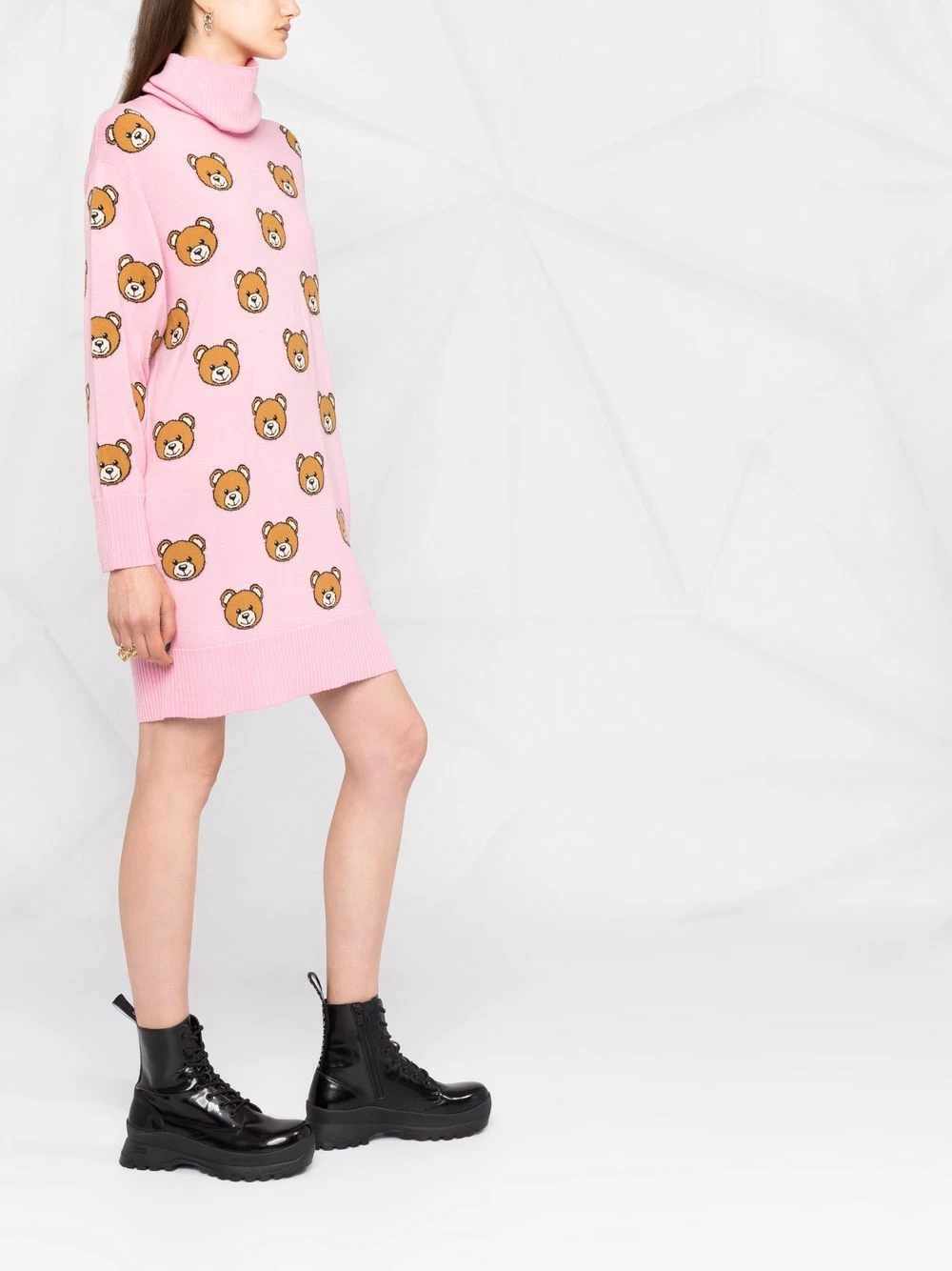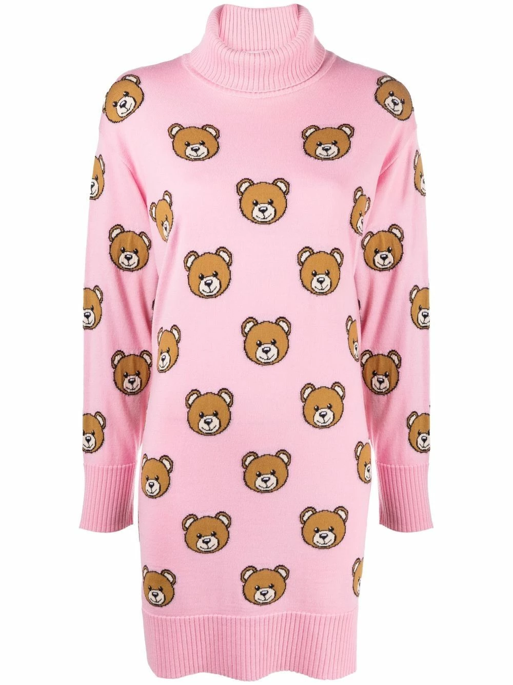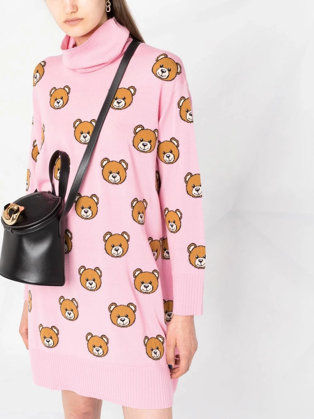 Moschino’s knitted dress is a testament to the brand’s playful sensibility. This baby-pink roll-neck style is defined by the label’s iconic Teddy Bear that’s intarsia-knitted all over.