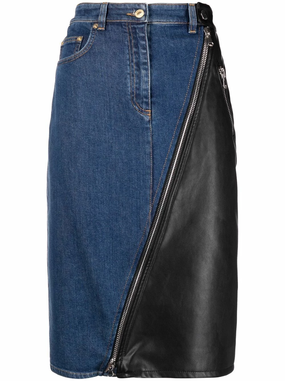 Youโre all for defying the norm, and so is Moschino. In an asymmetric silhouette, this design adds an unexpected twist to your classic denim skirt silhouette. Rule-breaking style.