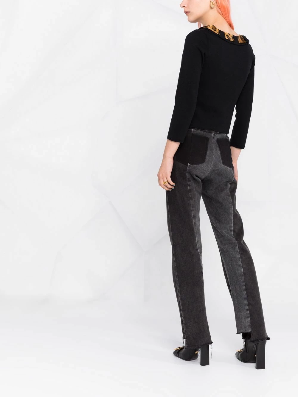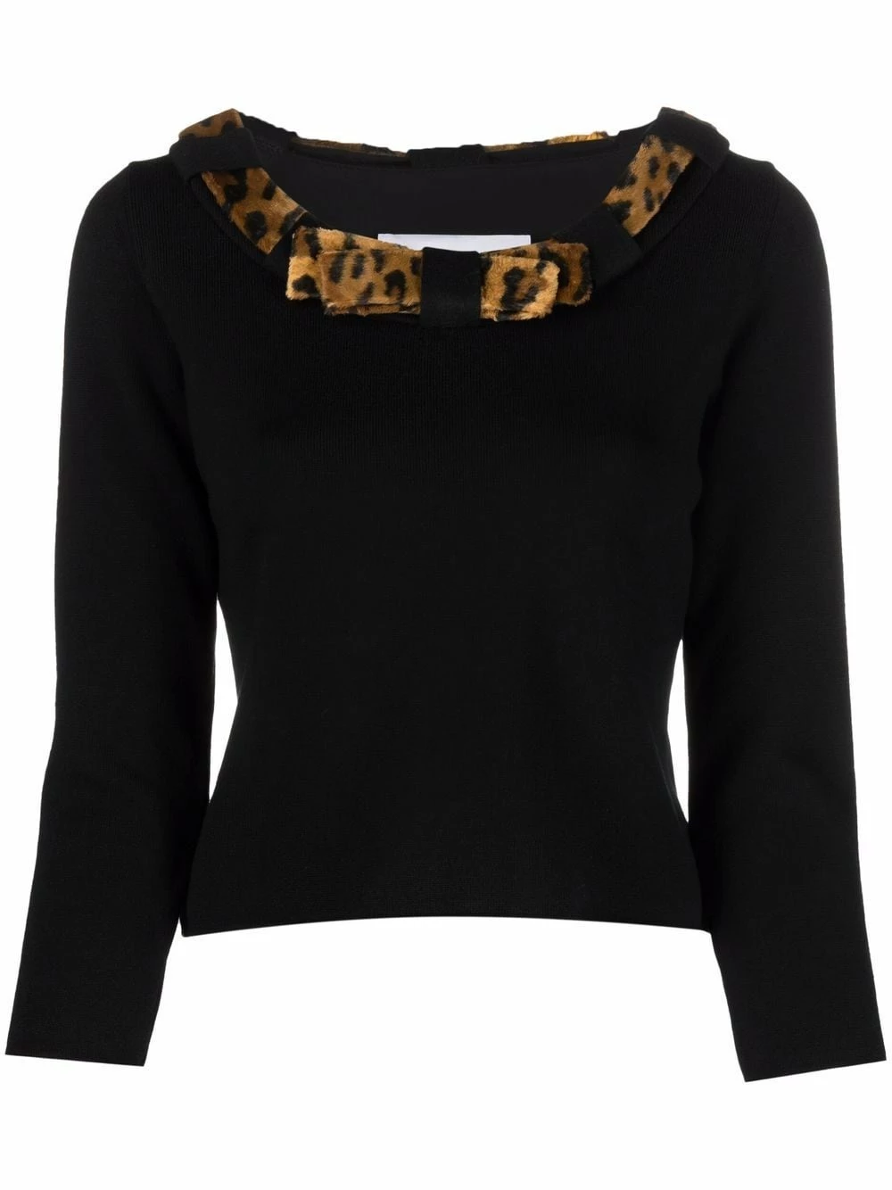 Moschino’s knitted top is a testament to the brand’s playful sensibility. A striking leopard-print velvet trim and bow decorate this otherwise understated style.