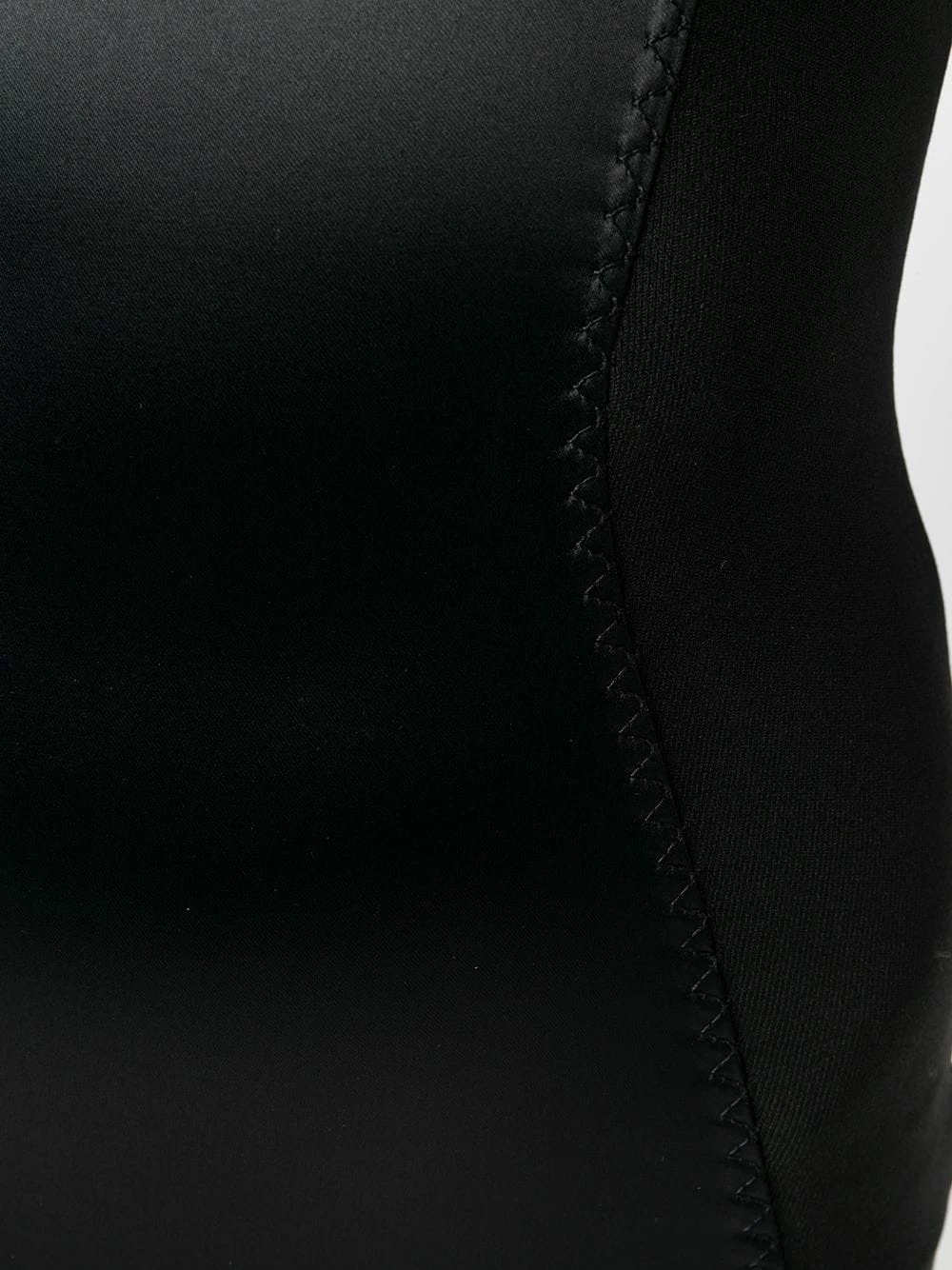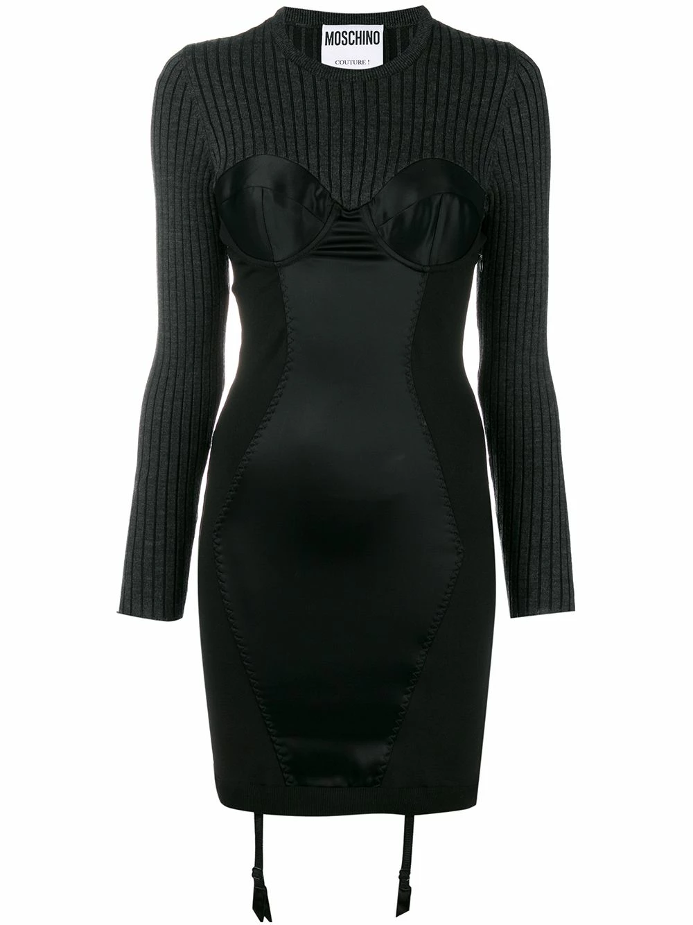 Black virgin wool blend knit fitted dress from Moschino featuring a round neck, long sleeves, a short length and a corset waistband.