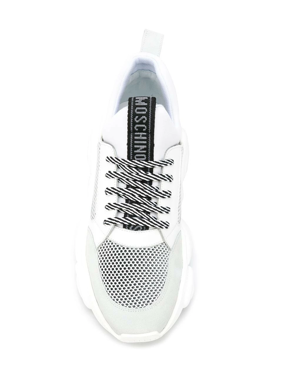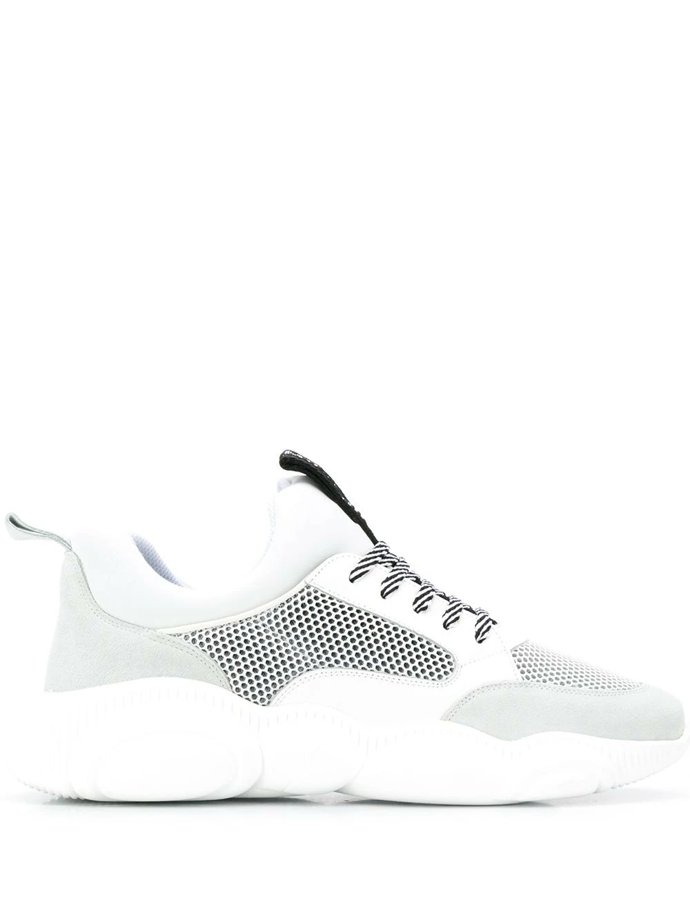 Hit the ground running. When you lace up the front of these white and light grey mesh sneakers from Moschino, you’ll soon realise that the chunky sole is here to propel you forward with each step you take. Run fast! Featuring a lace-up front fastening, a pull tab at the rear, a logo patch at the tongue, mesh panels, leather panels and a chunky rubber sole.