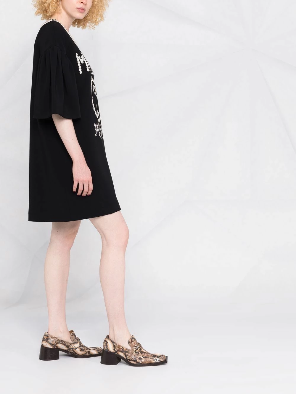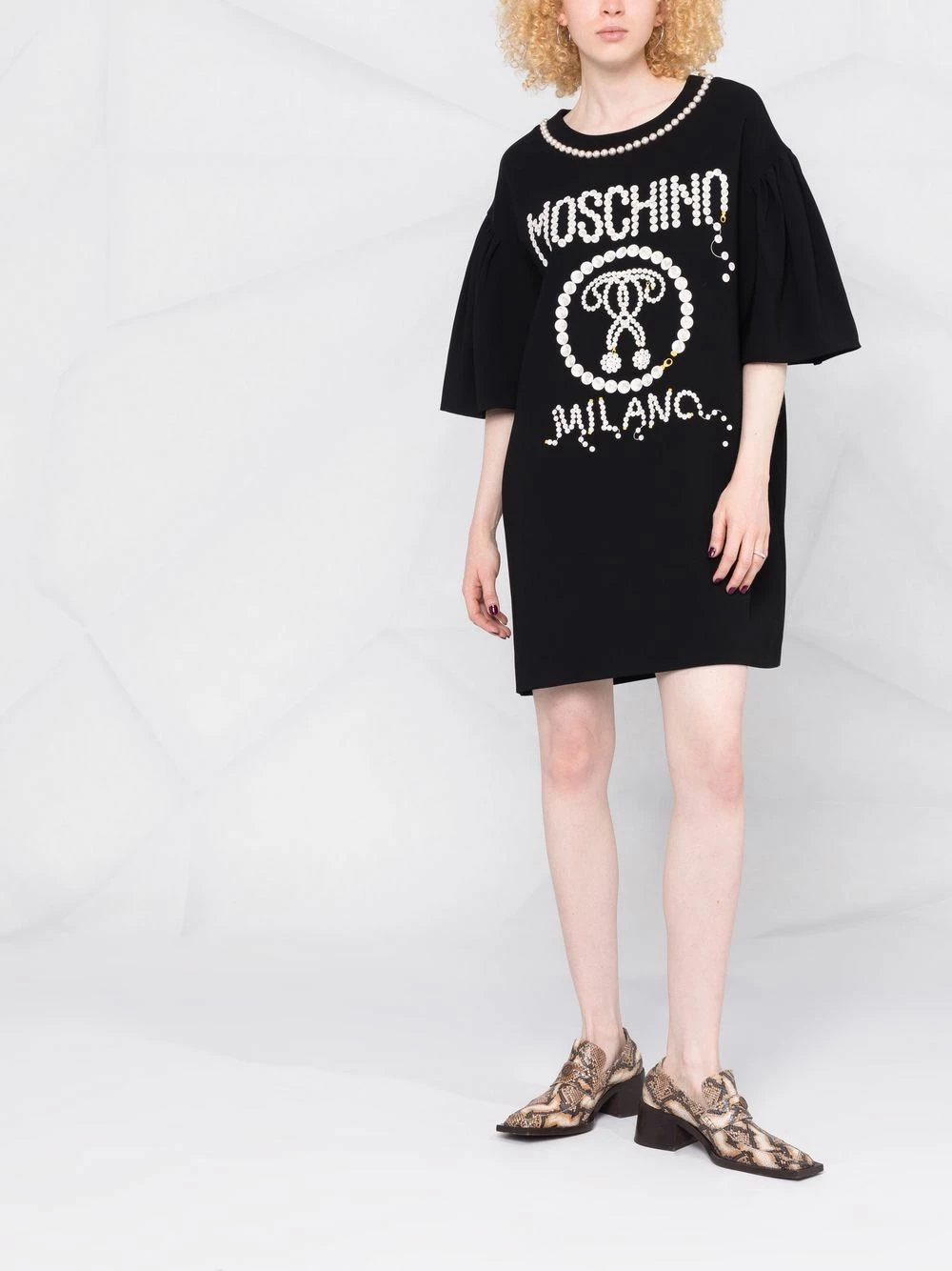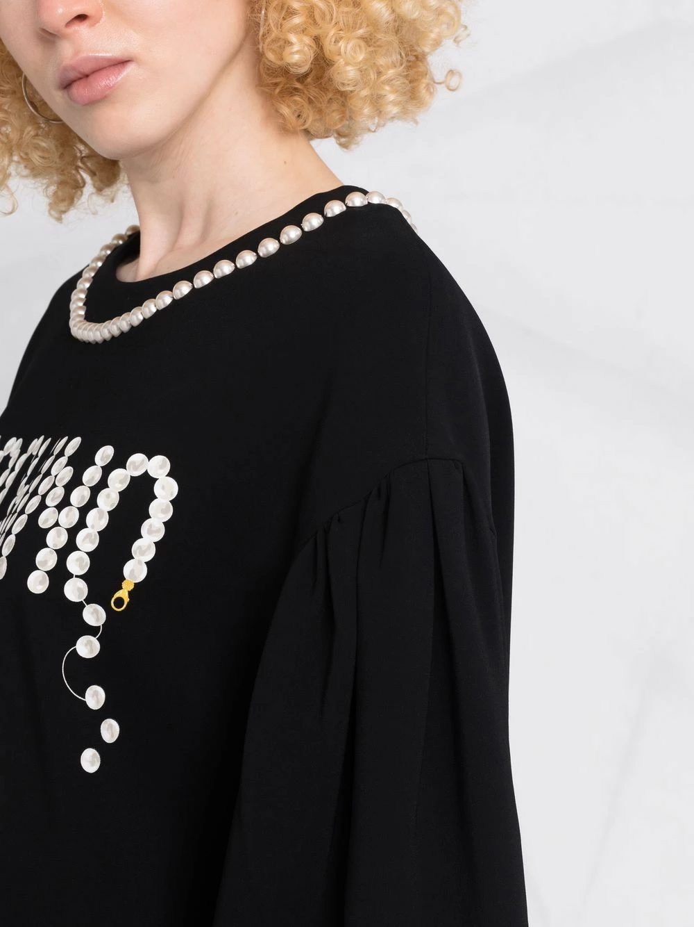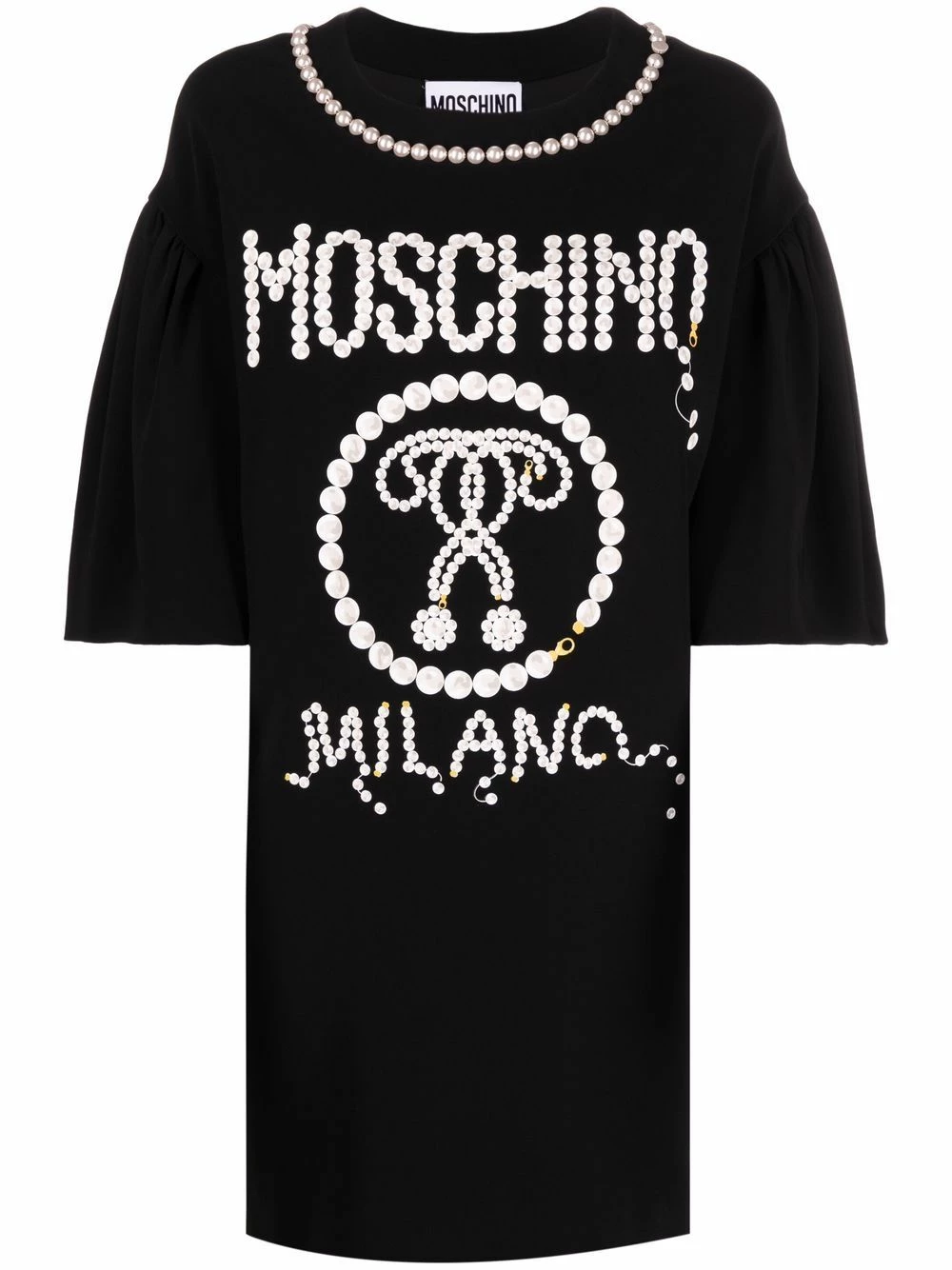 Somewhere between casual and elegant is this T-shirt dress from Moschino. Crafted in black, the laid-back design is decorated with the signature Double Question Mark logo and adorned with faux-pearl embellishments for a refined touch.