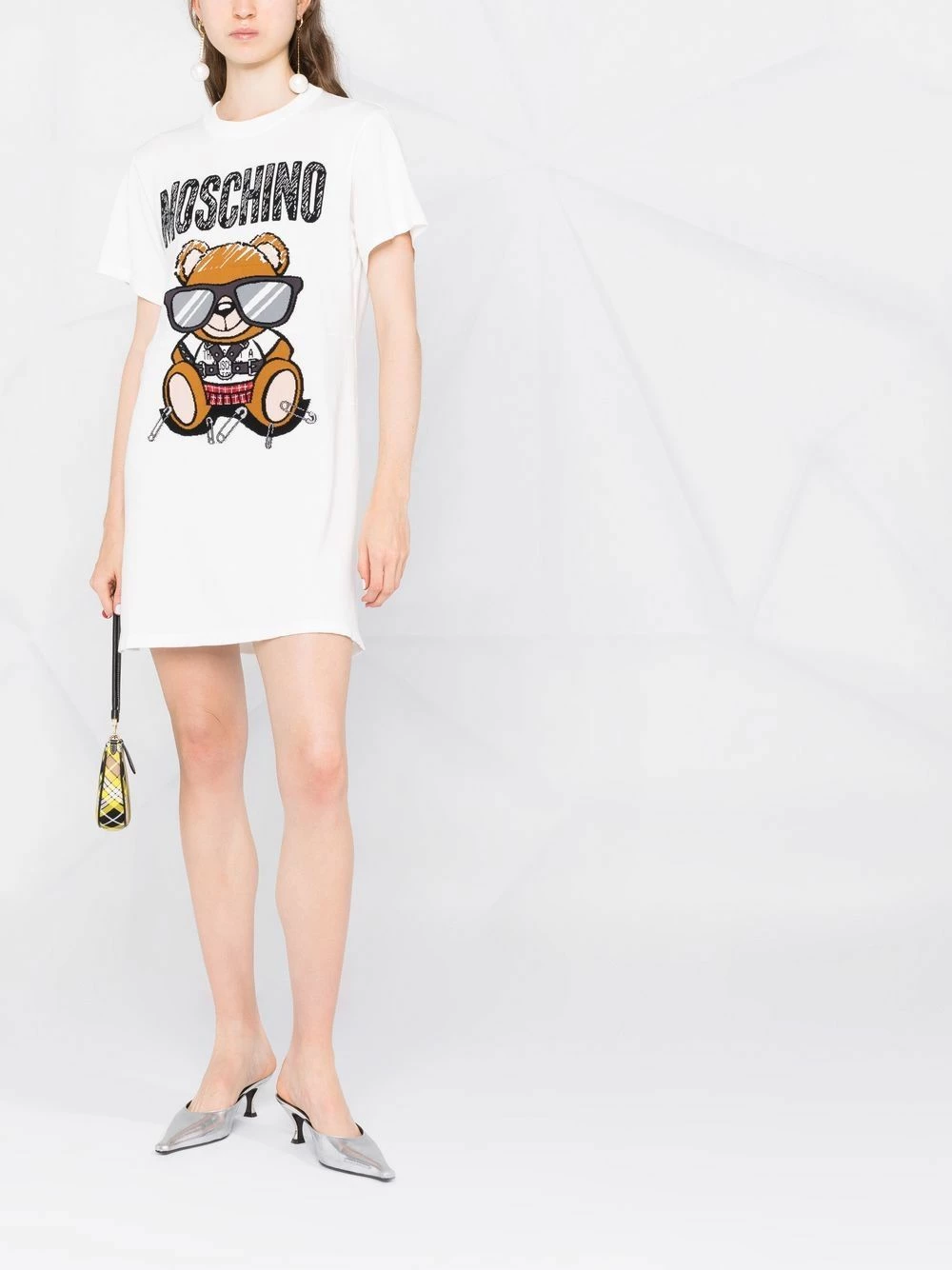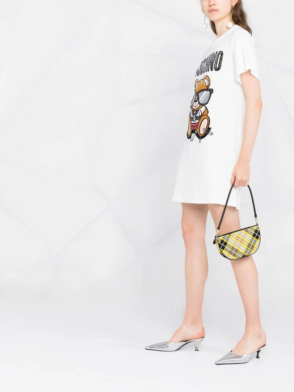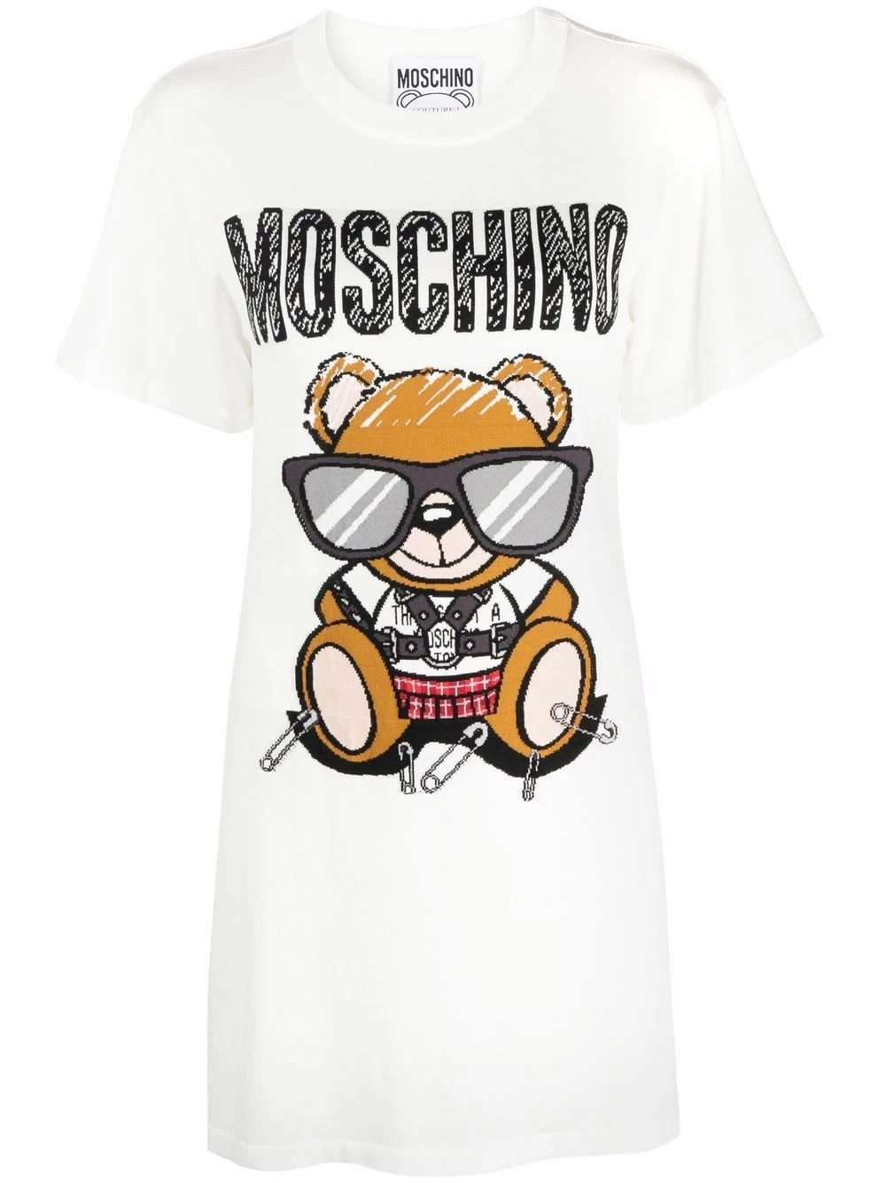 Moschino’s iconic bear motif takes on a punk-inspired style at the front of this short-sleeved cotton dress. This showcases the brand’s playful approach to streetwear style, with the intarsia logo above it adding to the bold look.