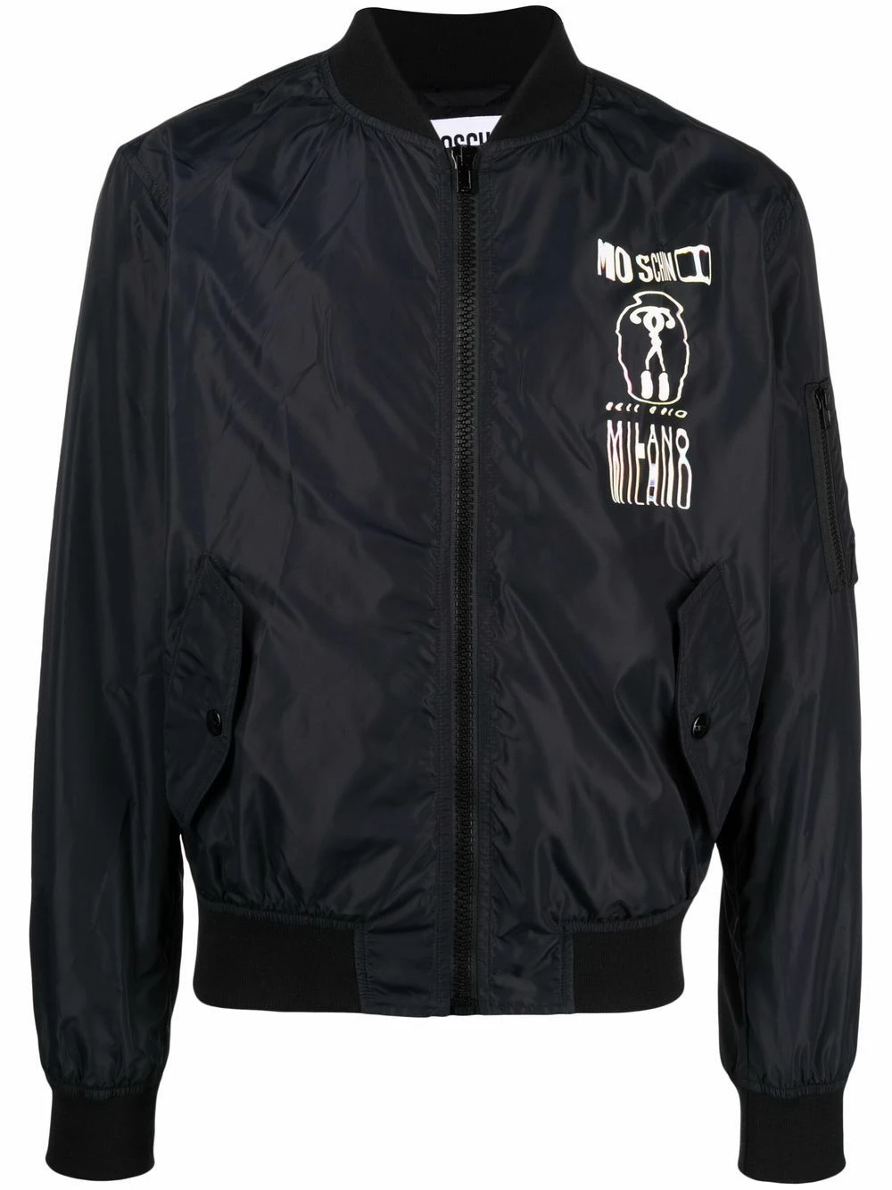 The American fashion designer Jeremy Scott once said that ‘for an artist, itโs important to challenge yourself creatively’ – and that’s exactly what he has done in the new Moschino collection. This black bomber jacket is decorated with a Moschino Milano logo and a glitch effect Artwork print to the rear.