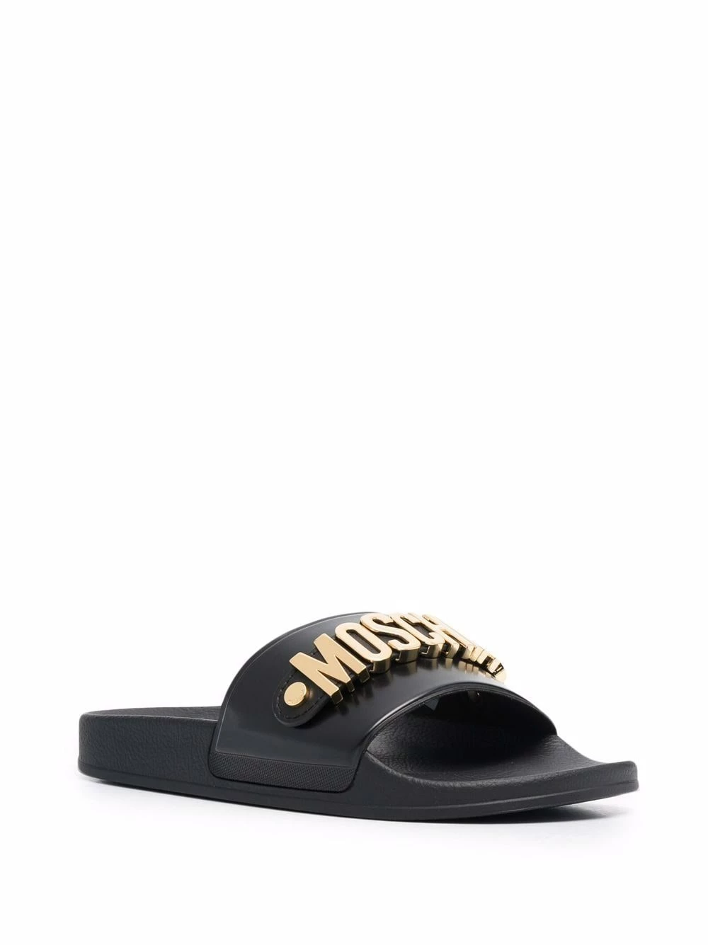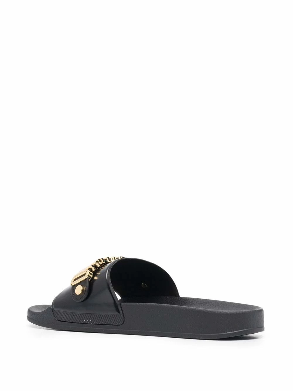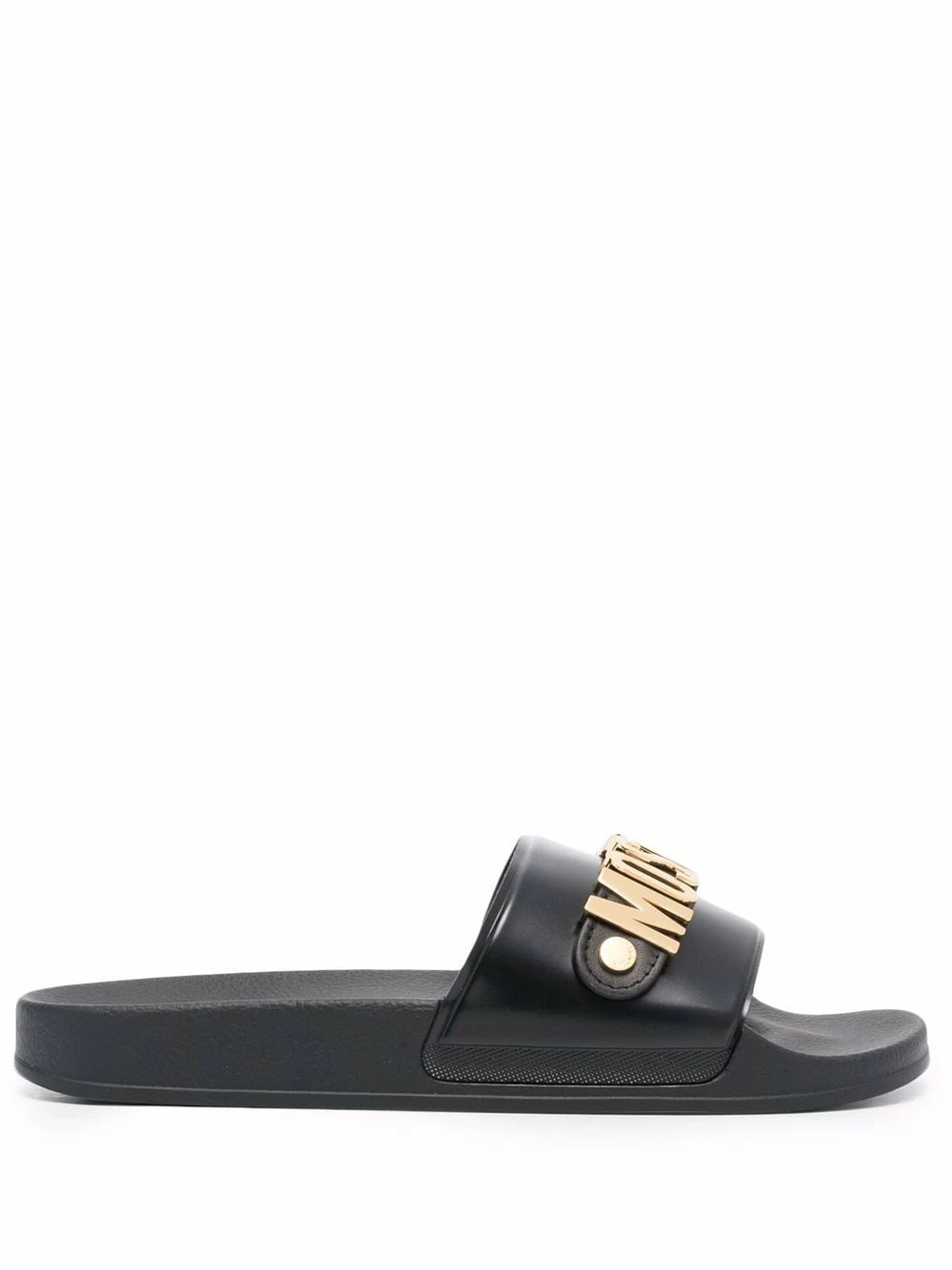 Moschino showcases the brand’s bold style with an eye-catching logo plaque at the front of these slides. Reflecting the brand’s design origins in 1983, opulence is brought to the design in its gold-tone hardware, whilst its placement across the entire width showcases the label’s distinctive sense of irony.