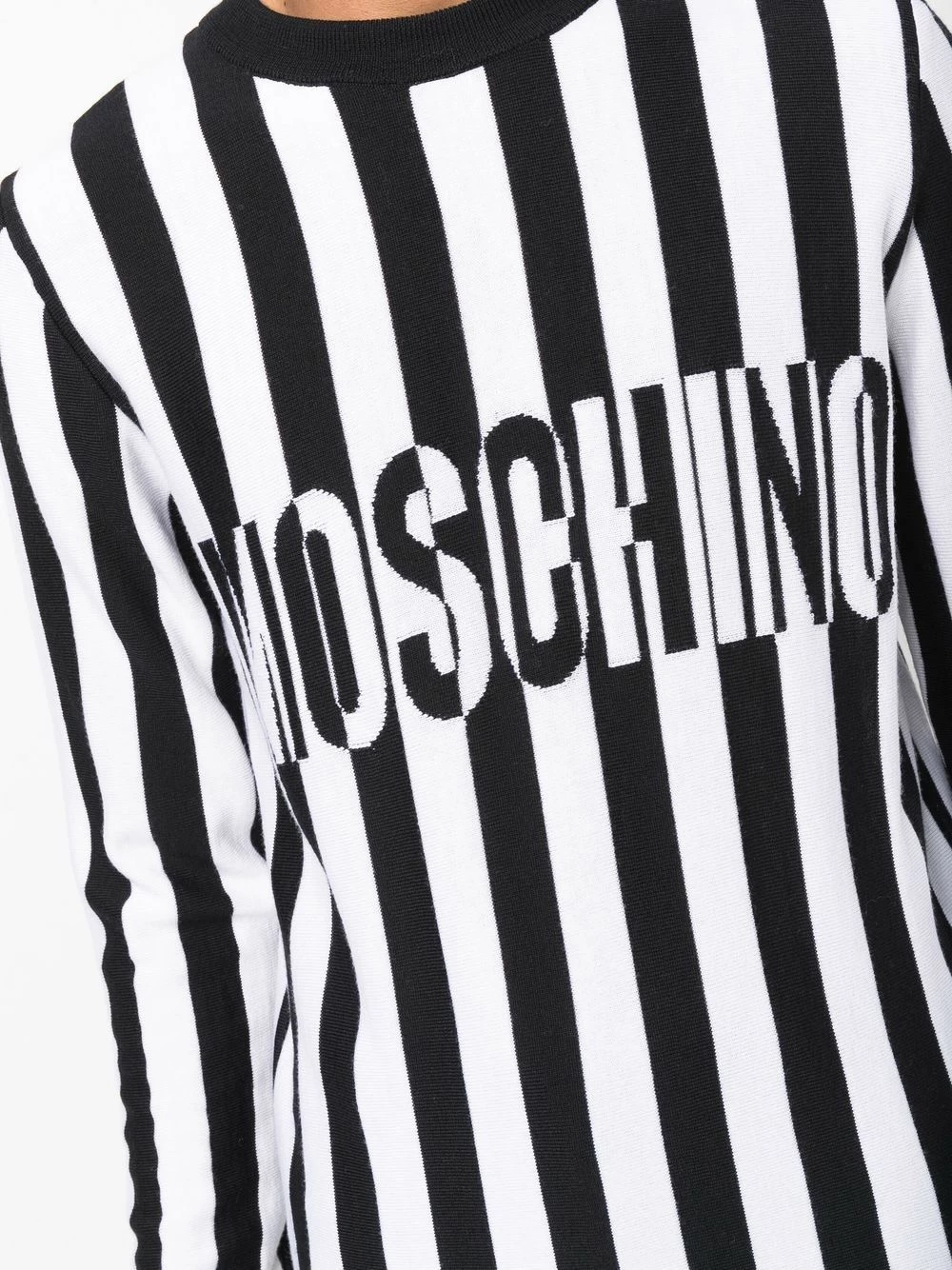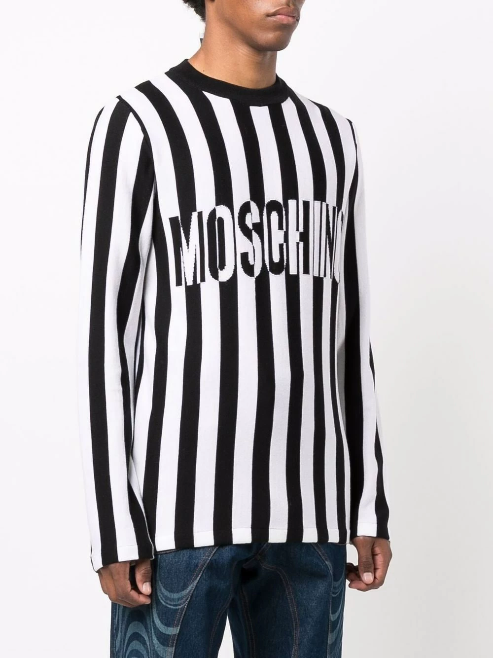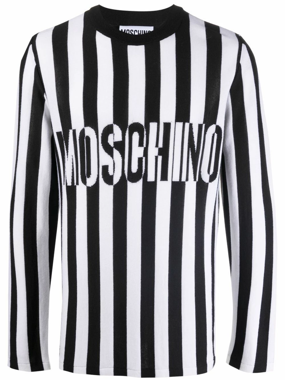 Moschino’s optical illusion knitted jumper is crafted from soft virgin wool as part of the label’s AW21 collection.ย