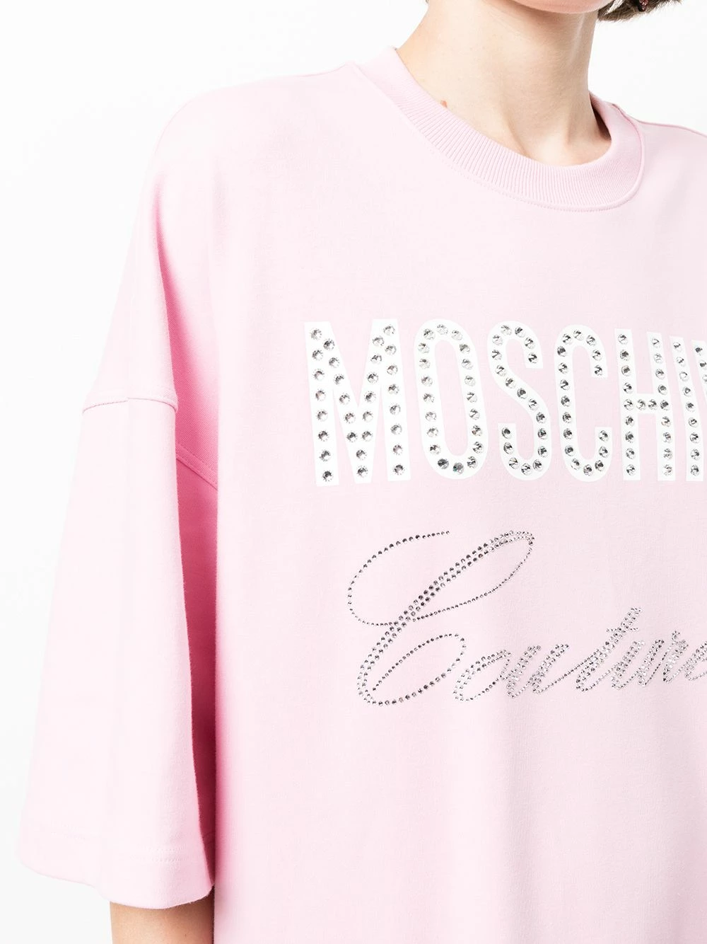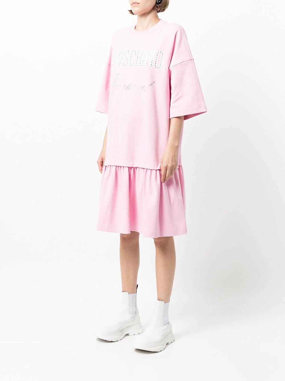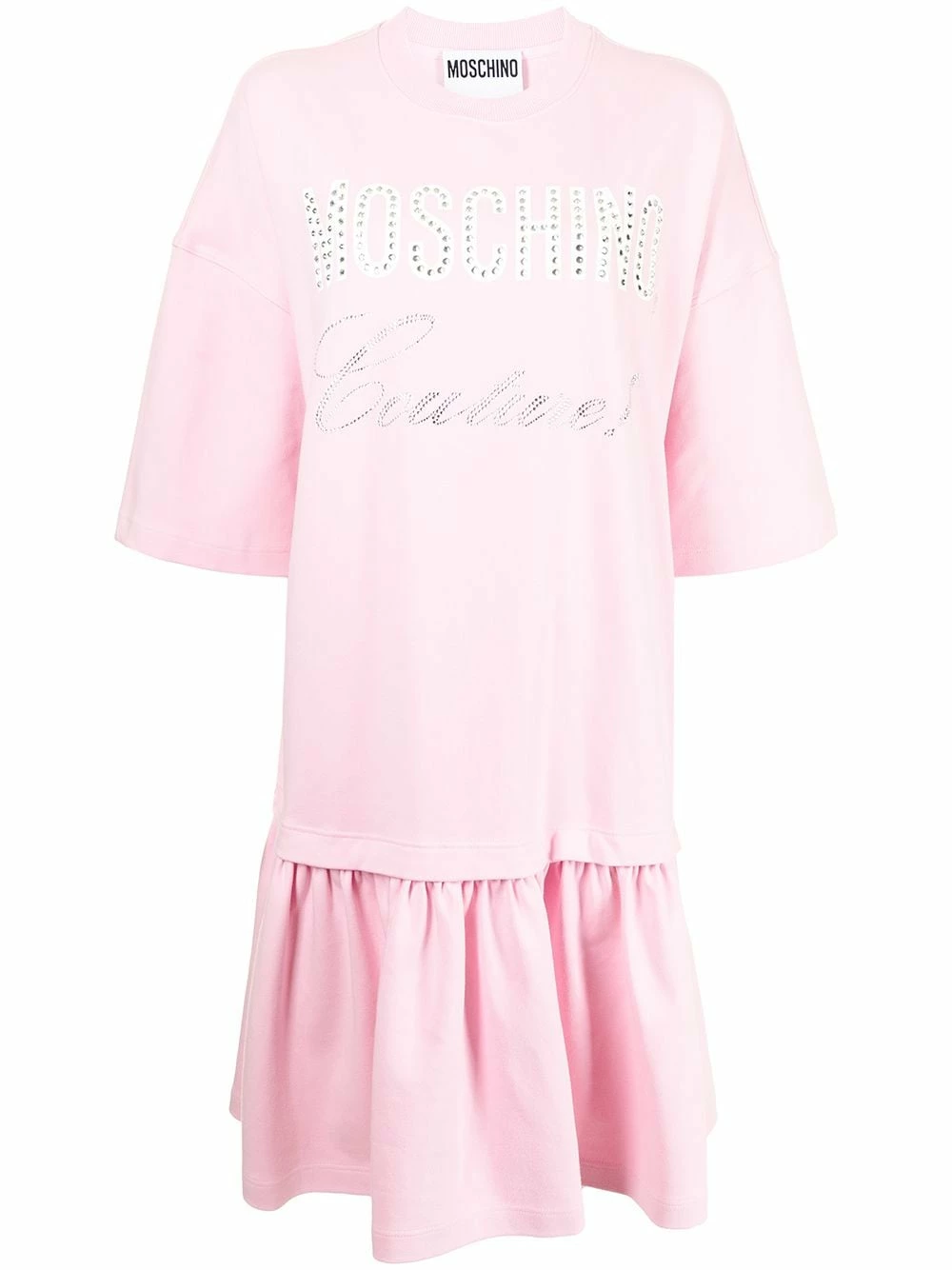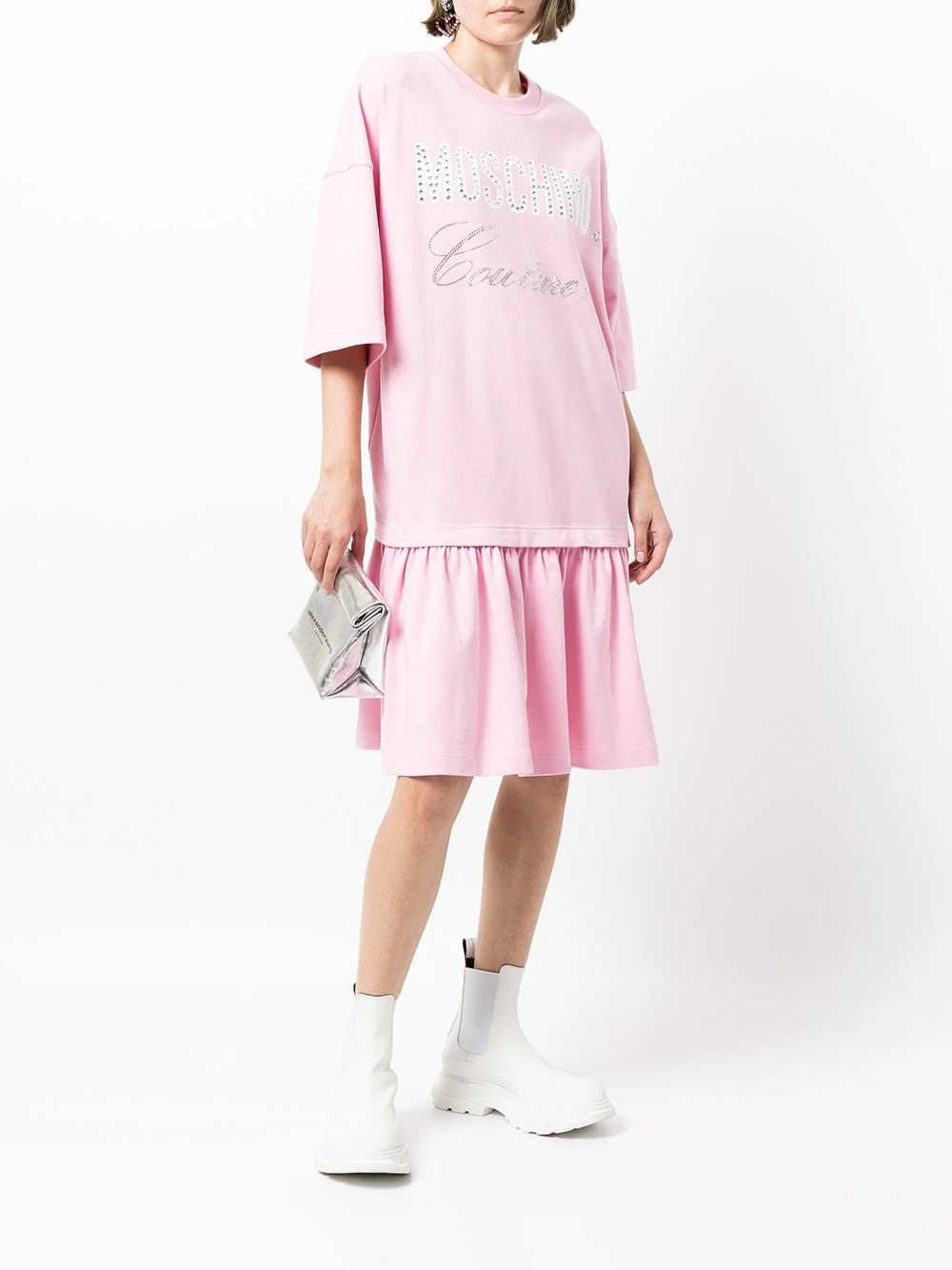 Always favouring a playful approach to fashion, Moschino presents this short-sleeve T-shirt dress. In a fun contradiction, this light pink piece features a drop shoulder and waist, while a silver-tone logo print to the front adds a shiny twist.