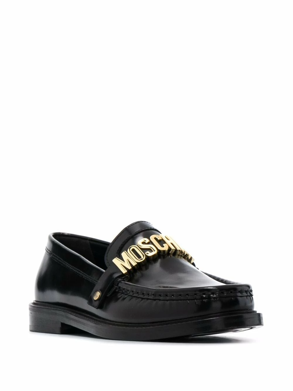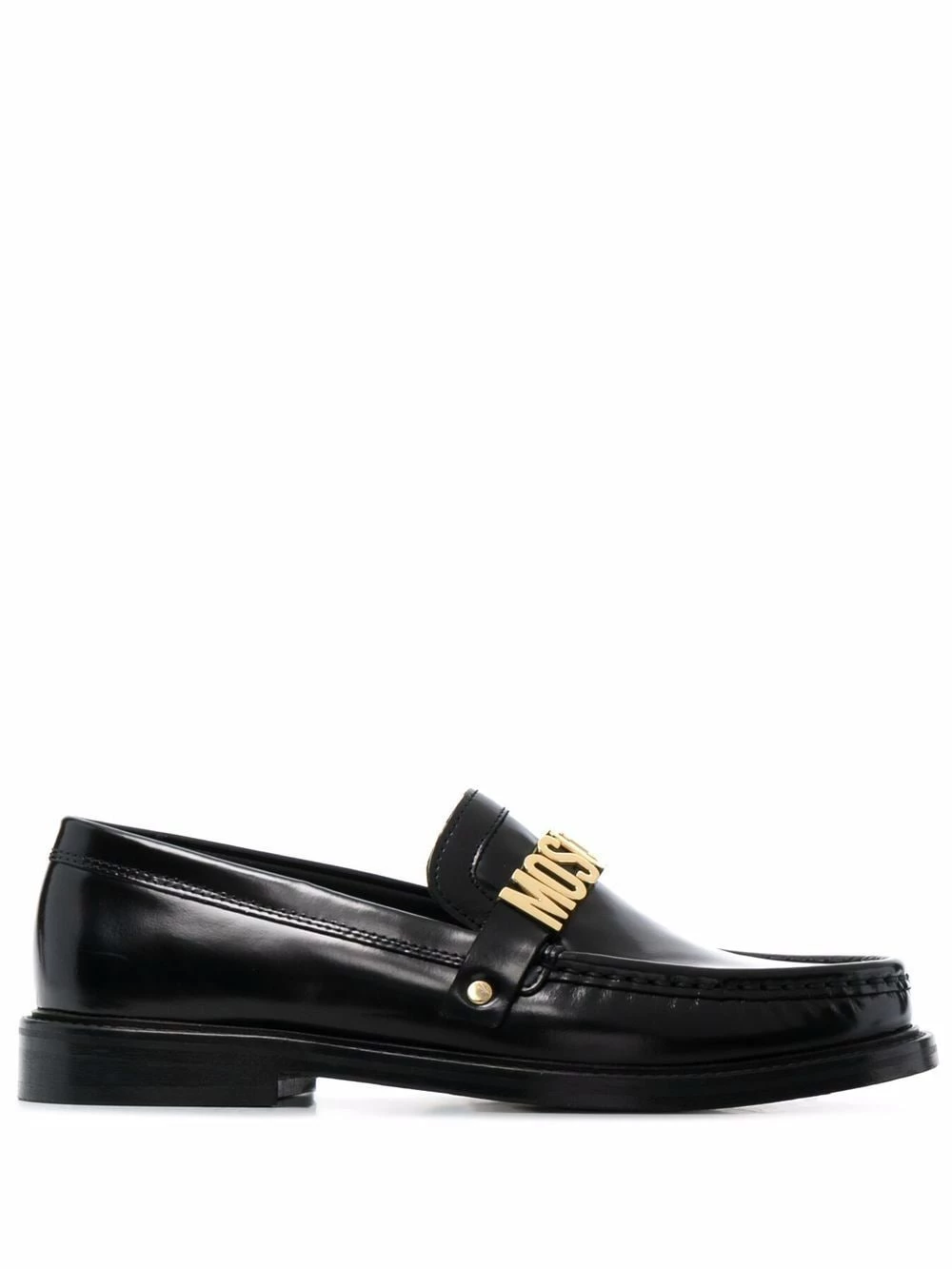 Smooth leather and bold lettering combine to create these branded almond-toe loafers from Moschino. Punctuated with gold-tone logo hardware to the front, these slip-on shoes are a timeless staple to any wardrobe.