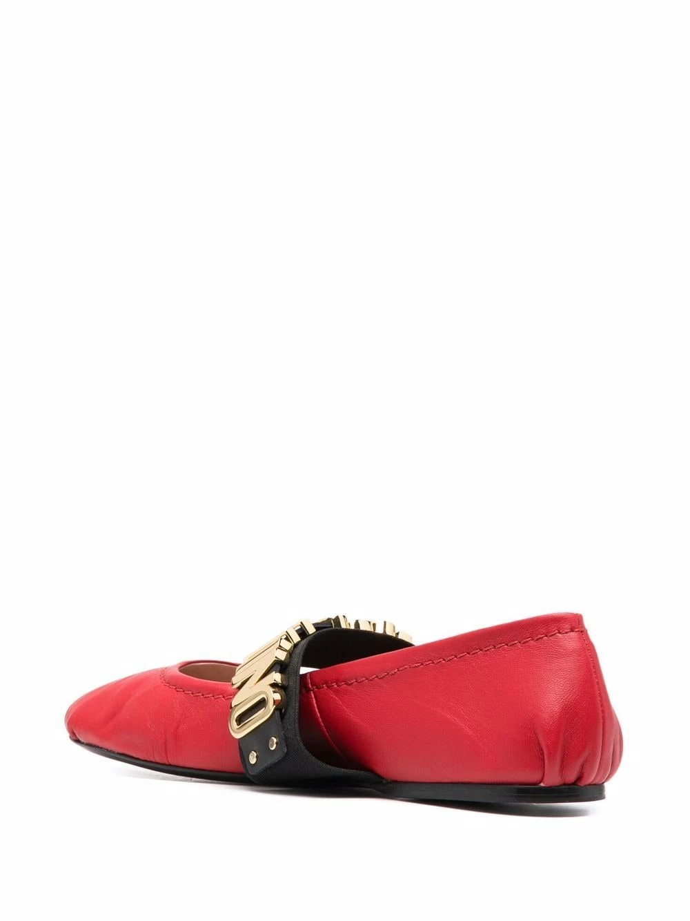 Moschino continues their eye-catching and logo-heavy aesthetic with these ballerina shoes. A classic leather construction is given a contemporary feel thanks to gold-tone lettering on the strap.