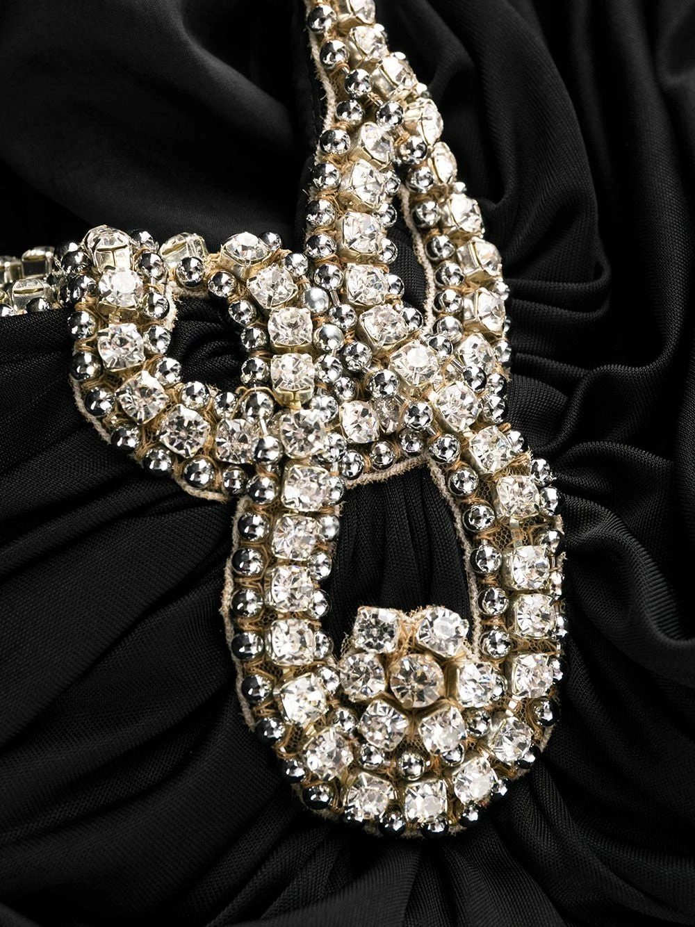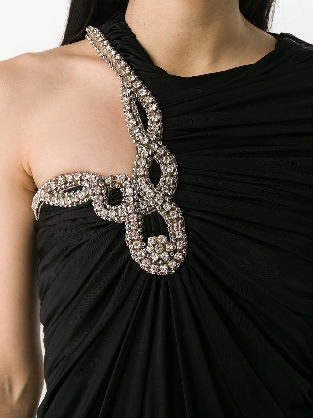 Did someone say party? This black one-shoulder ruched dress from Moschino is detailed with crystal embellishments to the off-shoulder side. A dress with a sparkly accessory in it – put it on and you’re ready to go. Featuring a round neck, a long sleeve, a concealed side zip fastening, a ruched design, an asymmetric style and a short length.