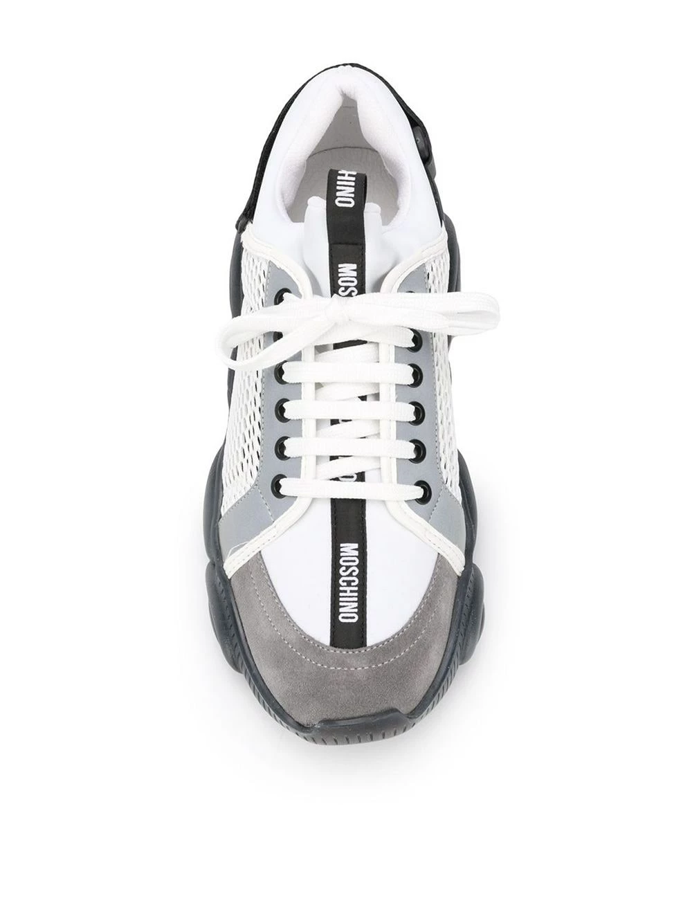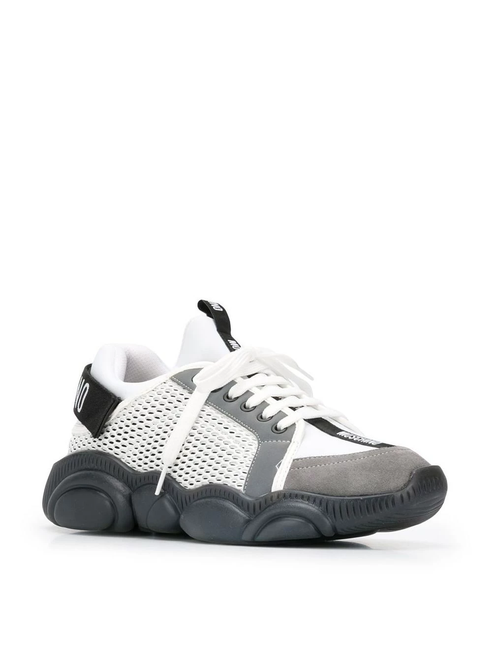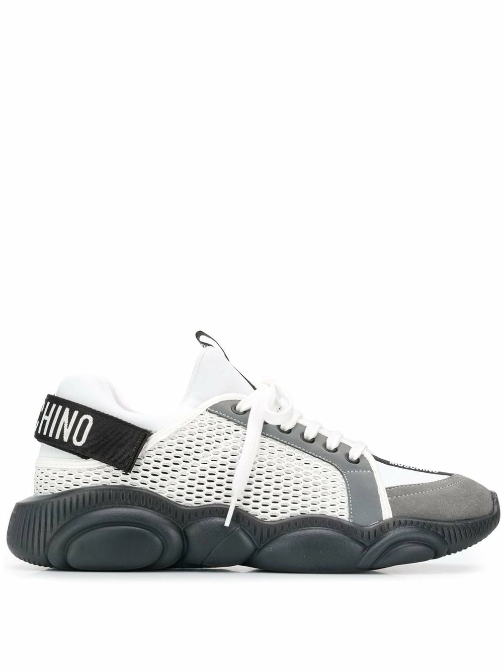 Moschino creates cool pop culture-inspired clothing for the modern streetwear aficionado, such as these white and grey calf leather and mesh panelled sneakers. Featuring a lace-up front fastening, a round toe, a ridged rubber sole and a pull tab at the rear.
