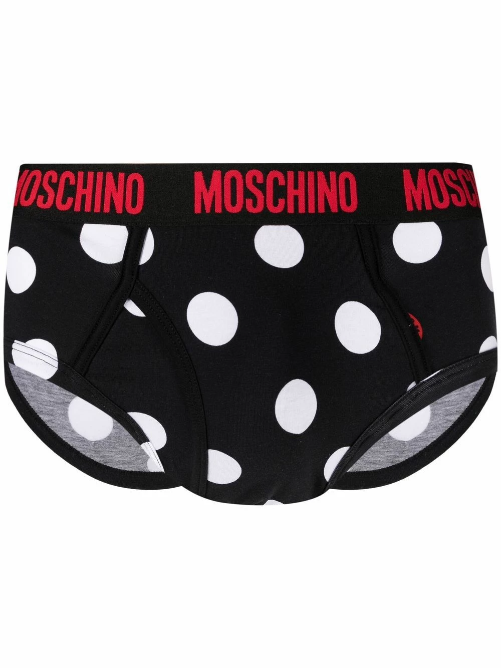 Displaying an all-over monochrome polka dot print and red tone logo lettering at the waistband, these Moschino briefs exhibit the brand’s maximalist style in a comfortable stretch design.ย ย