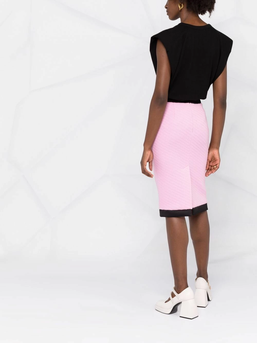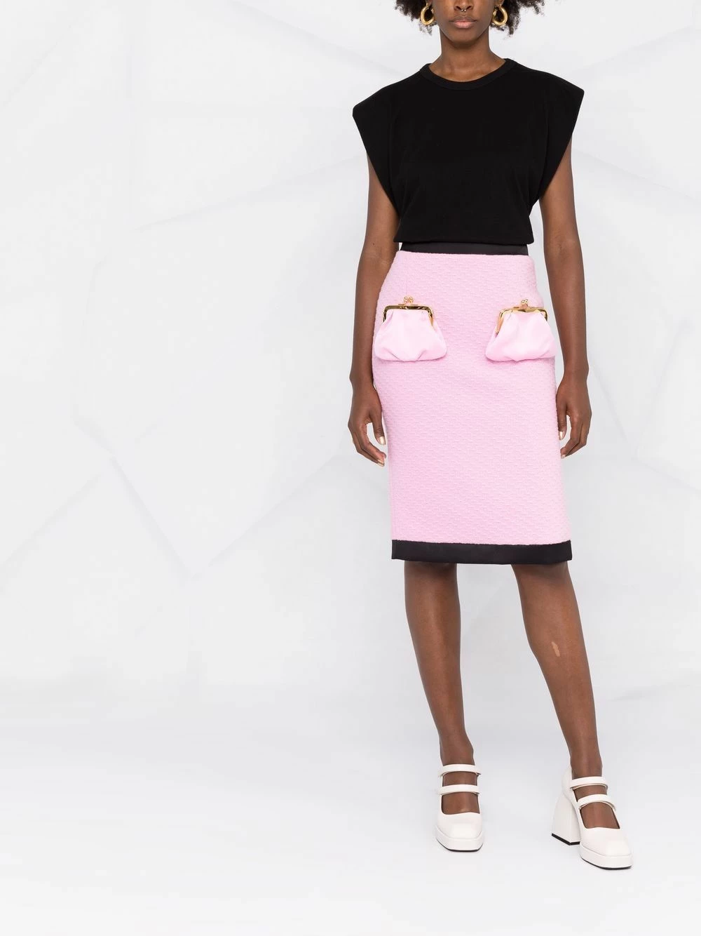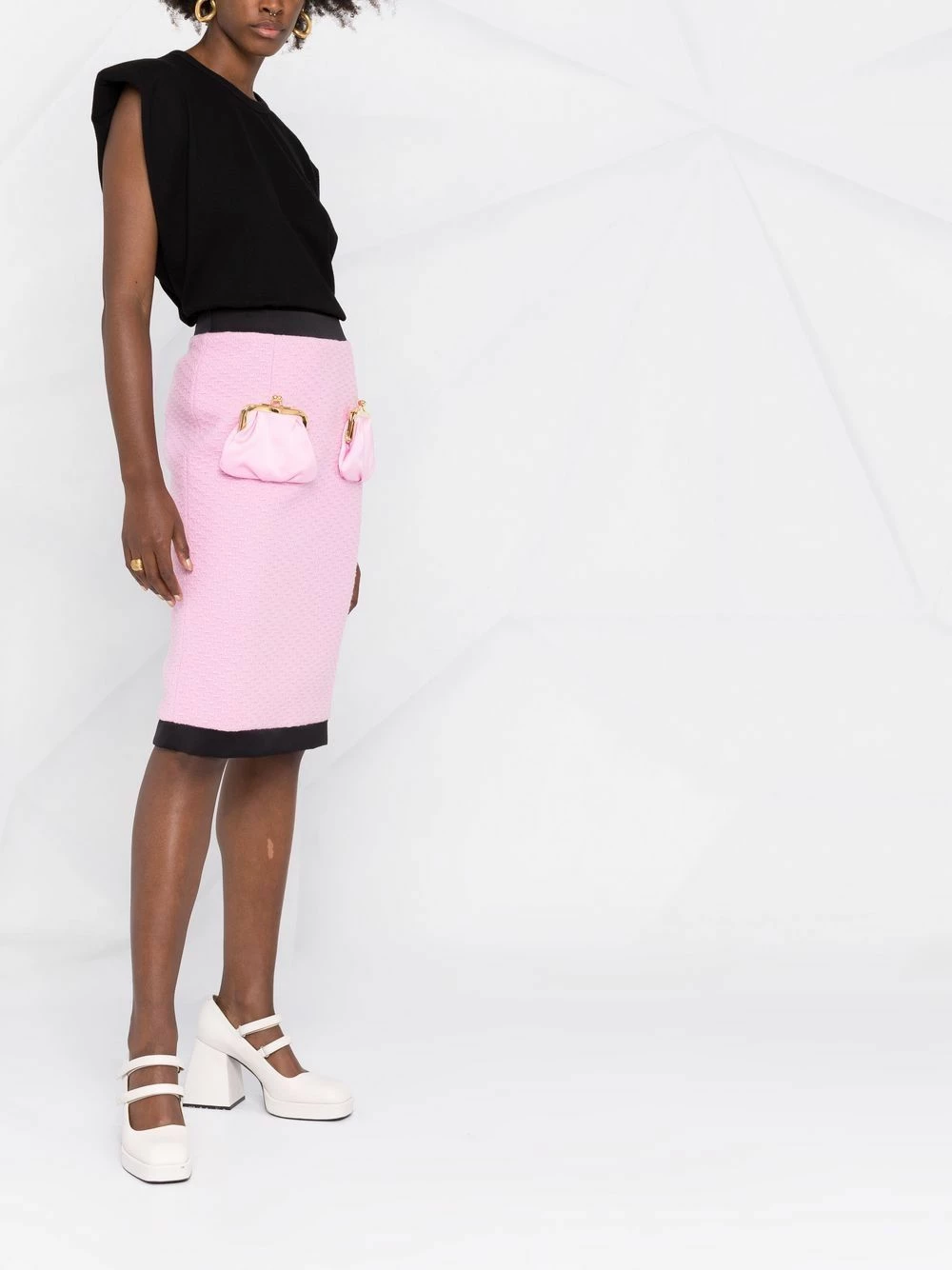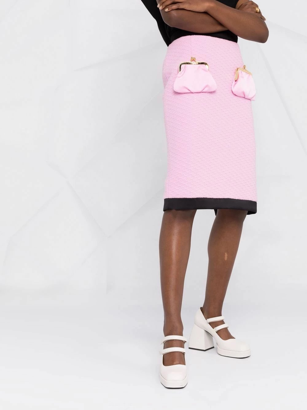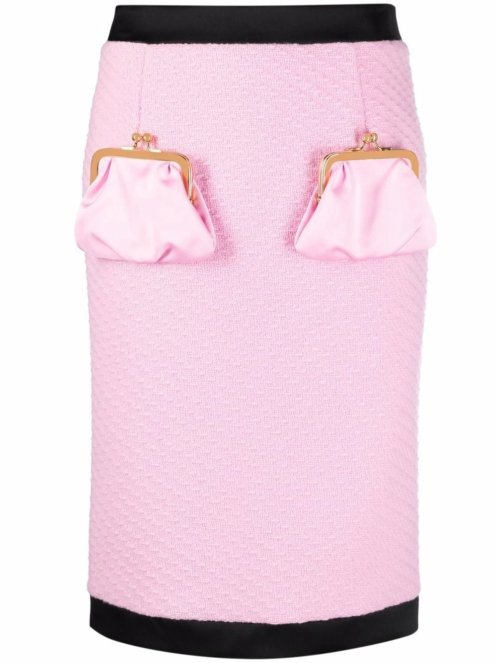 Bubblegum pink virgin wool purse-pocket skirt from MOSCHINO featuring two-tone design, elasticated waistband, mid-length and front purse-shaped pockets.