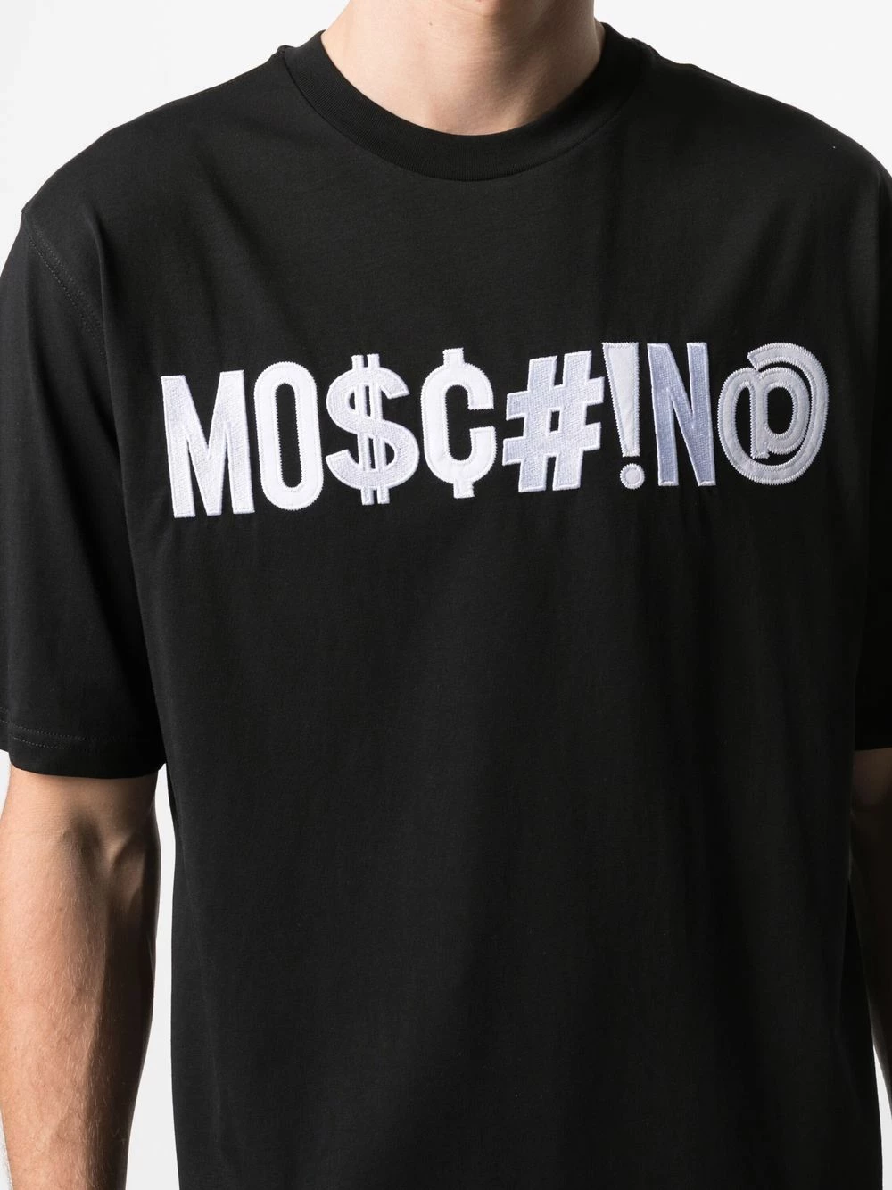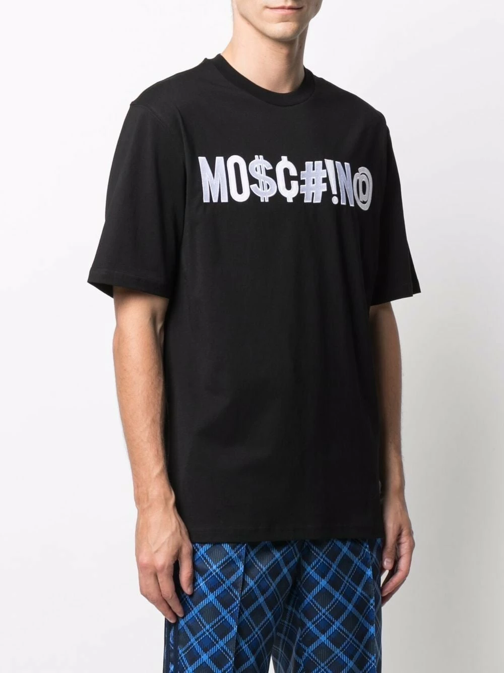 Moschino’s basic T-shirts are back in the new SS21 collection. As per usual, the Italian luxury fashion brand has put together a timeless black design with a special detail on the front: an embroidered logo with symbols.