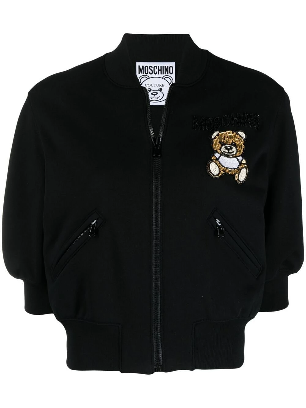 The signature Teddy Bear but make it extra-Moschino. Crafted from cotton, this bomber jacket features the House’s signature motif and logo in a beaded design. Detailing done right.