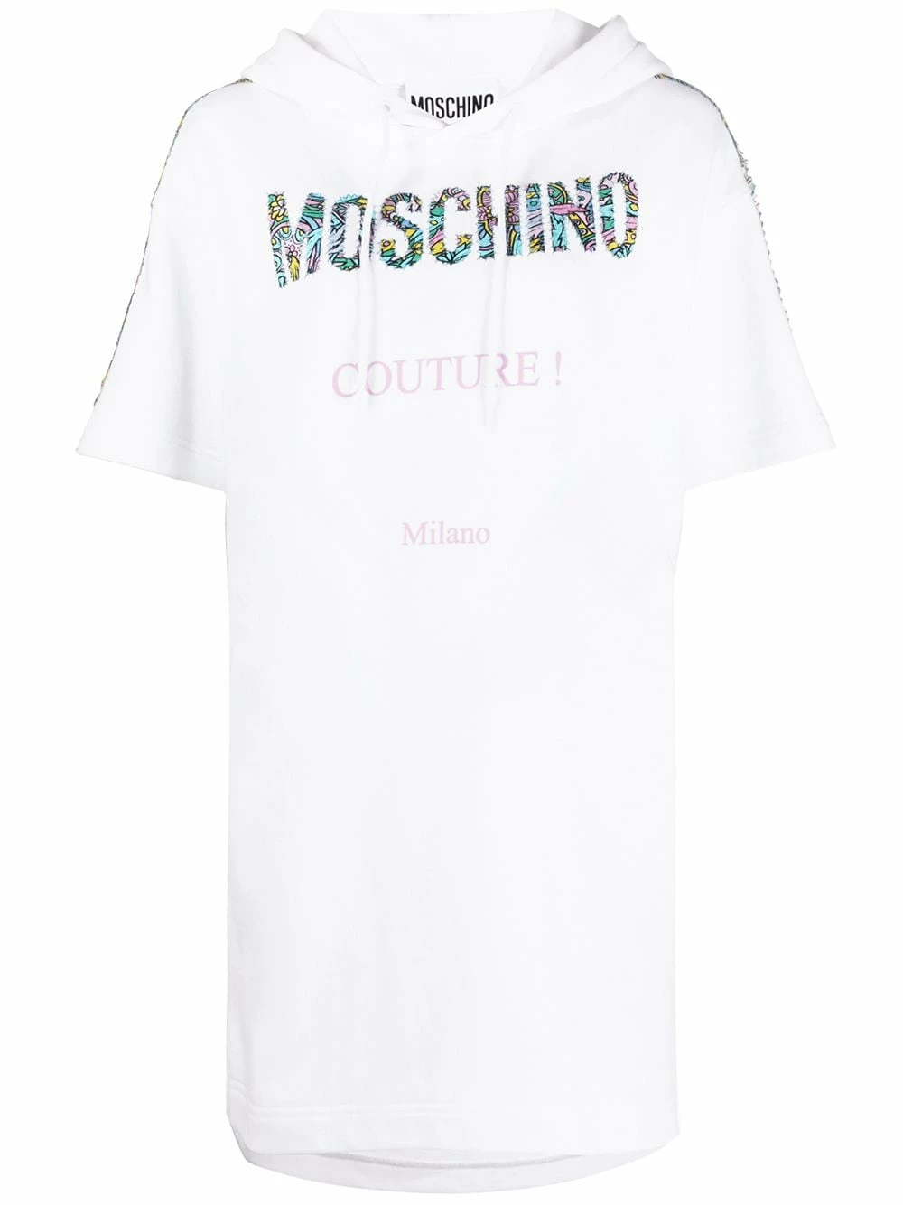 Wake up and smell the roses. Flower power is back by the looks of this hooded mini dress by Moschino, decorated with a floral logo print and matching appliquรฉ detailing at the sleeves. Effortlessly cool style.
