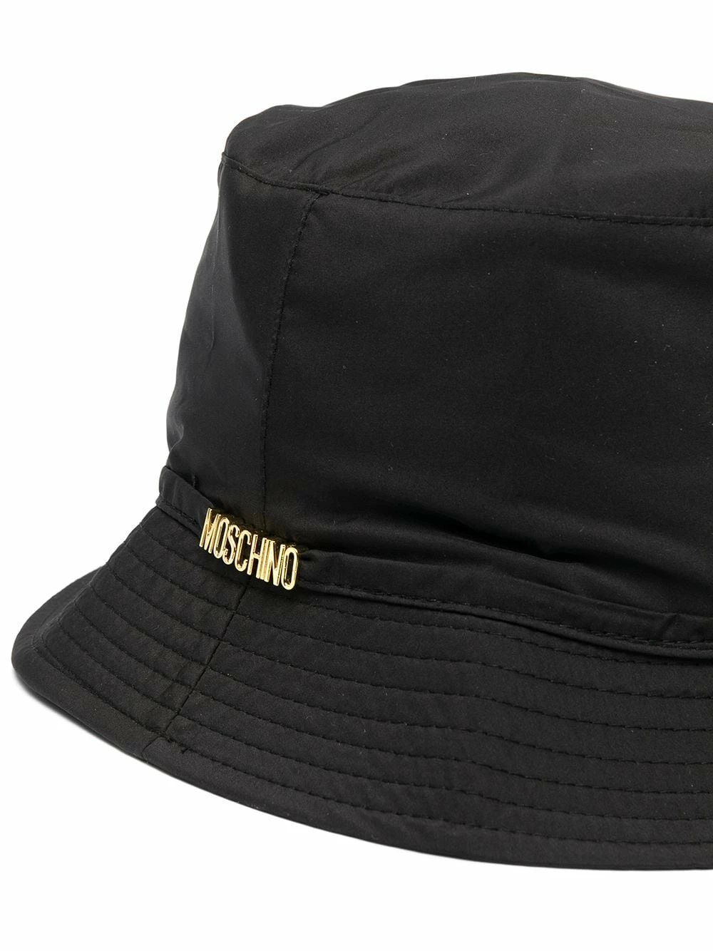 Top off your looks with Moschino. This bucket hat is detailed with a gold-tone logo plaque, showing where your loyalties lie. Hats off to you.
