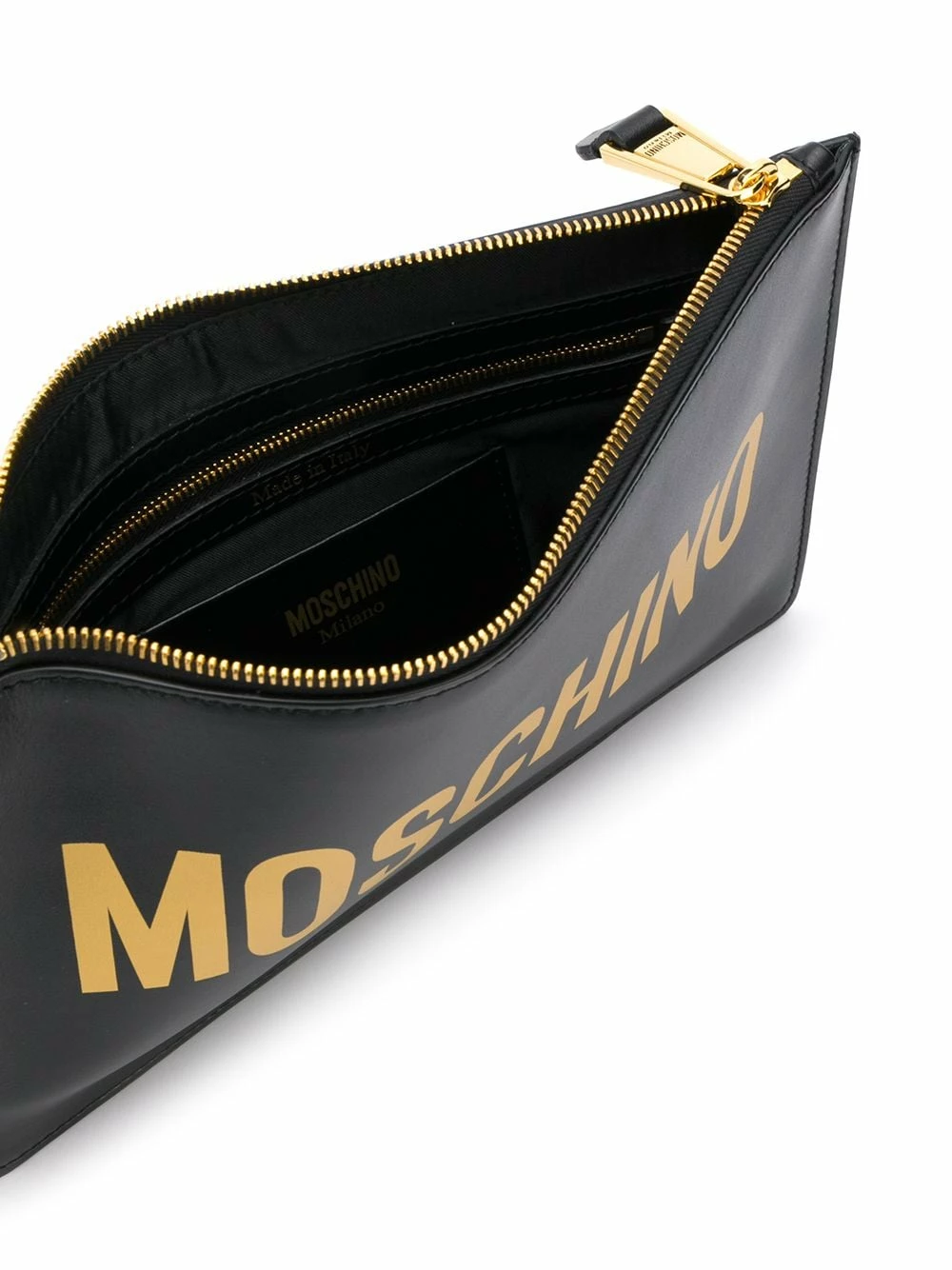 The most loved bag for so many streetwear style lovers, is back! This black calf leather logo printed clutch from Moschino is the is a fashion staple. Functional, and super stylish. Featuring a hand strap, a top zip fastening, a printed logo to the front, a main internal compartment, an internal zipped pocket, an internal slip pocket and a rectangular body.