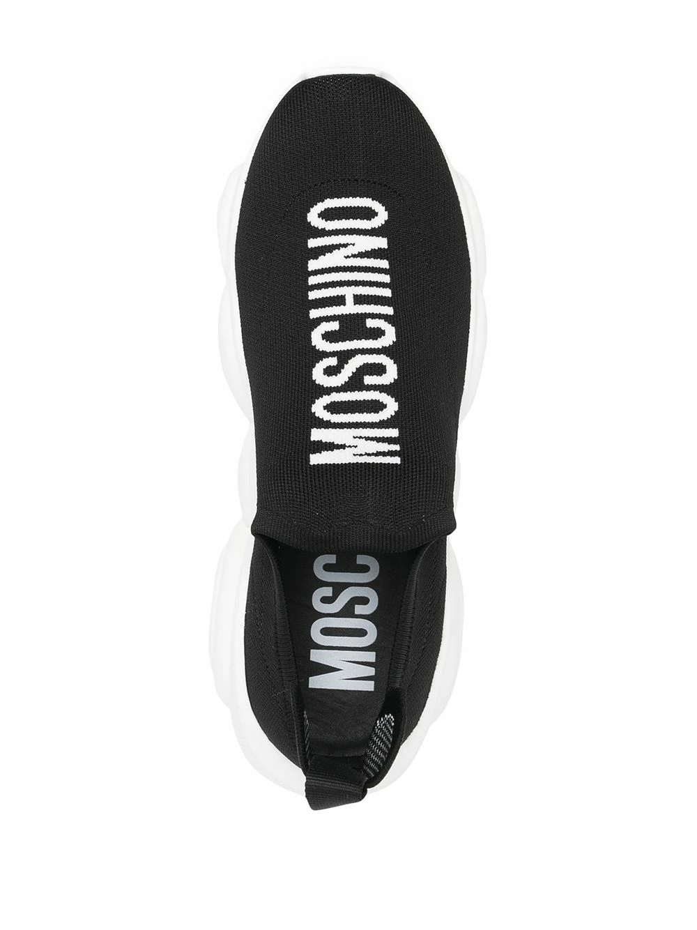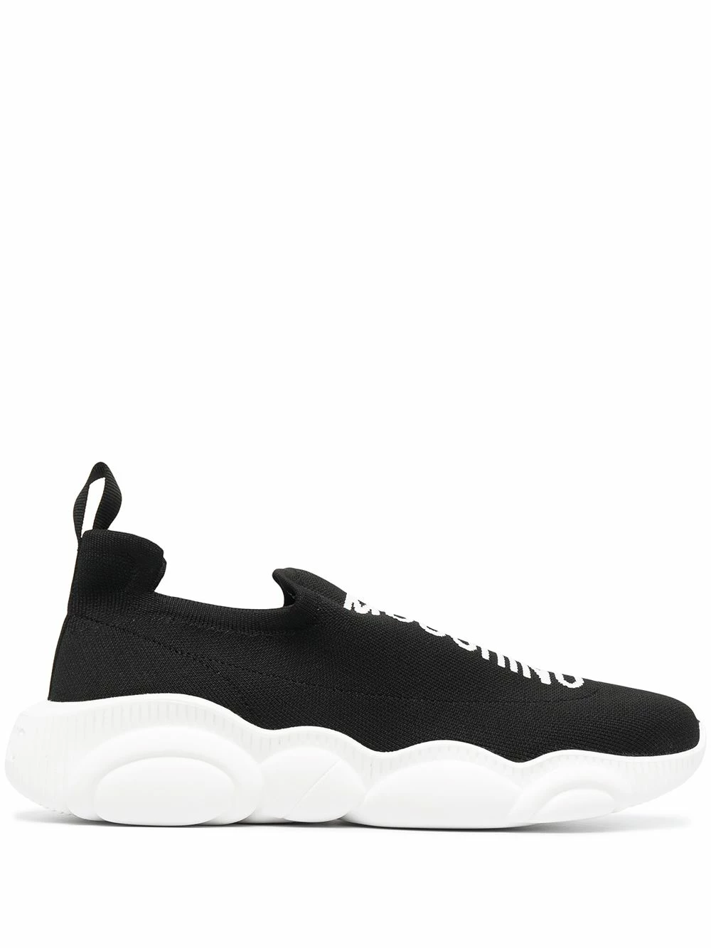We want to walk more than a mile in these shoes. Moschino’s black logo-printed sneakers boast an easy slip-on design. Kick back and relax.ย