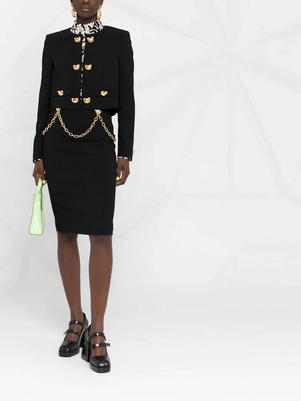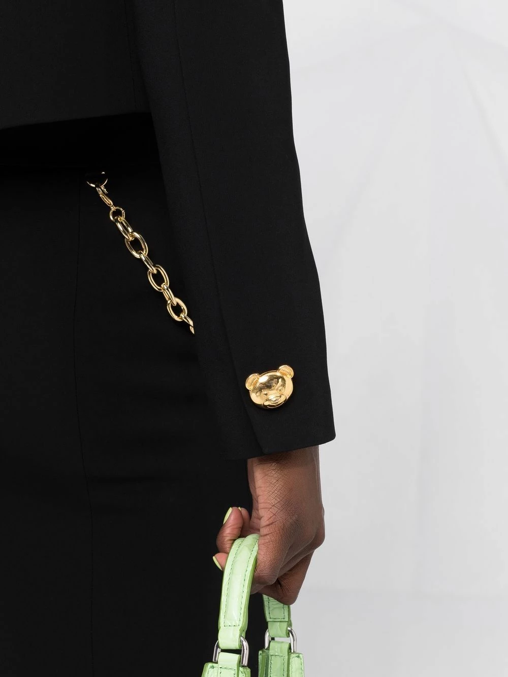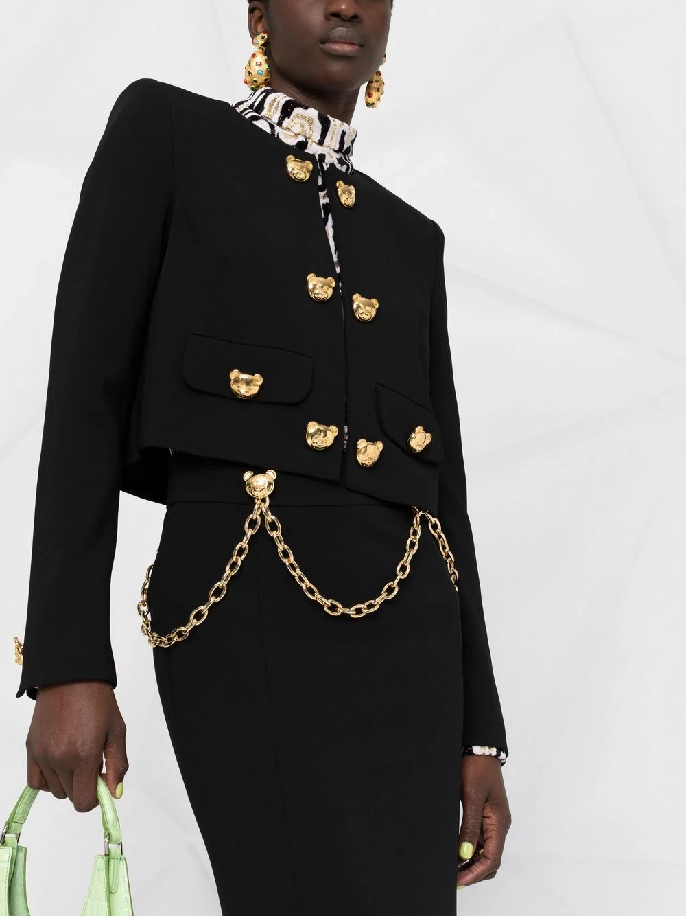 A playful take on officewear. Equal parts polished and high-spirited, this jacket from Moschino is detailed with Teddy Bear-shaped buttons for added appeal. Navigate the grown-up life in style.