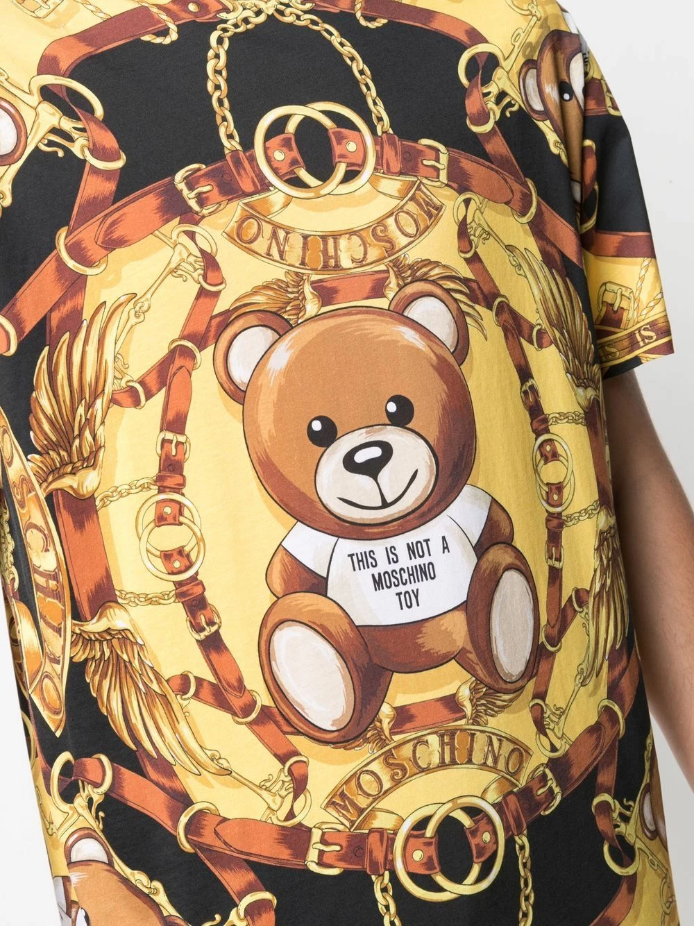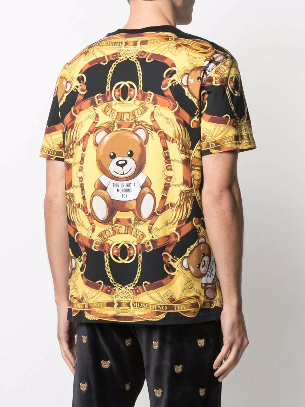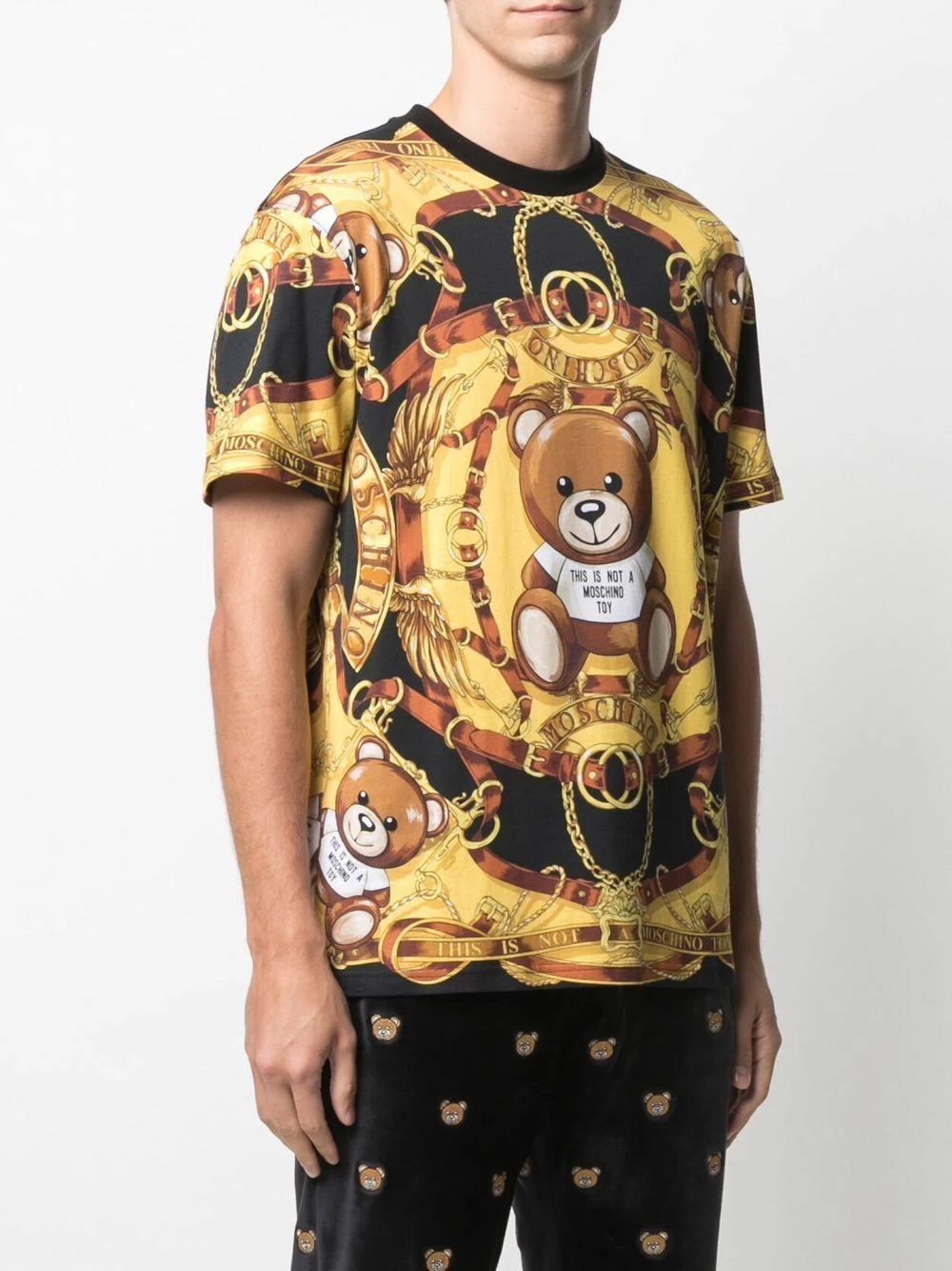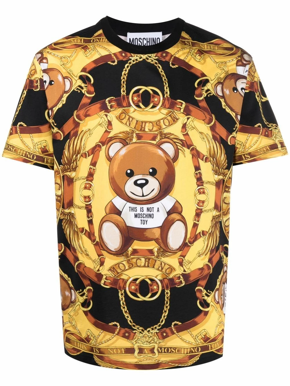 The Toy Teddy motif is symbolic of Moschino’s youthful approach to design. This black and yellow printed cotton T-shirt features the emblem throughout alongside the brand’s new season bridle print.