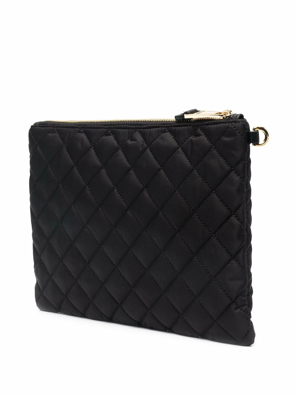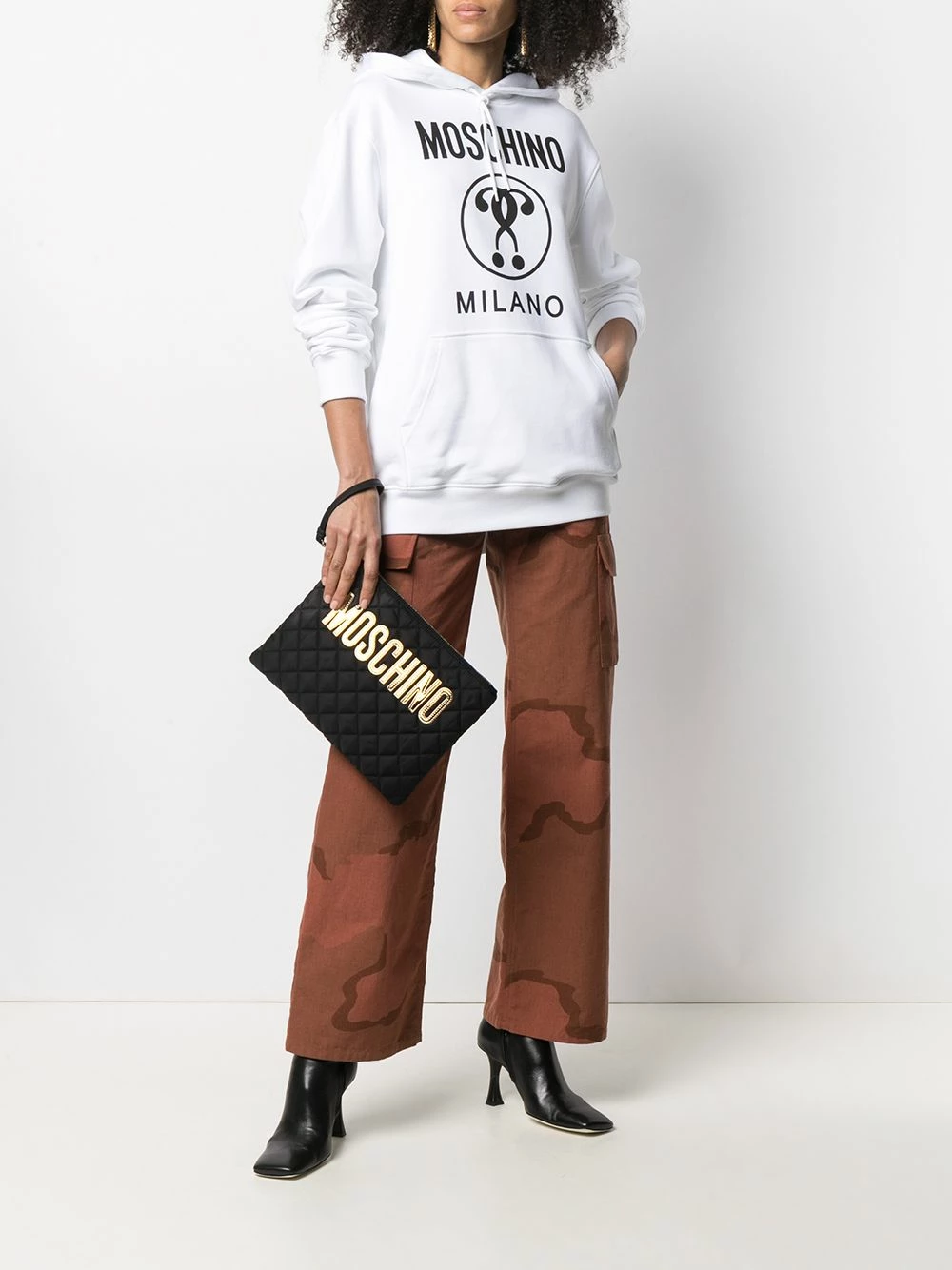Go for gold with your next accessory update. You’ll be catching the light, and everyone’s attention, with this gold-tone logo plaque Moschino clutch bag. Shine bright.