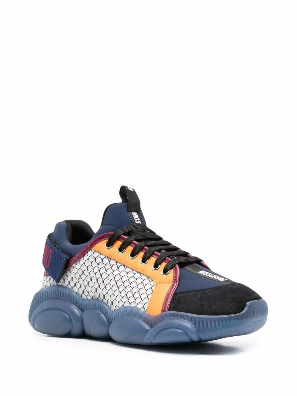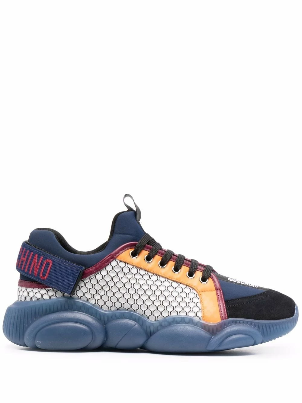 The playful Teddy Bear motif is a Moschino mainstay. It appears in an unexpected way on these low-top sneakers, making up the chunky rubber sole.