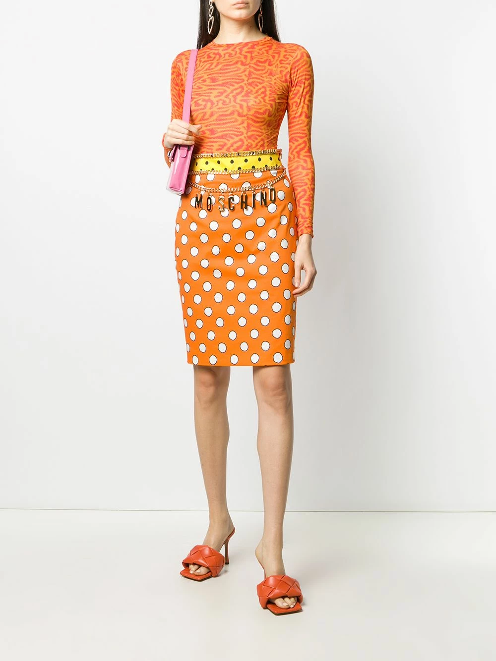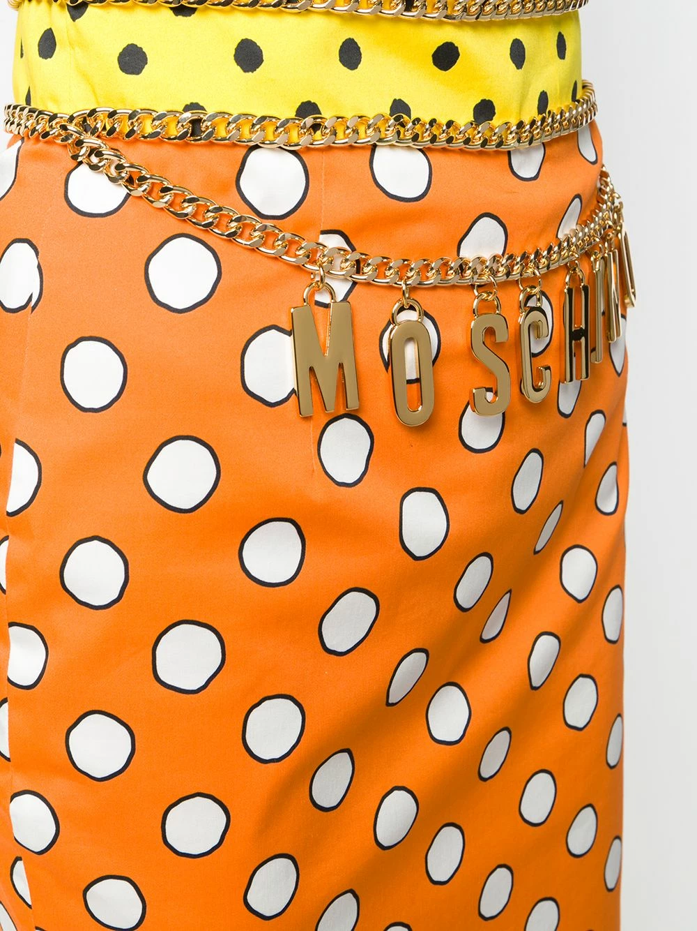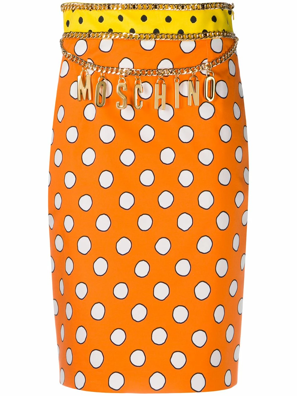 If you need any reasons to smile, rejoice by knowing this pussy bow skirt from Moschino is available and ready to jump right into your wardrobe. Presented in a vibrant orange hue, it boasts a charismatic polka dot print that carries the promise of an instant mood uplift. Good vibes only.