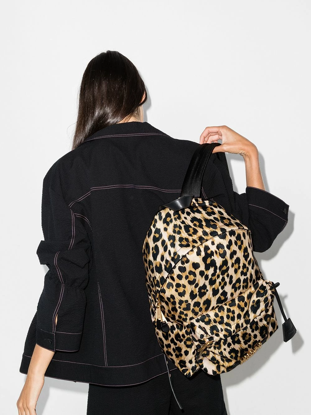 “Fashion should be fun and should send a message,” said Franco Moschino, founder of the house of Moschino in 1984. Today Creative Director Jeremy Scott continues to imbue every collection with the same humour, irreverence and statement style for which the brand is renowned. Case in point: this backpack. The two-shoulder straps silhouette is elevated to a luxe status through an all-over leopard print and gold-tone detailing – including a logo lettering at the front.ย