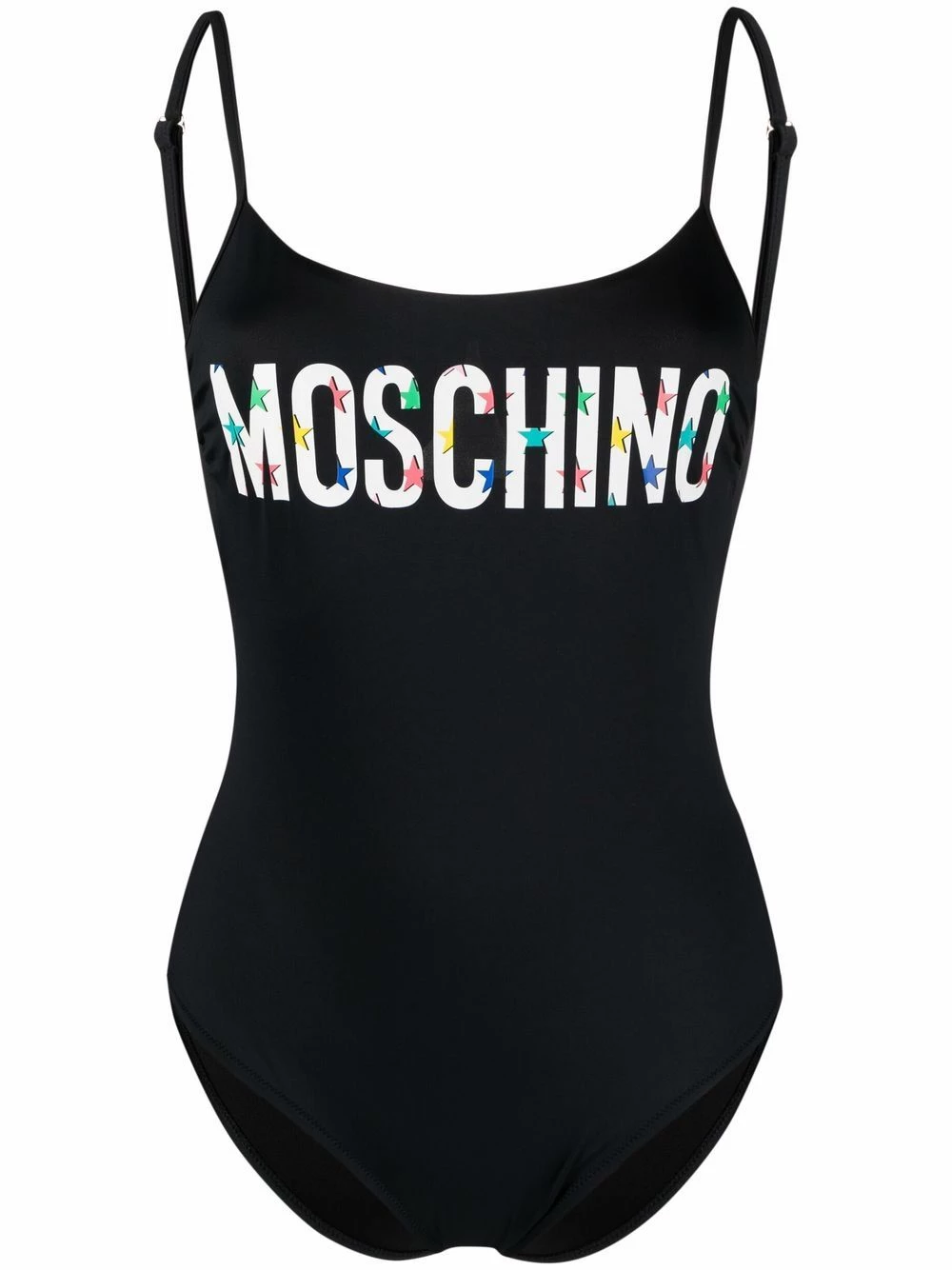 Looks like Jeremy Scott is not only a fashion designer but also a film director. Moschinoโs AW21 collection is an ode to old Hollywood glamour featuring the brand’s logo printed on the front and multicolour star prints – as seen on this black swimsuit.