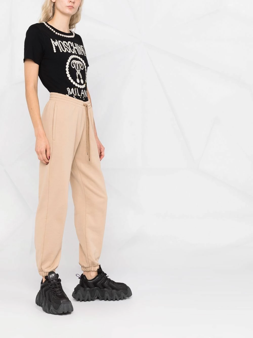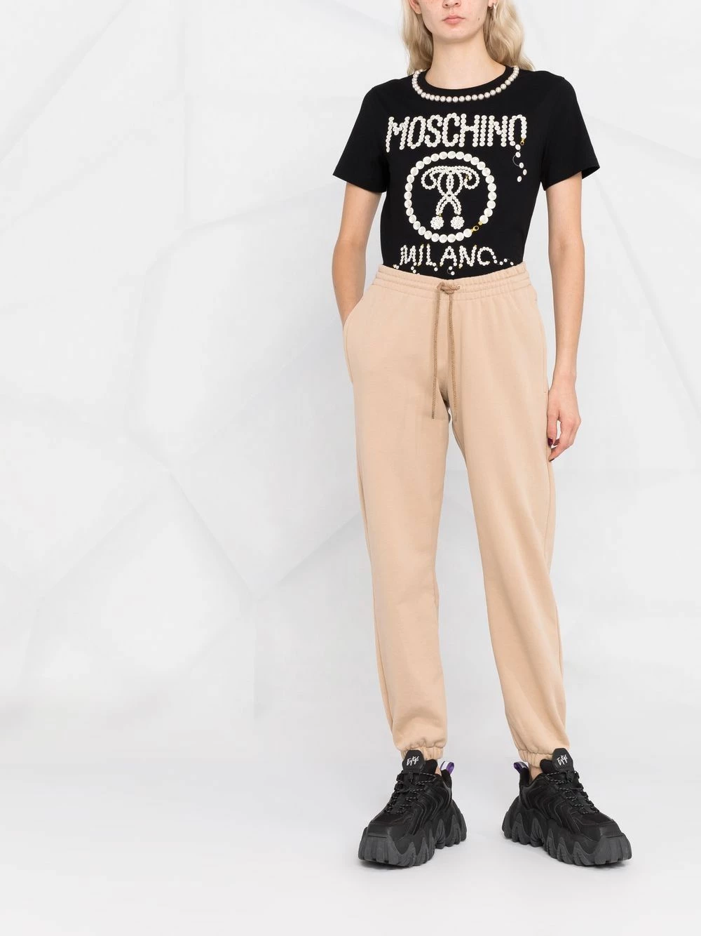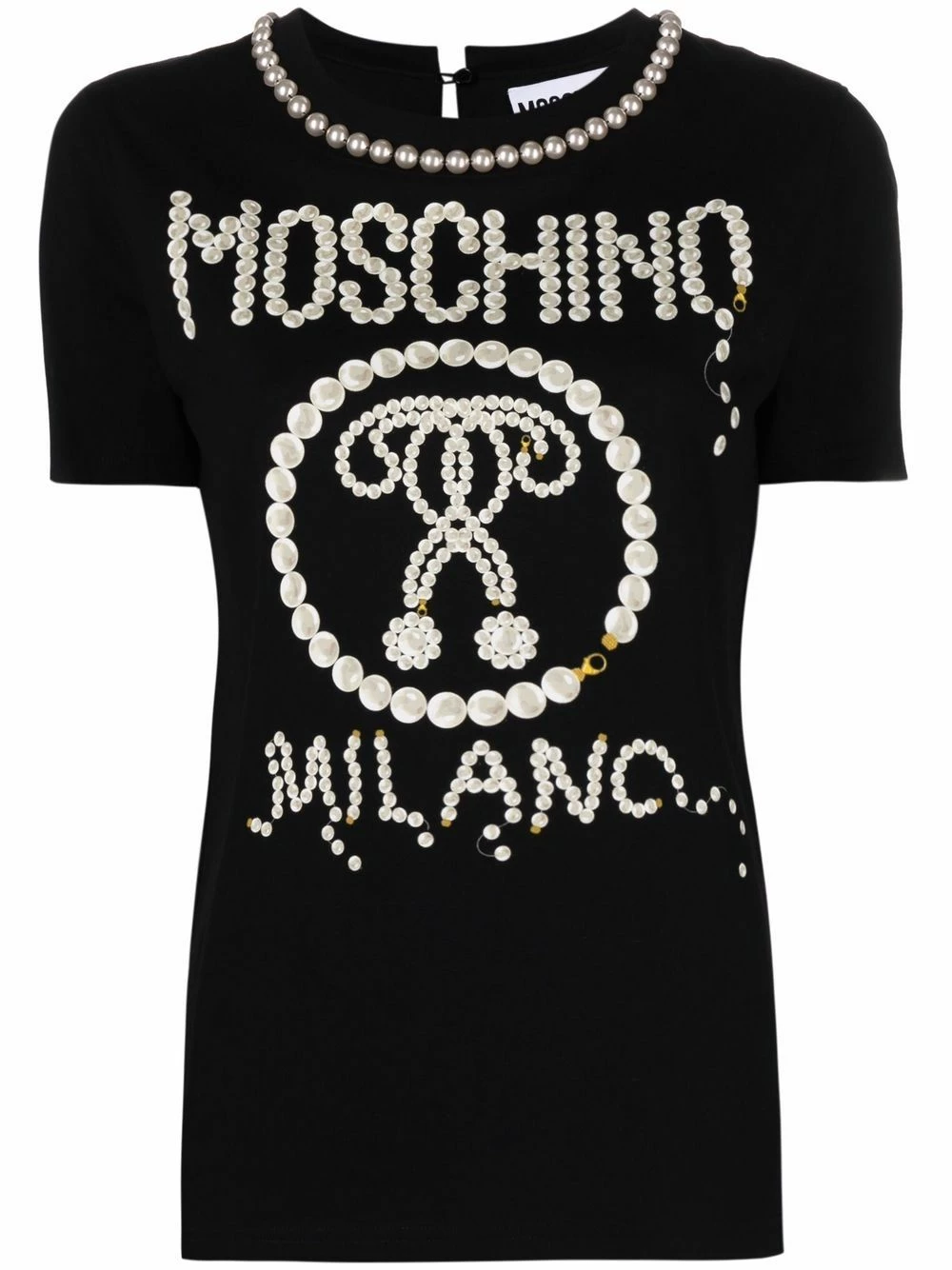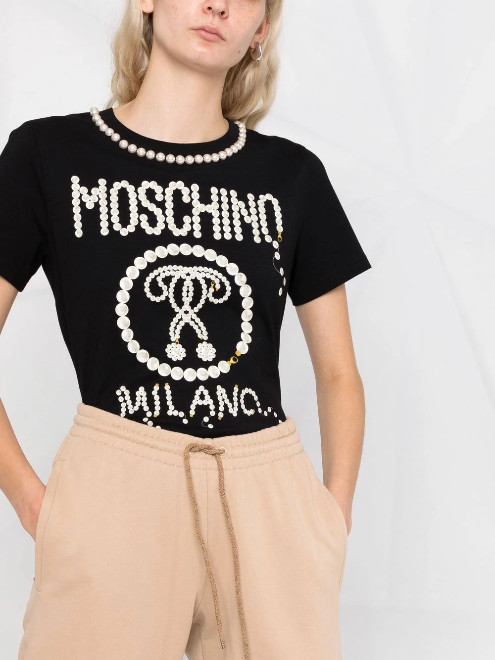 Somewhere between casual and elegant is this T-shirt from Moschino. Crafted from black cotton, the laid-back design is decorated with the signature Double Question Mark logo and adorned with faux-pearl embellishments for a refined touch.