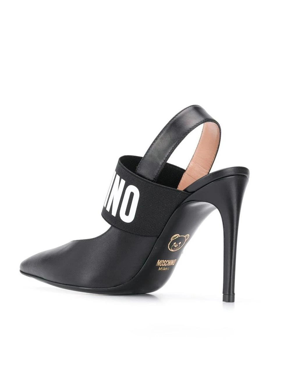 The Moschino verve is all about a confident attitude and a mash-up of playful references, with a large dose of street-wear appeal. These black leather logo slingback pumps feature a high stiletto heel with a strap on the back and an elastic insert side, a branded insole, tapered tip and a leather sole with the laminated Teddy Bear detail.