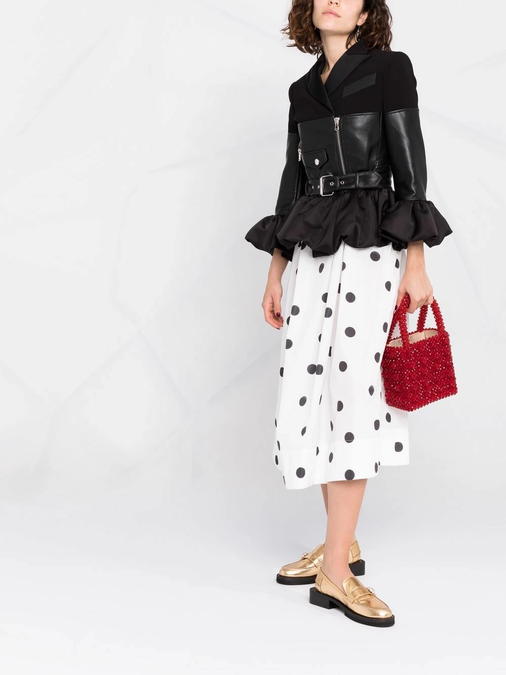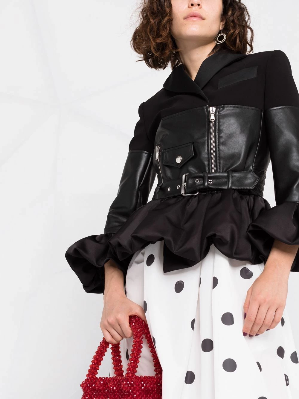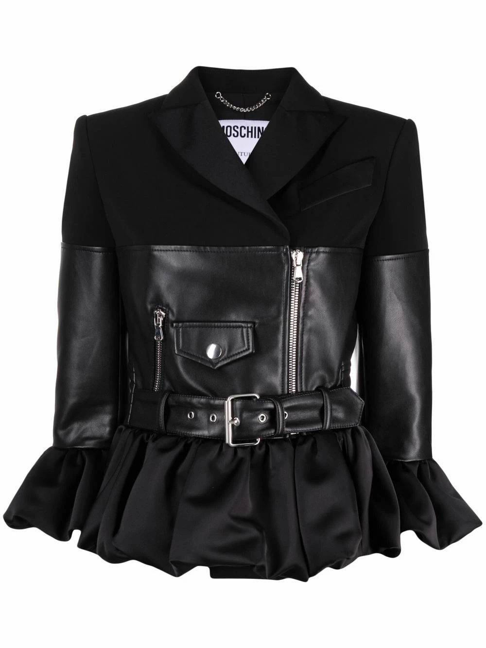There are classic biker jackets and there are Moschino biker jackets. Unlike the classic silhouette, this design features a flattering peplum hem and a panelled construction. Rule-breaking done right.ย