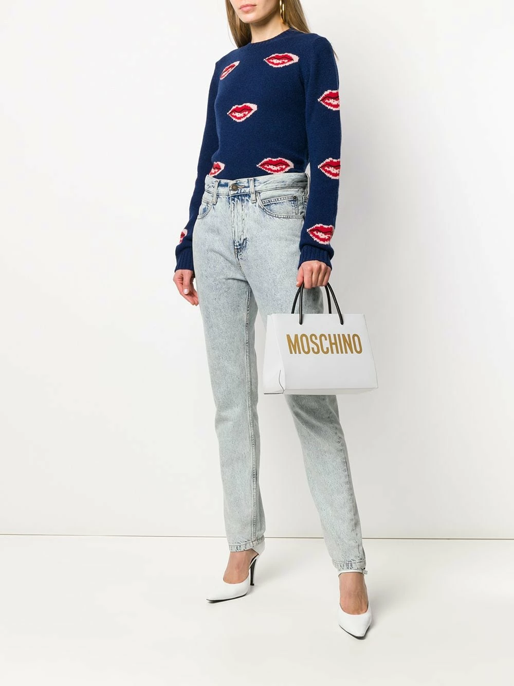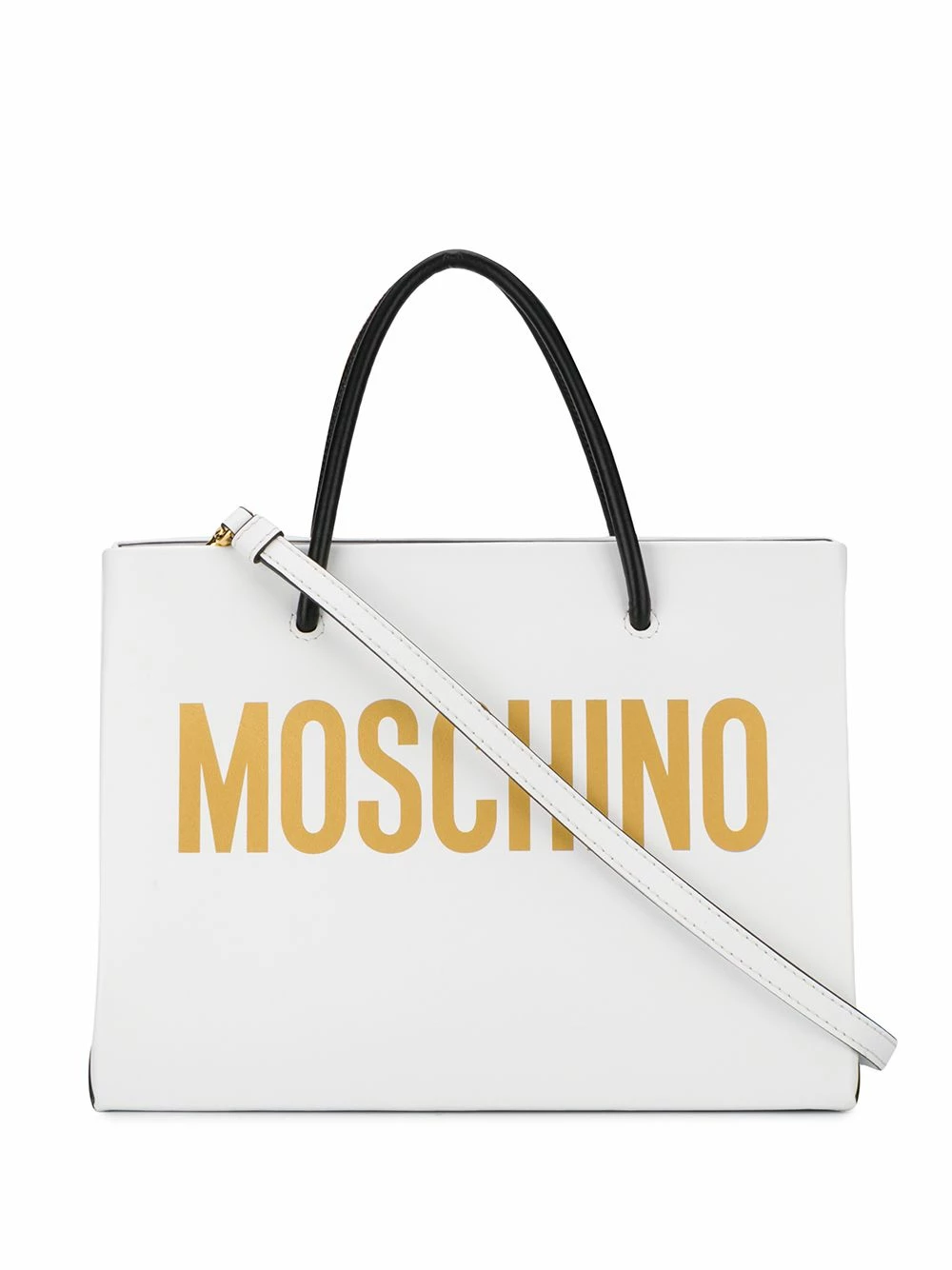 Whether you’re going for a casual or classic look, this white calf leather square logo print tote bag from Moschino will be an instant style upgrade. Versatile and super stylish. A great every day tote!ย