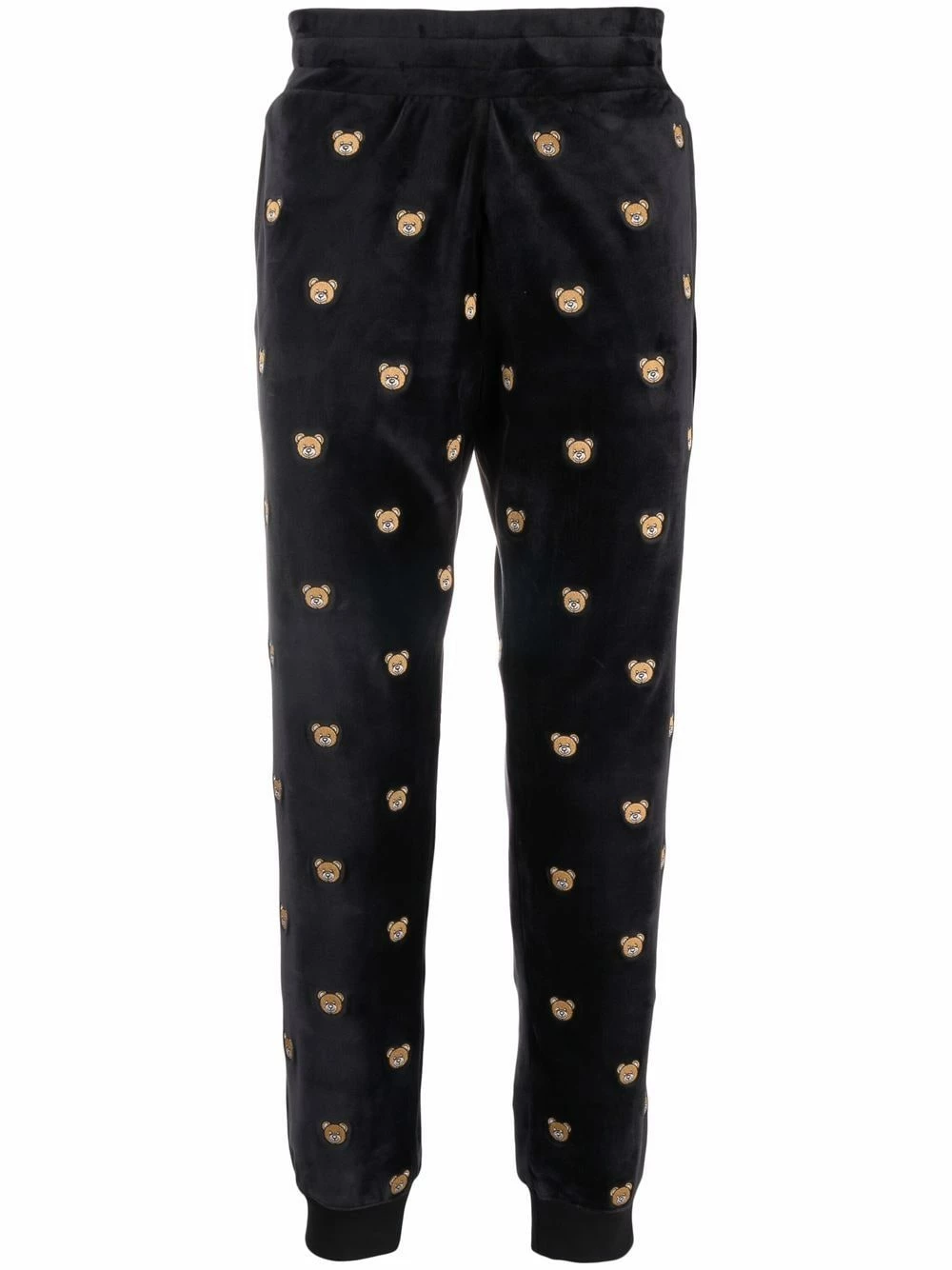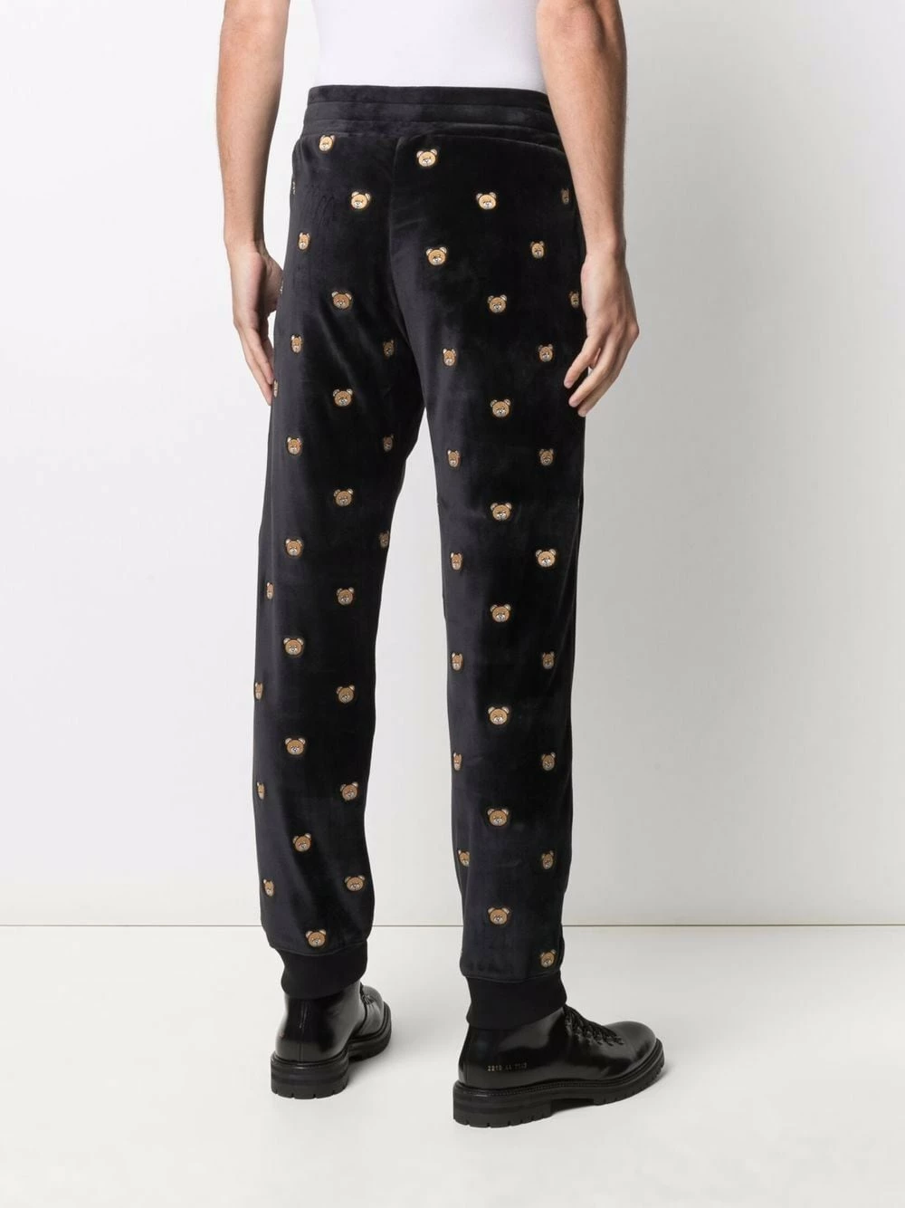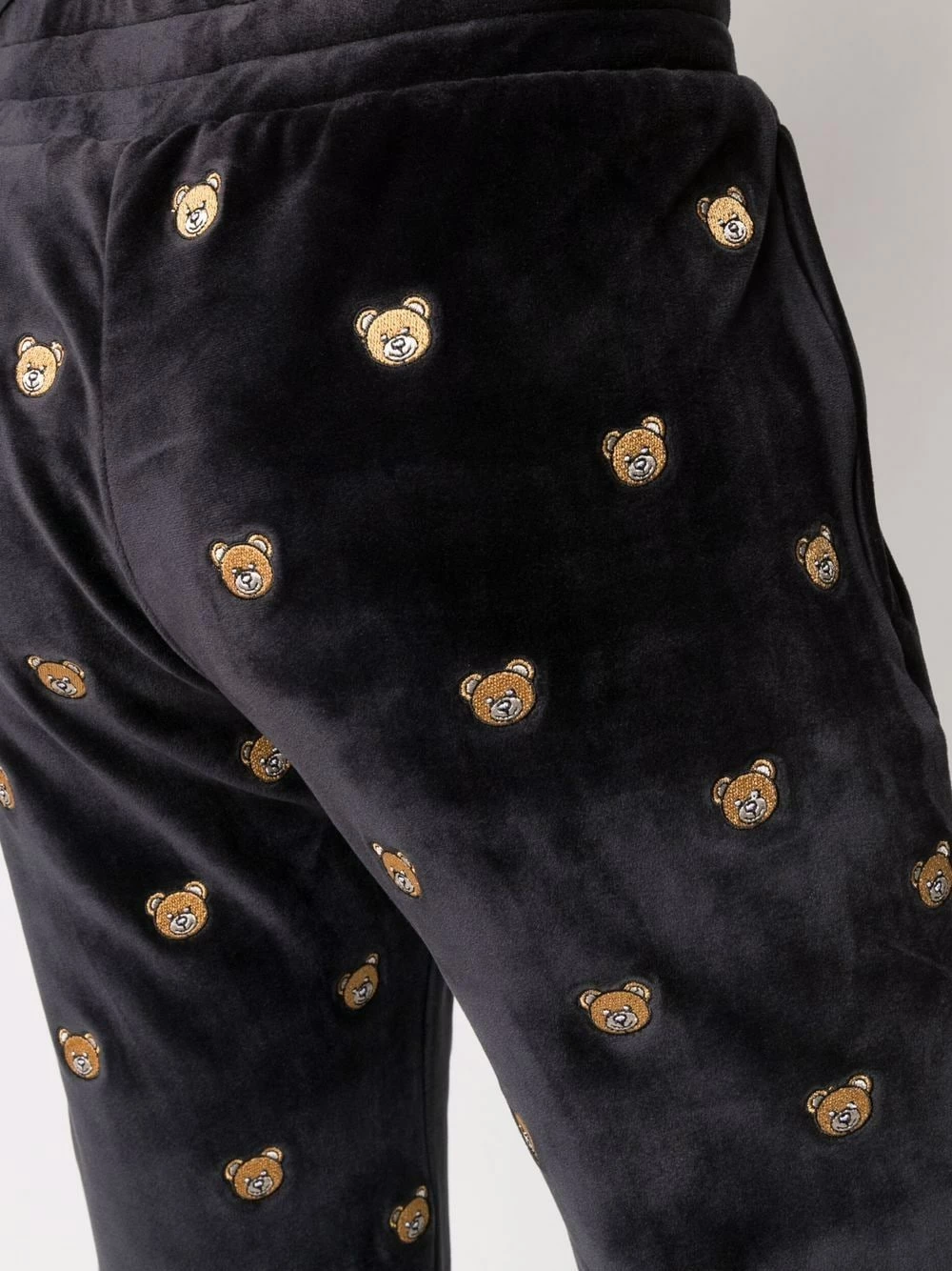 The Toy Teddy motif is symbolic of Moschino’s youthful approach to design. Made from soft black velour, these tapered track pants are embroidered with the teddy motif throughout.
