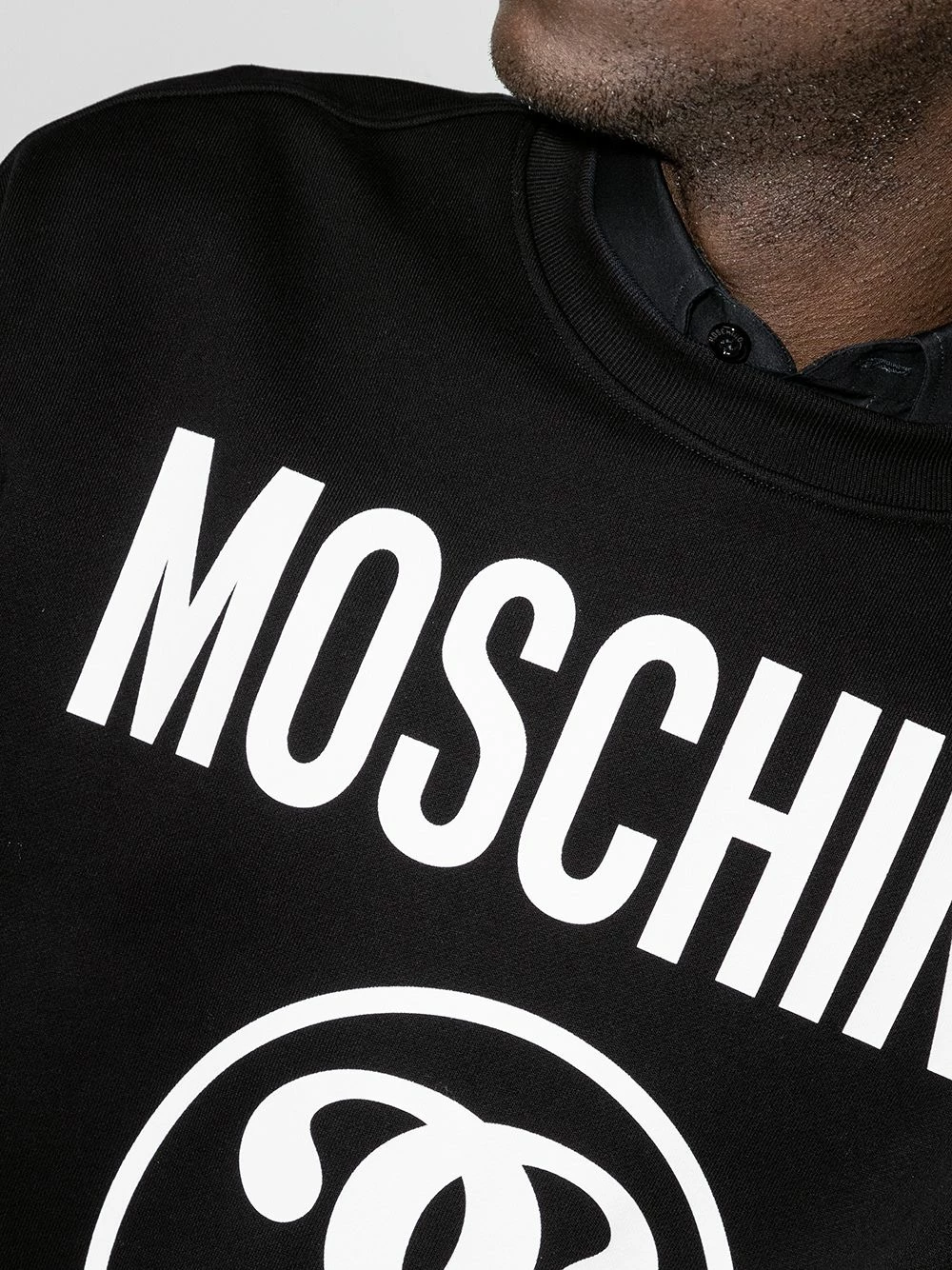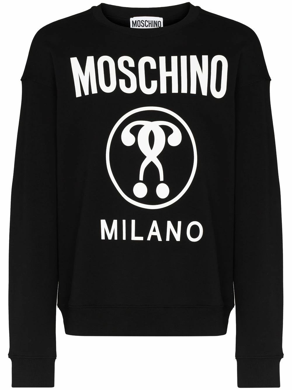 In a bright white hue that contrasts with its black design, this sweatshirt is adorned with a signature Double Question Mark logo – a testament to Moschino’s penchant for logomania.
