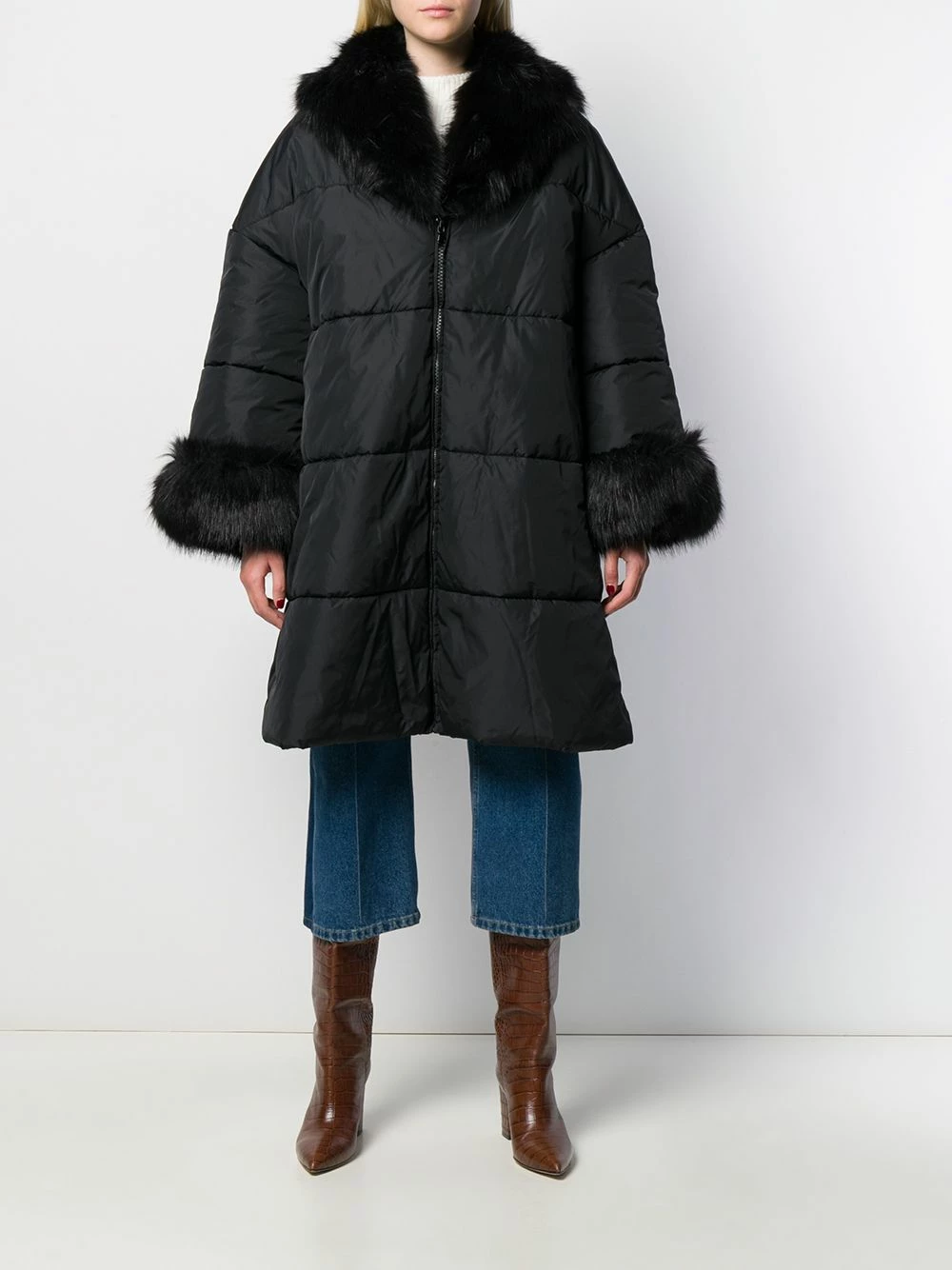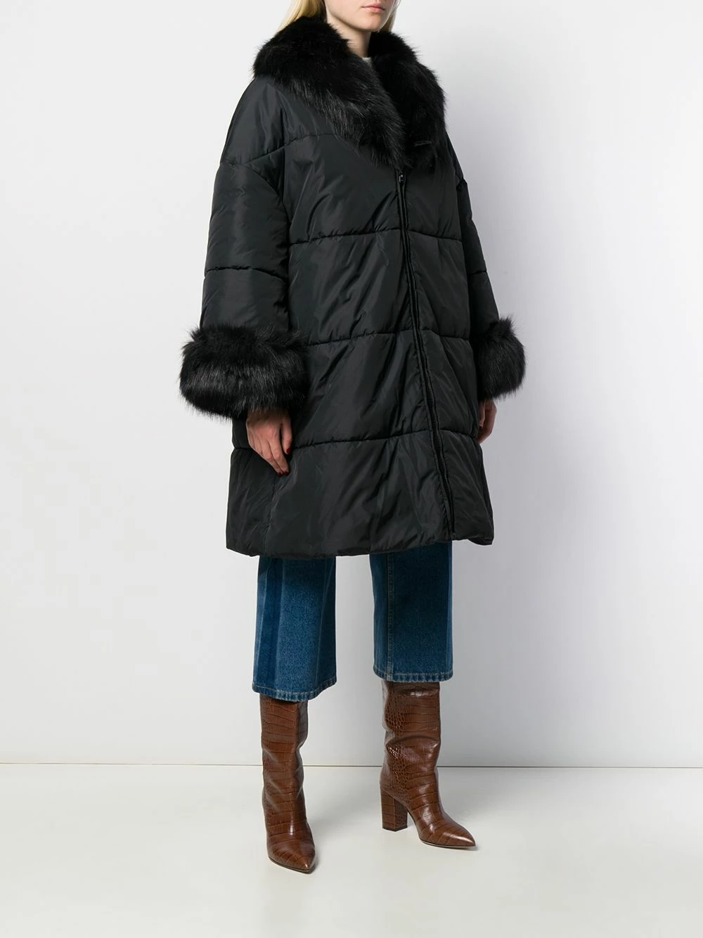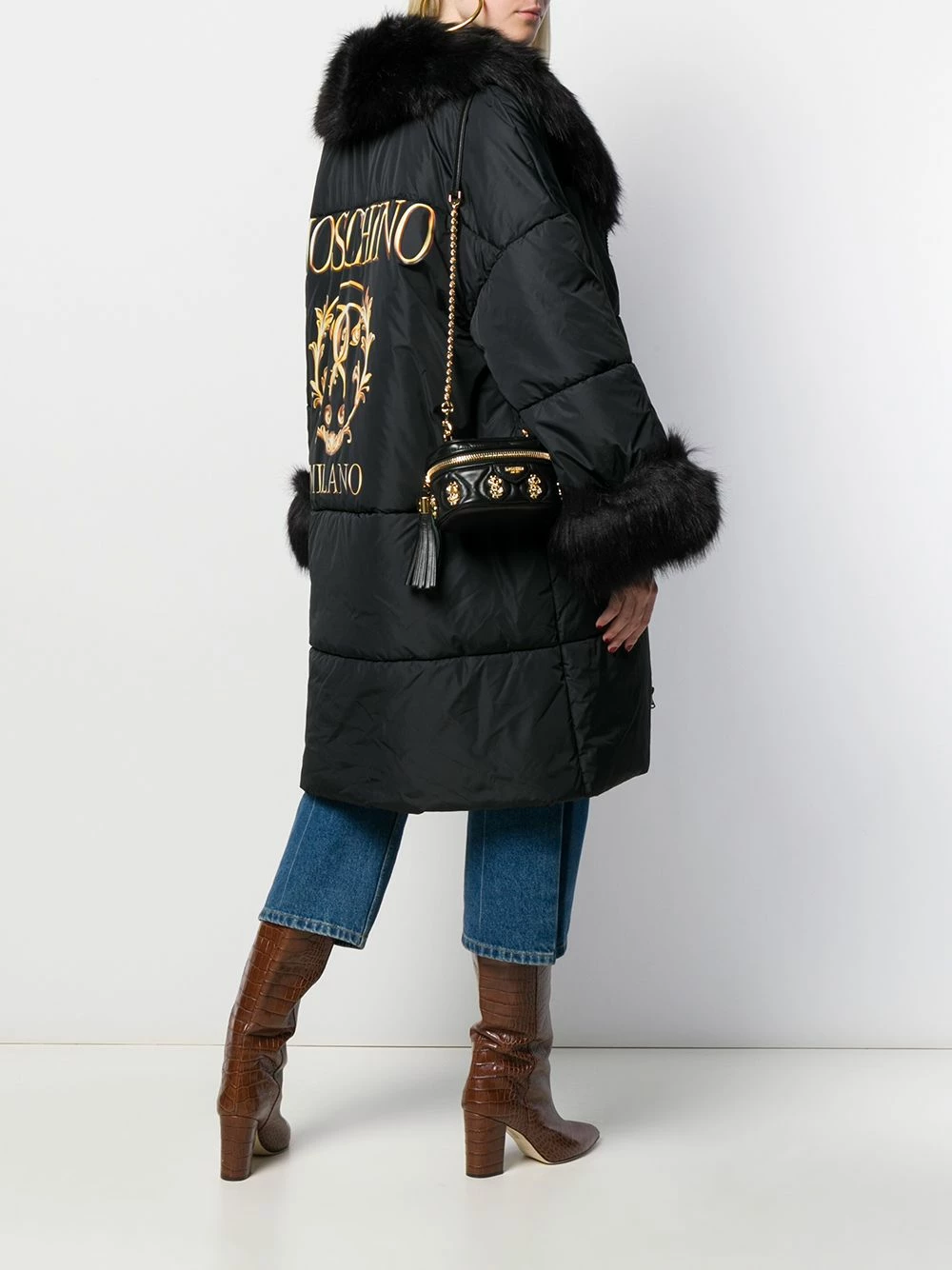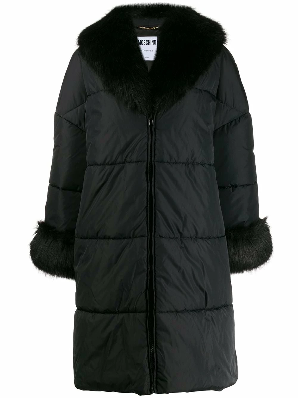 Not a collection goes by with Moschino without those luxurious details, faux fur trimming, padded interiors and the iconic Roman Double Question Mark logo decorate this warm winter coat. Who said winter dressing was boring? Featuring faux fur details, a padded interior, long sleeves and a printed logo to the rear.