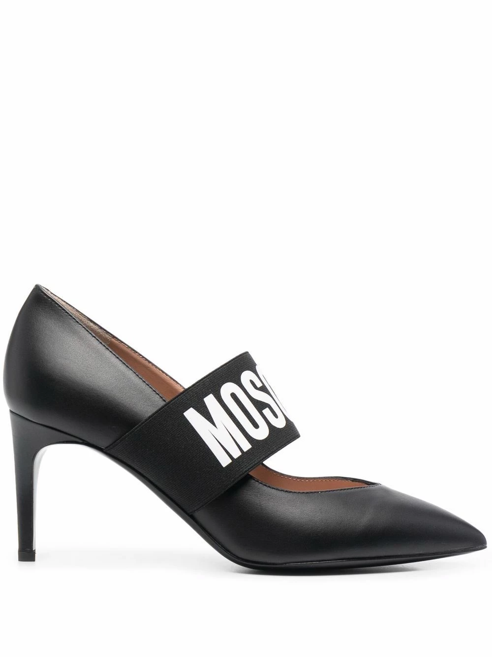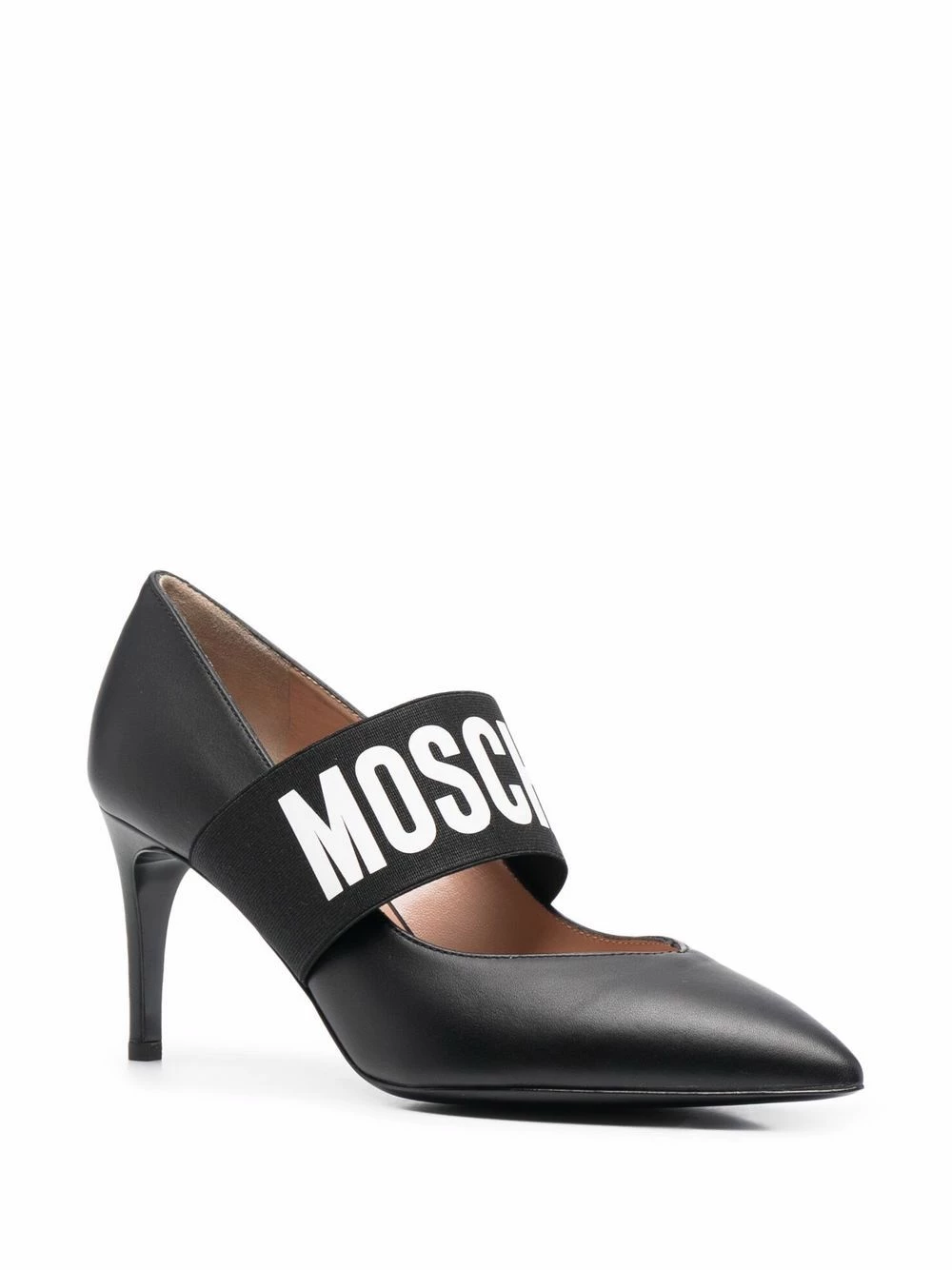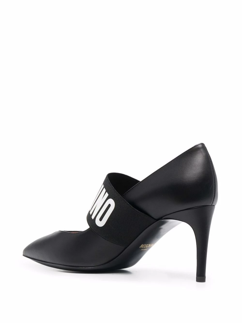 Never one to shy away from bold logos, Moschino presents these pumps. Designed from smooth black leather, bold logo lettering adorns the top elasticted strap.