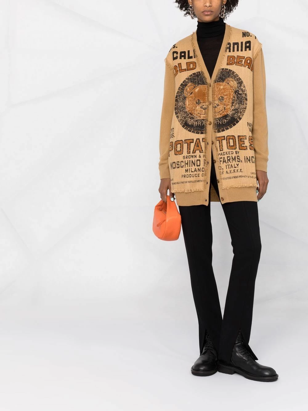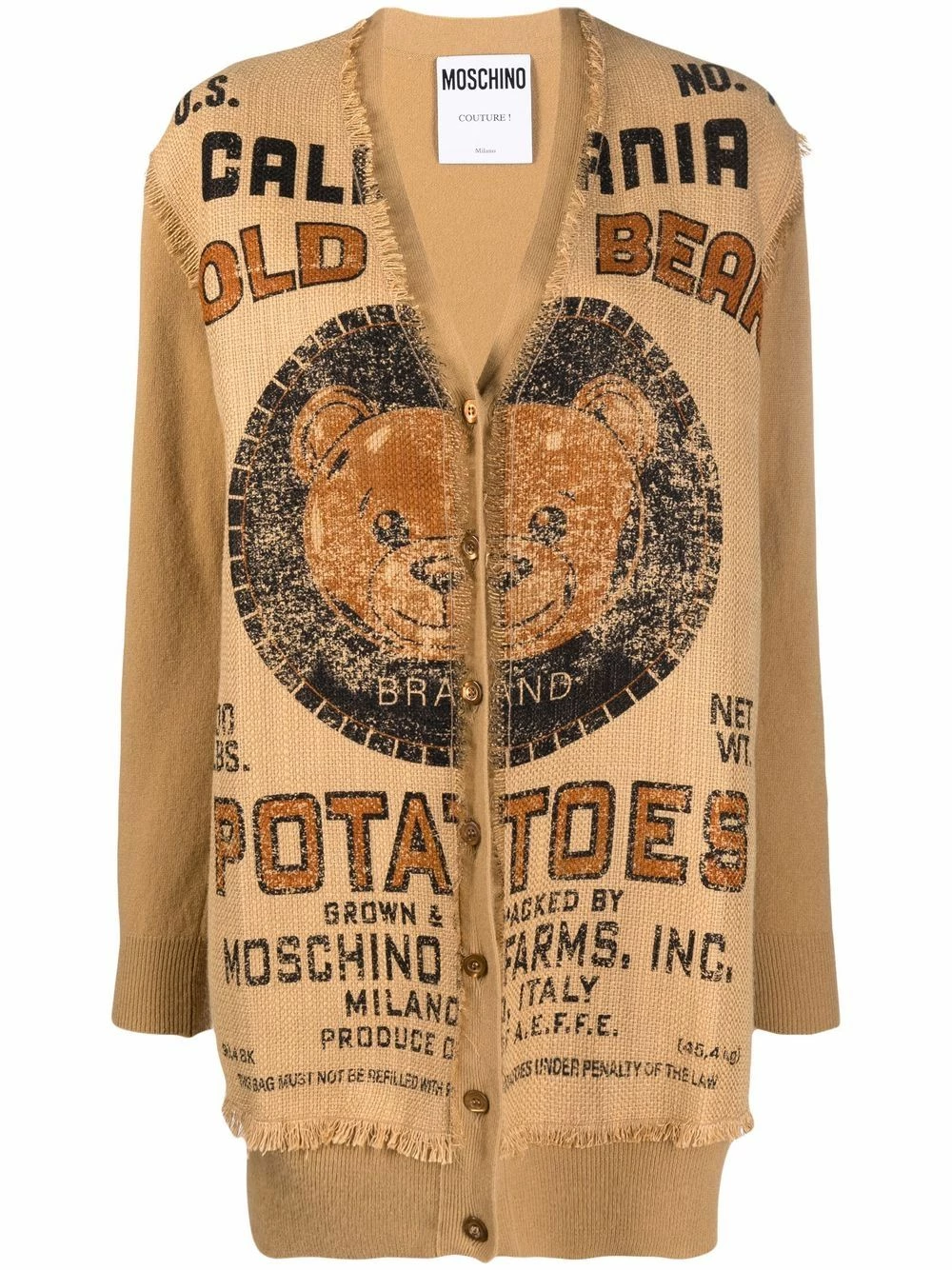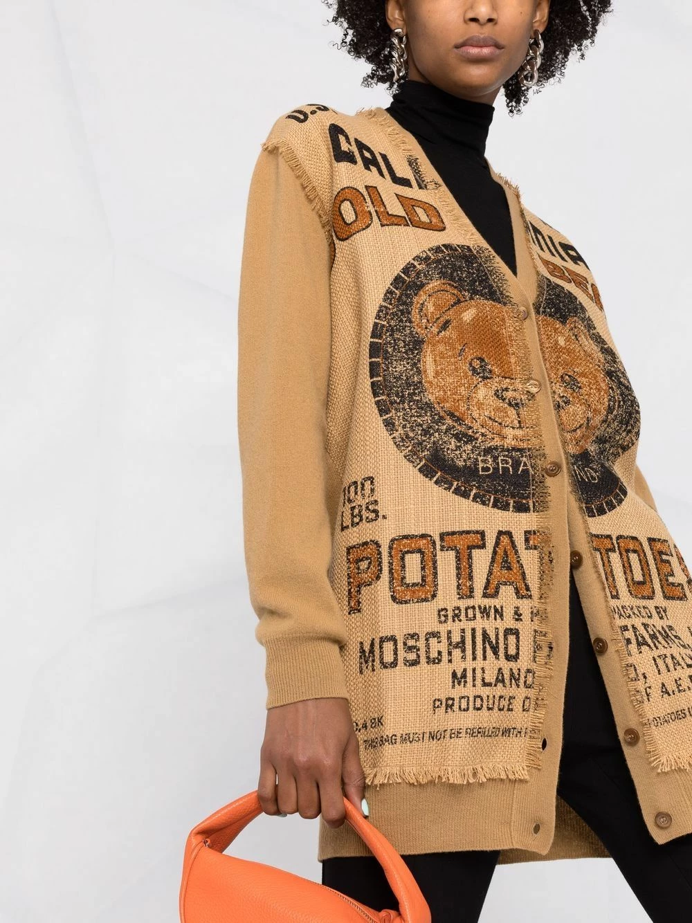Designated ‘Jungle Red’, Moschino’s AW21 collection finds inspiration in nature – which includes animals and food. The brand’s playful side is clear in this cardigan thanks to its Potato Field print combined with the signature Teddy Bear motif.Β