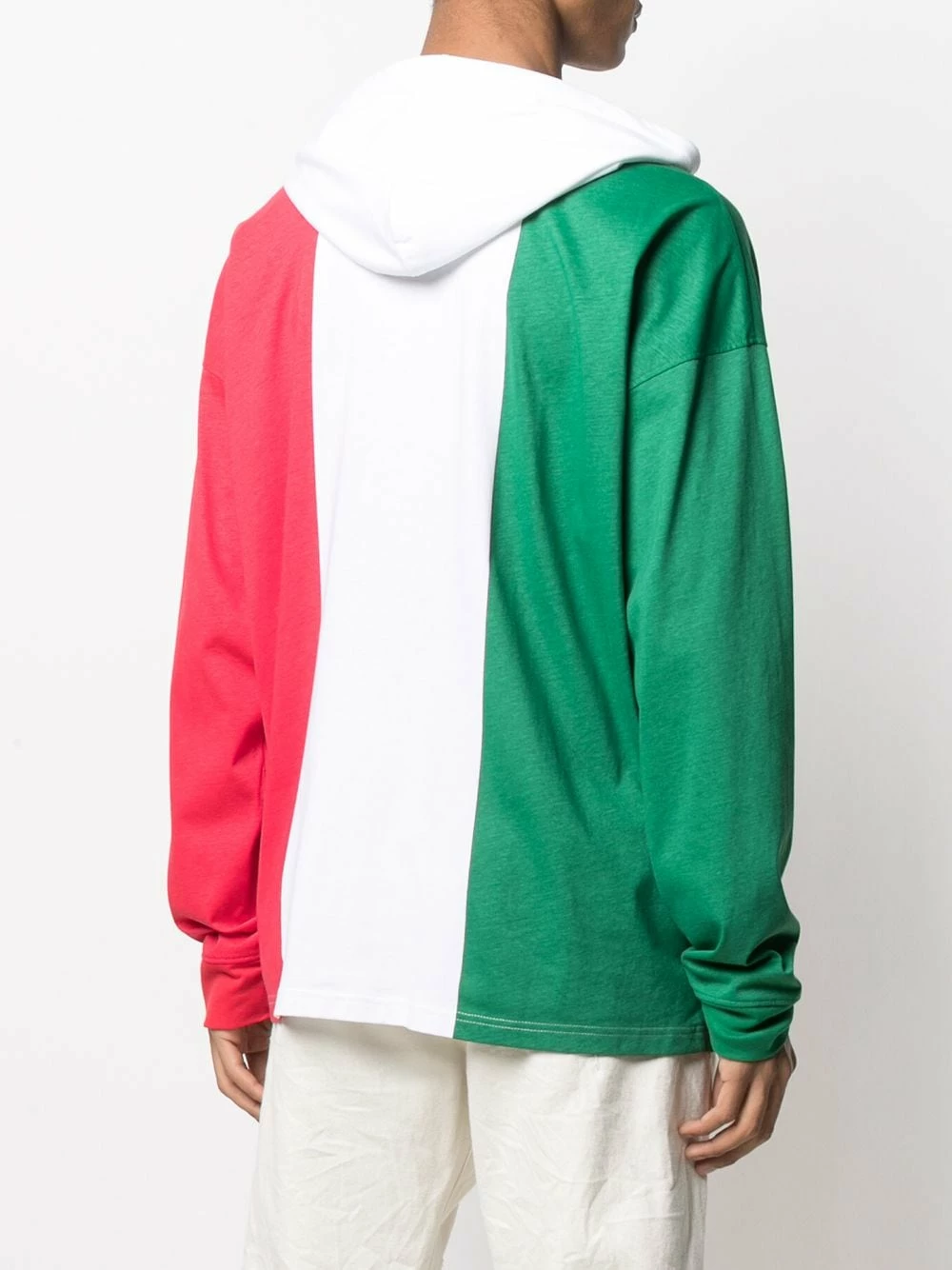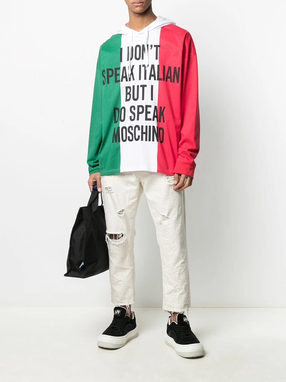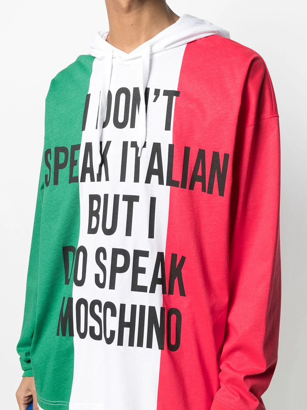 ‘How many languages do you speak?’ I speak Moschino is the correct answer. Featuring a slogan printed on an Italian flag design, this hooded T-shirt will let everyone know what is your native language. You live and breathe fashion.
