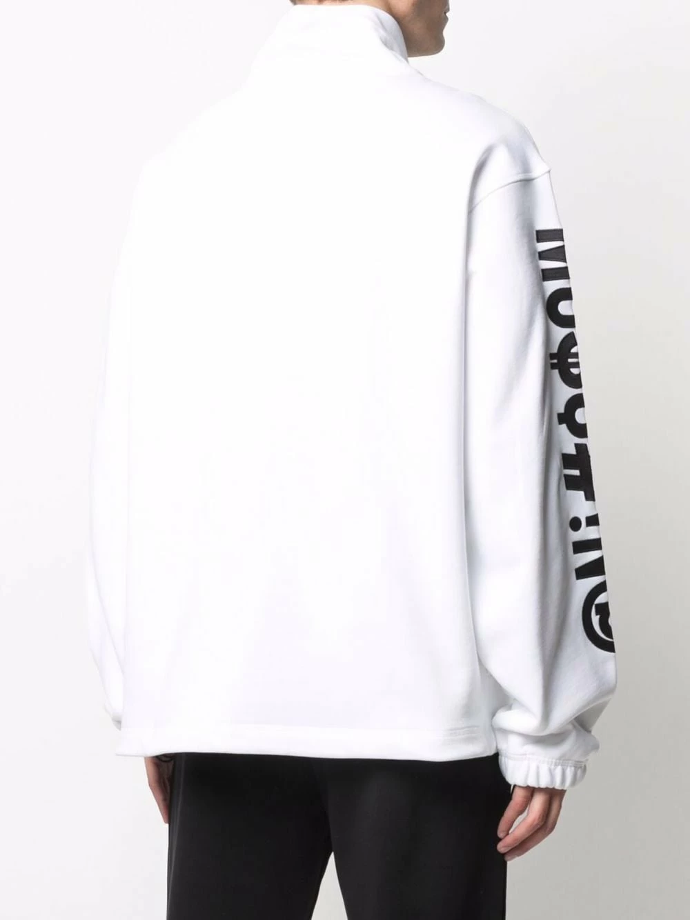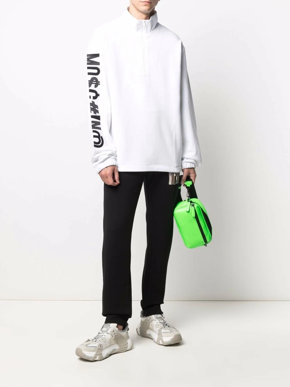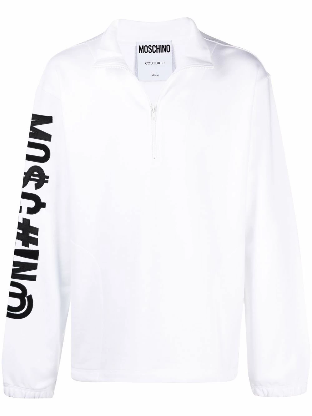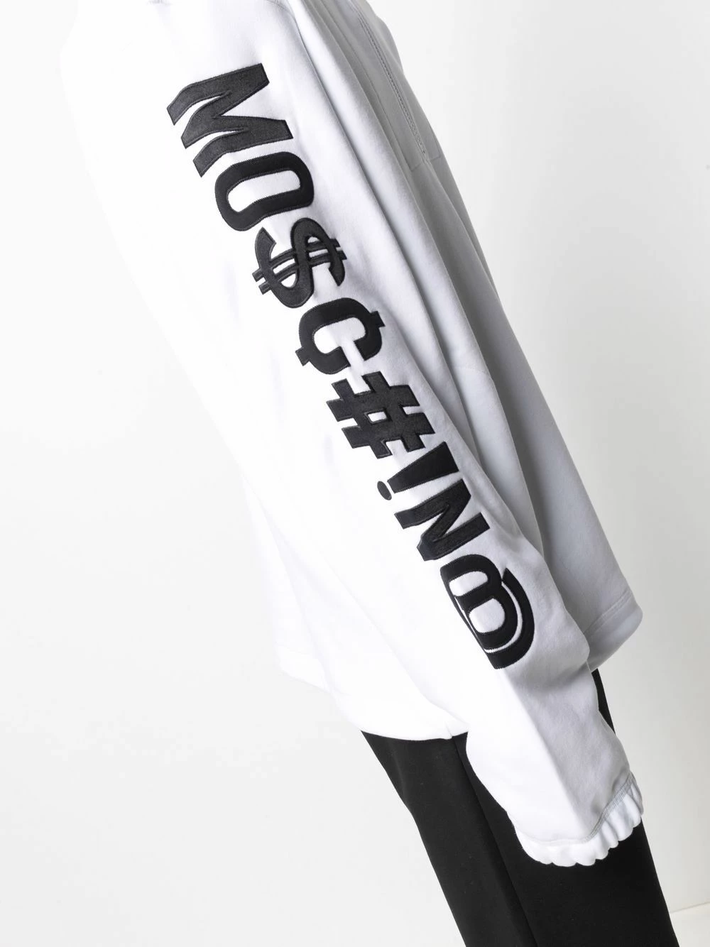 Moschino’s basic sweatshirts are back in the new SS21 collection. As per usual, the Italian luxury fashion brand has put together a timeless white design with an embroidered logo with symbols on the sleeve.