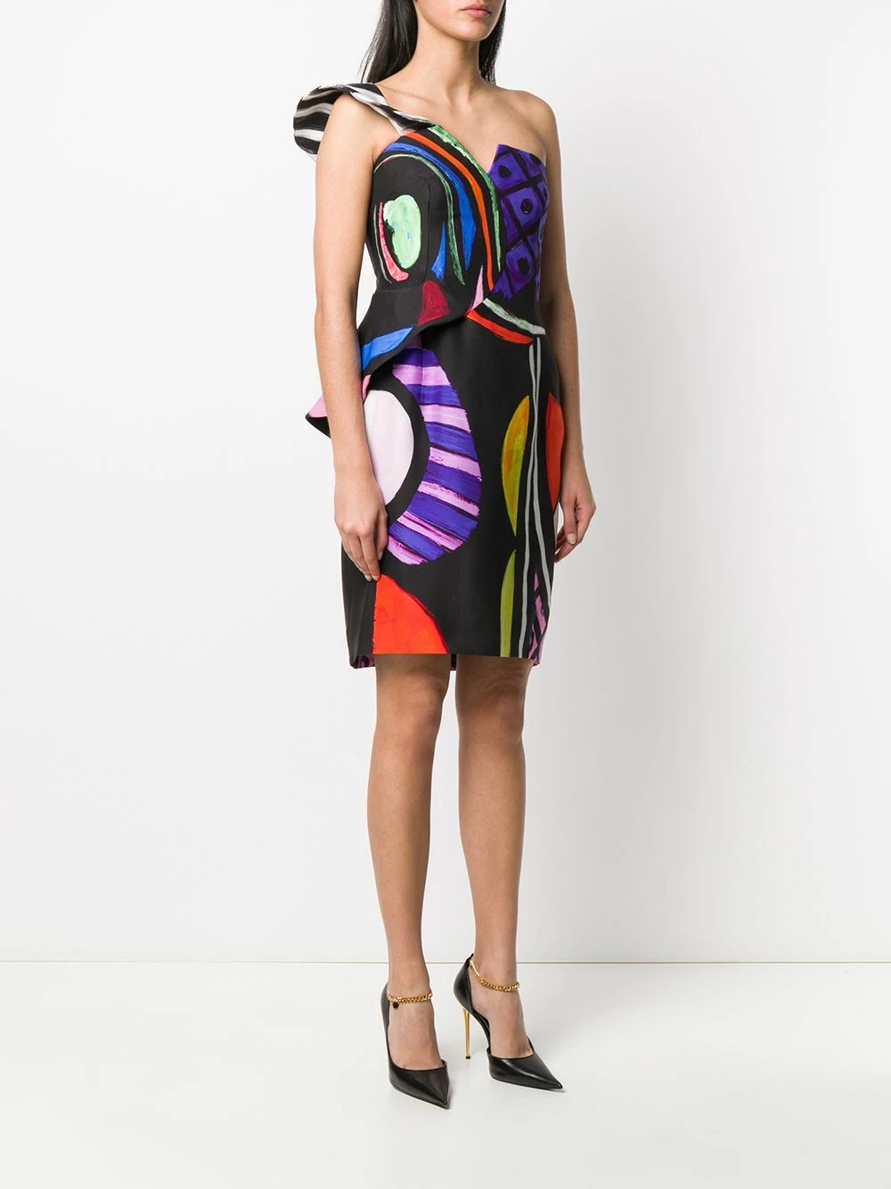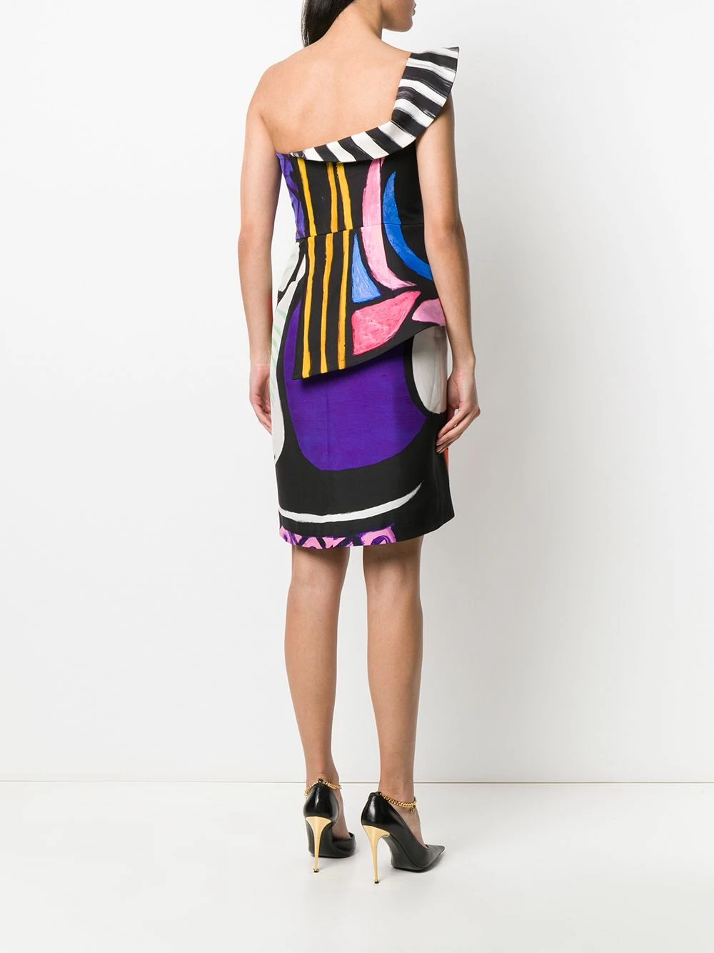 Art attack! Boasting a loud multicoloured abstract print, this arty cold-shoulder dress from Moschino has got our attention. Not for shrinking violets.