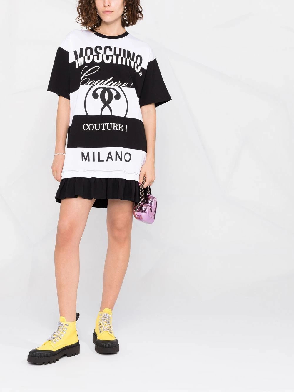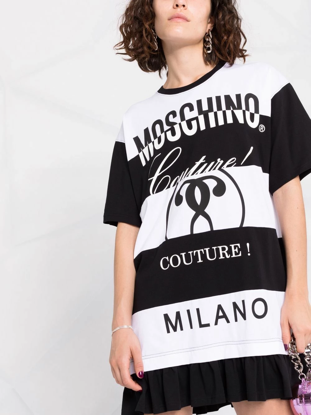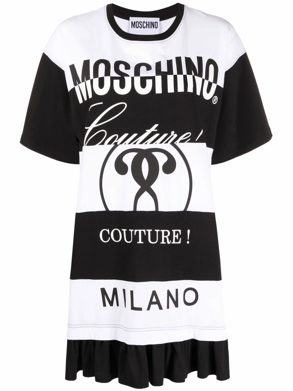 A classic motif from Moschino, the brand’s Double Question Mark print can be found atop this cotton T-shirt dress. Also detailed with monochrome stripes, a ruffled hem continues the brand’s playful aesthetic while veering away from its signature vibrant colour palette.
