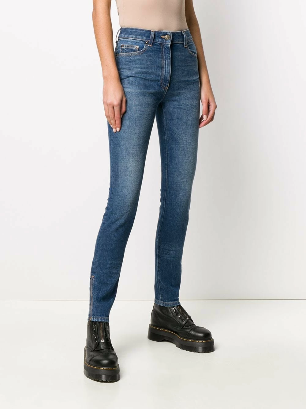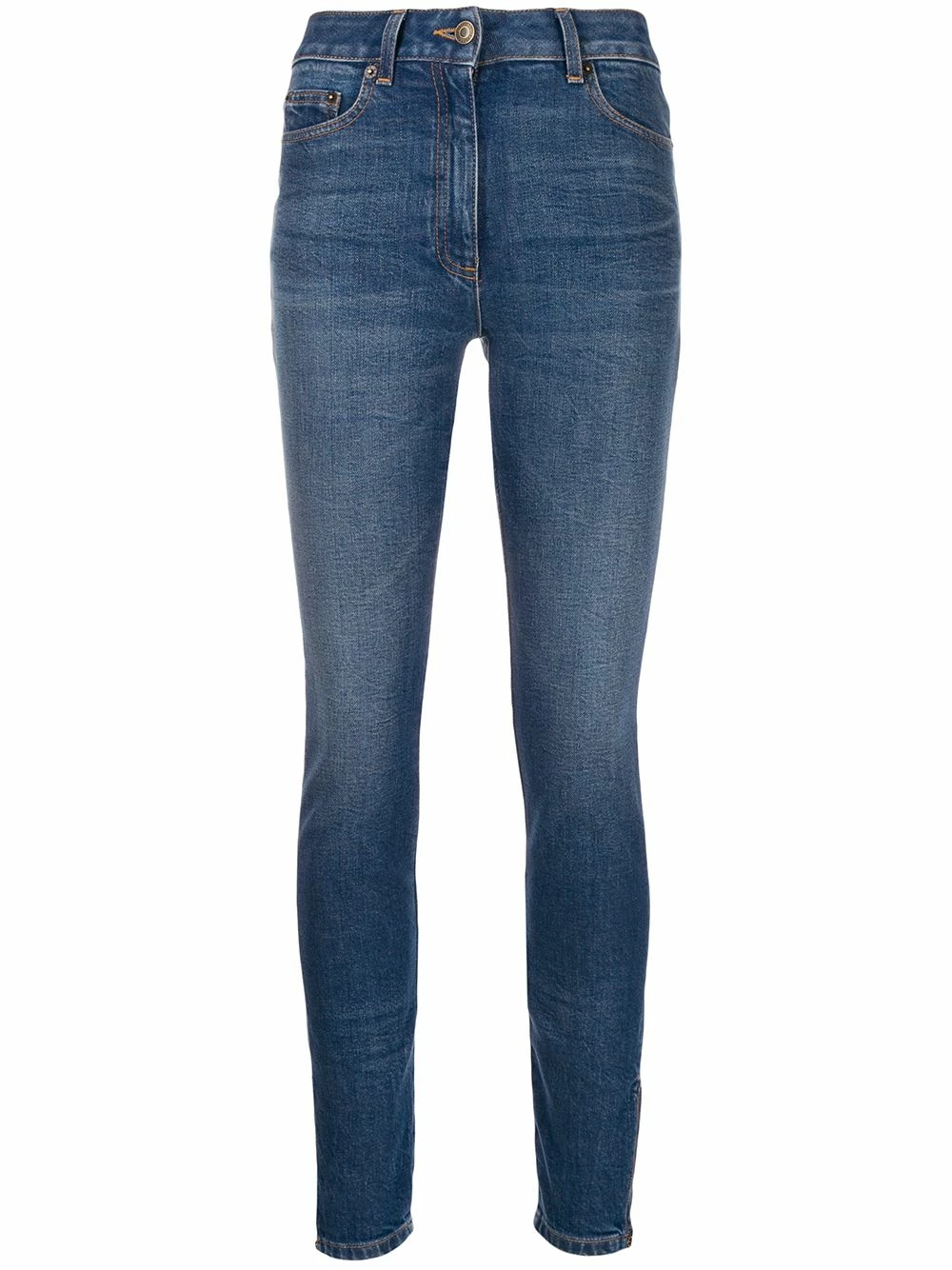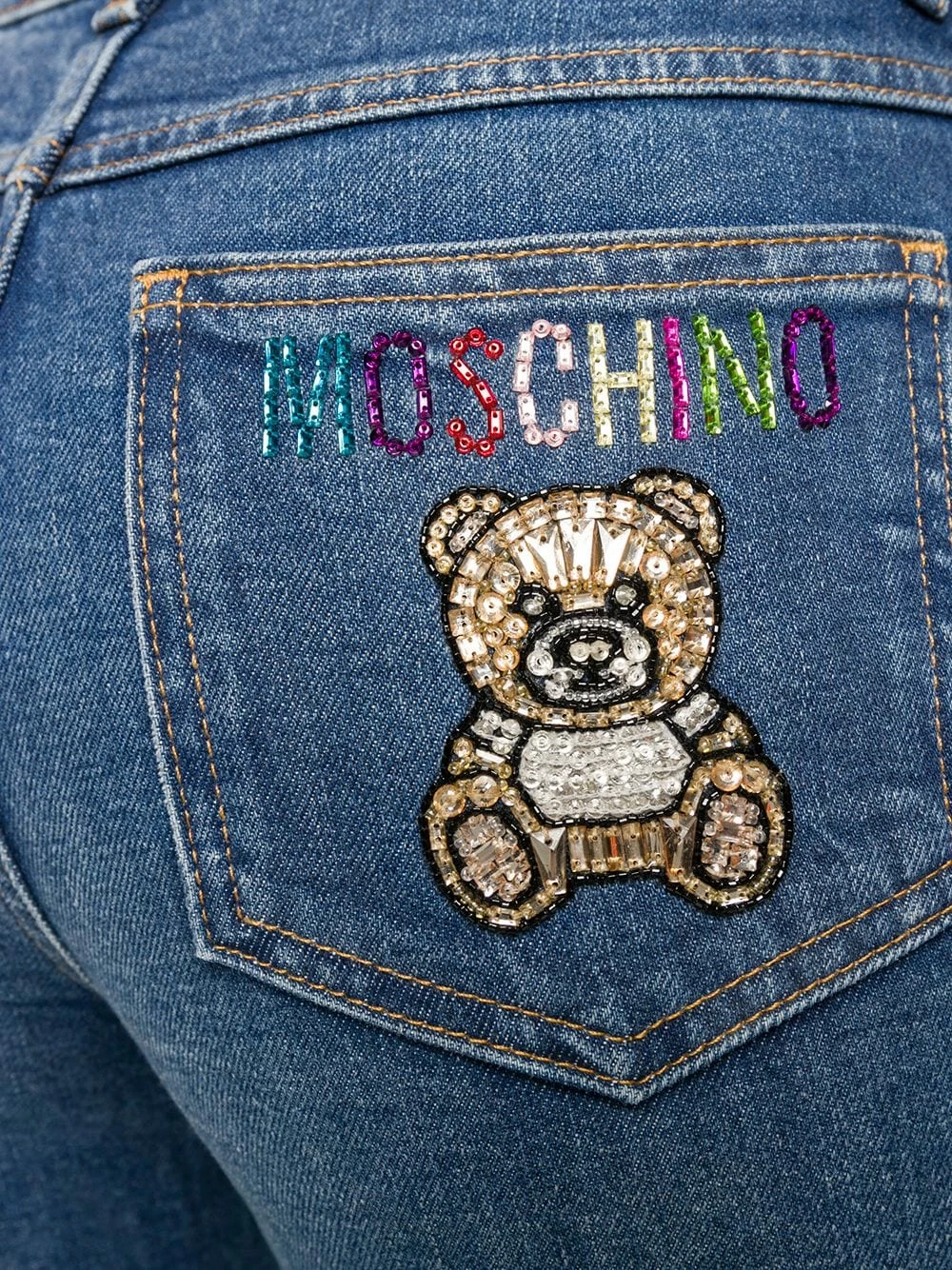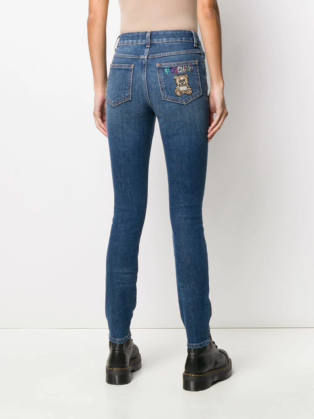 Upgrade your denim this season. Opt for these blue stretch cotton faded skinny jeans from Moschino. Look to the back for an extra surprise! Featuring a front button fastening, belt loops, a five pocket design and an embellished bear and logo to the back.