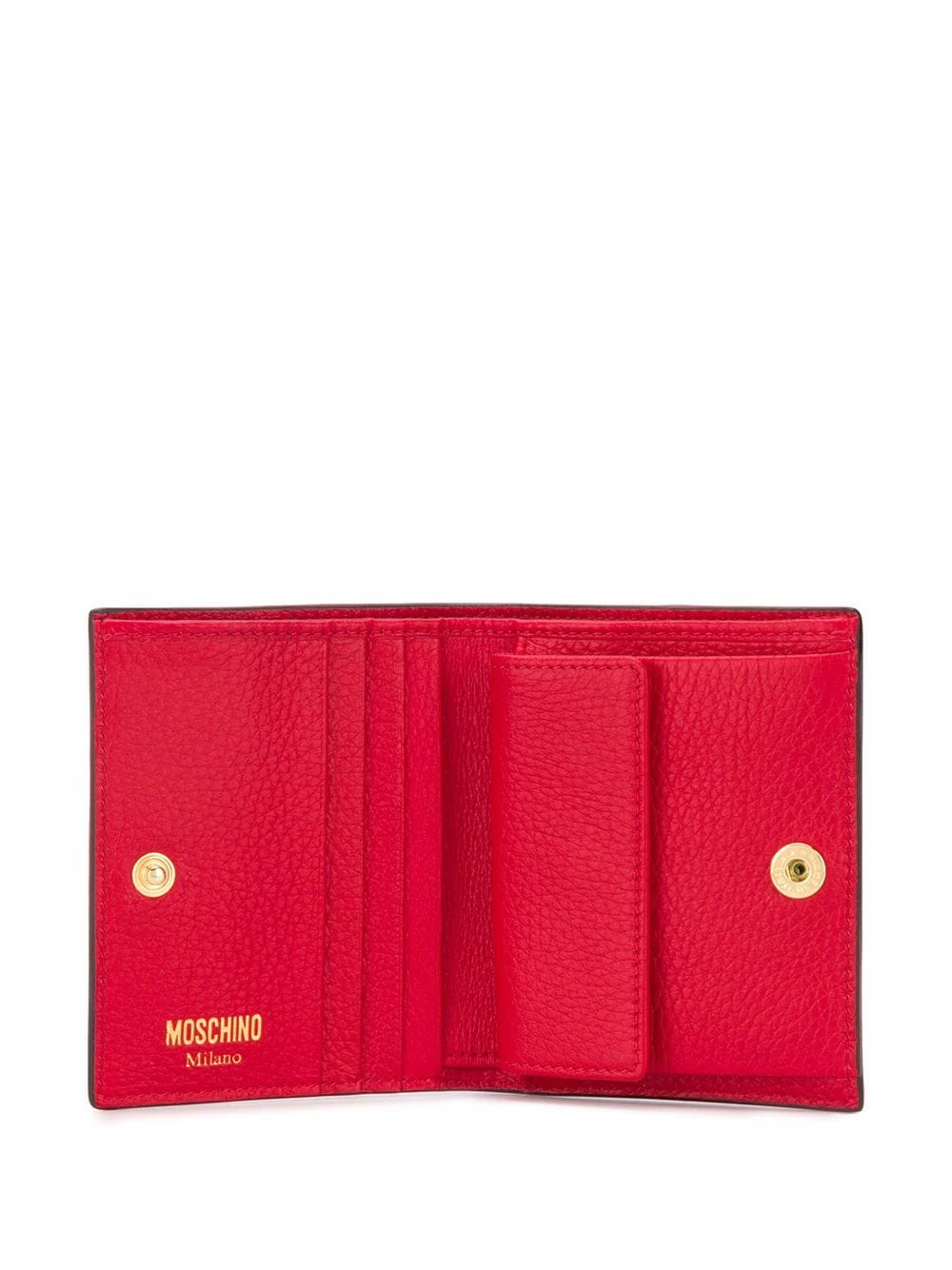 Carry your cards in style, Moschino style. This red leather wallet is exactly what you need for your four most important cards. We don’t need to spell it out for you, but we will: M-O-S-C-H-I-N-O. Featuring a gold-tone logo plaque, a snap fastening and multiple interior card slots.