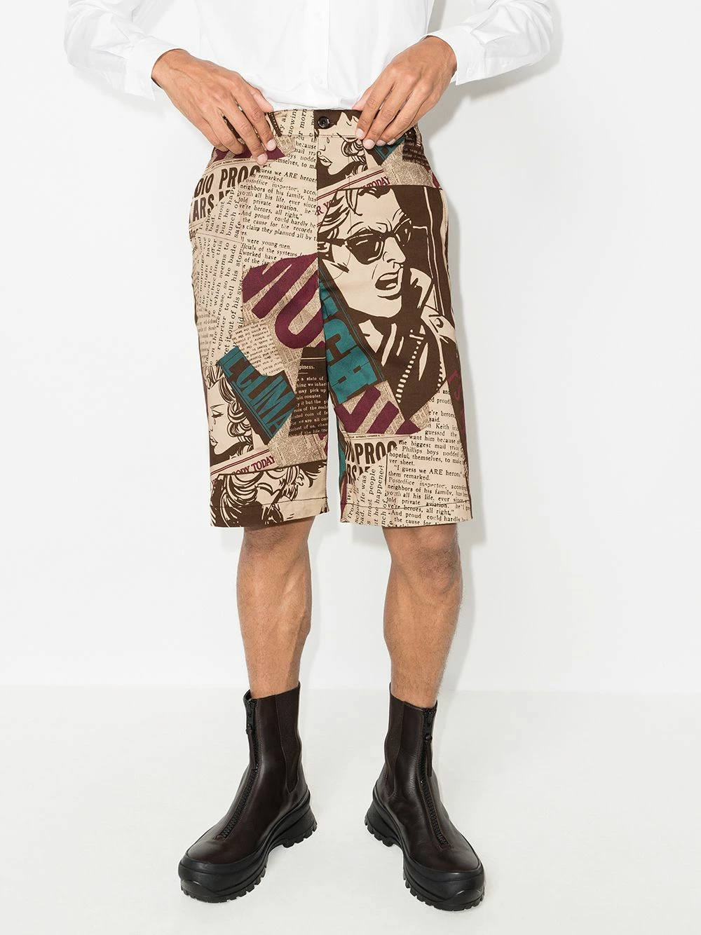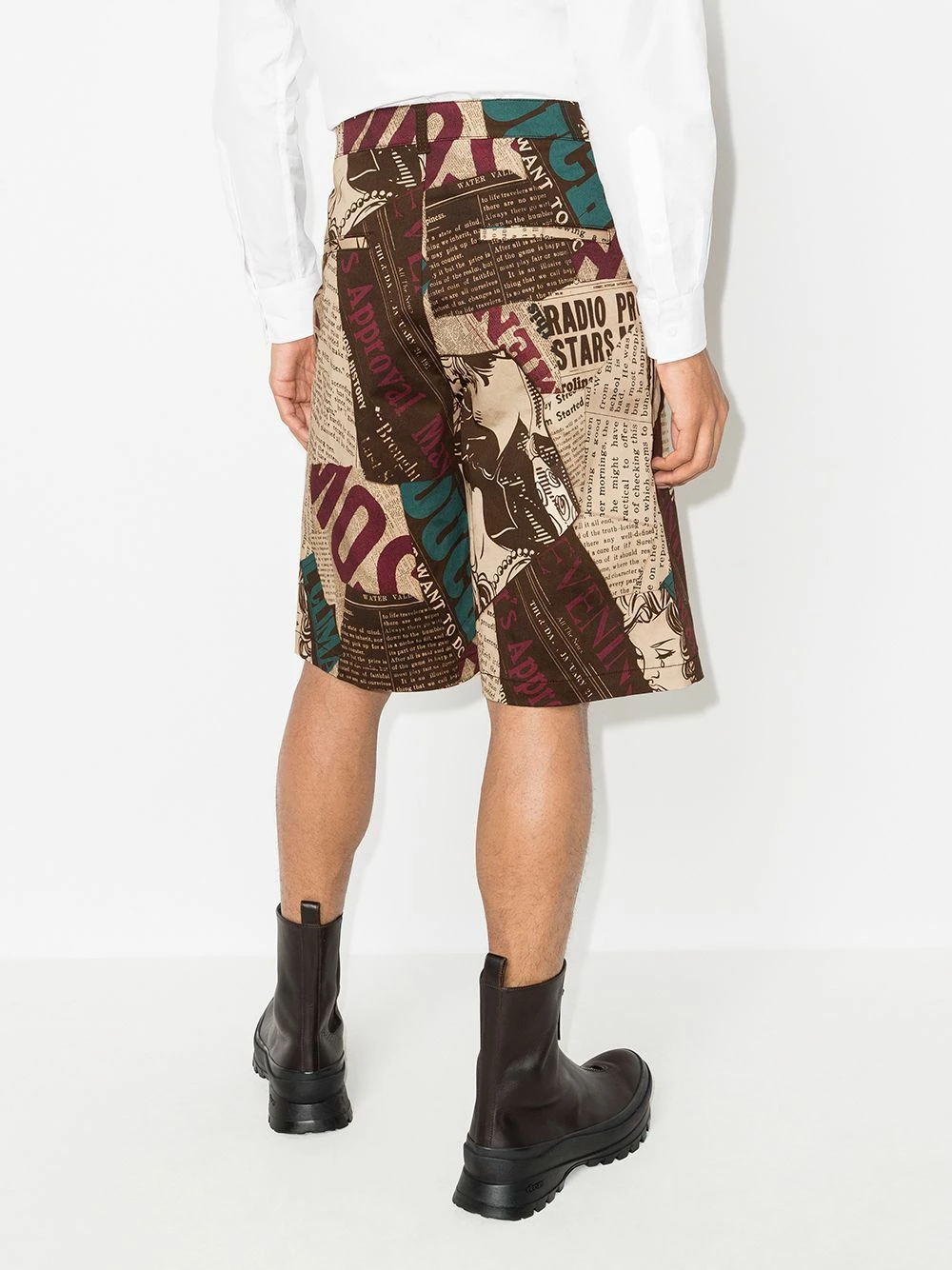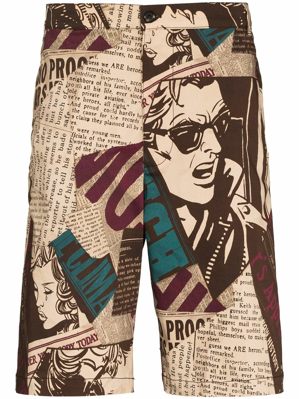 Evoking the house’s playful and unexpected aesthetic, these Bermuda shorts from Moschino’s AW21 collection boast a captivating newspaper print. Sitting high at the waist for an elongating silhouette, they are cut for a straight leg and fasten at the front with a button and zip fly.