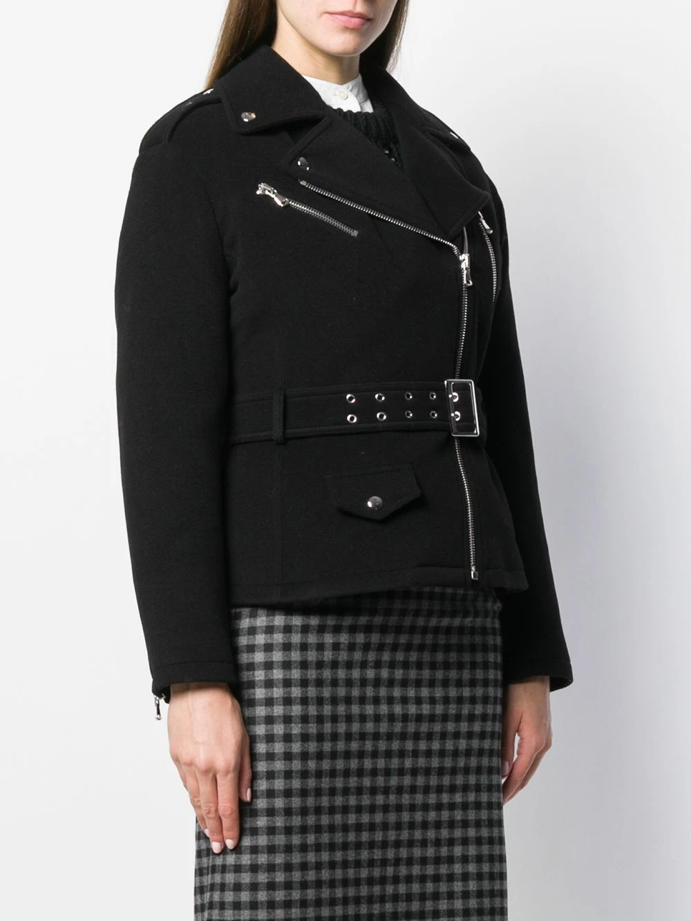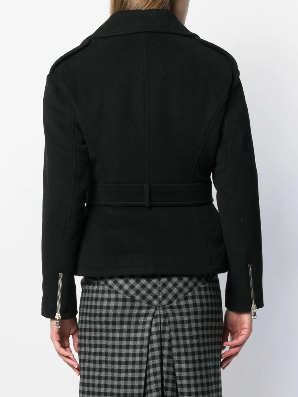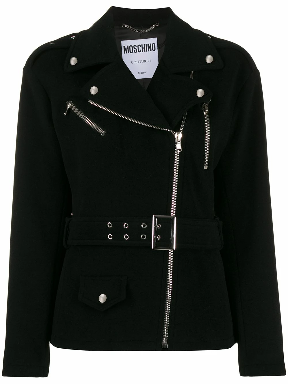 Is there anything greater than opening the door on a week day, and receiving that package you were dying to get? I agree, there’s nothing better. Made from a black virgin wool-cashmere blend, this off-centre zipped jacket from Moschino might just be arriving at your door in: 3, 2, 1… Ding-dong! Ding-dong! Guess what’s just arrived? Featuring a notched collar, a belted waist, long sleeves, zip cuffs, a straight hem and front pockets.